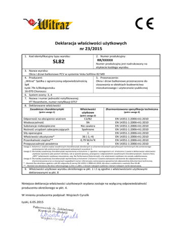 Deklaracja właściwości użytkowych nr 23/2015 1. Kod identyfikacyjny typu wyrobu: 2. Numer produkcyjny: SL82 RR/XXXXX Numer produkcyjny jest nadrukowany na etykiecie każdego wyrobu. 3. Nazwa wyrobu: Okna i drzwi balkonowe PCV w systemie Veka Softline 82 MD 4. Producent: 5. Przeznaczenie: „Witraż” Spółka z ograniczoną odpowiedzialnością Okna i drzwi balkonowe przeznaczone do SpK stosowania w obiektach budownictwa Łyski 79c k/Białegostoku mieszkaniowego i użyteczności publicznej 16-070 Choroszcz 6. System oceny: 3, 4 7. Nazwa i numer jednostki notyfikowanej: IFT Rosenheim, numer notyfikacji 0757 8. Deklarowane właściwości Zasadnicze charakterystyki Właściwości Zharmonizowana specyfikacja techniczna (patrz uwaga 1) (patrz uwaga 3) użytkowe Odporność na obciążenie wiatrem Wodoszczelność Substancje niebezpieczne Nośność urządzeń zabezpieczających Siły operacyjne Właściwości akustyczne* Przenikalność cieplna** Przepuszczalność powietrza (patrz uwaga 2) C2/B2 9A Nie zawiera Spełnione 1 36 (-1;-4) 0,79 W/m2K 4 EN 14351-1:2006+A1:2010 EN 14351-1:2006+A1:2010 EN 14351-1:2006+A1:2010 EN 14351-1:2006+A1:2010 EN 14351-1:2006+A1:2010 EN 14351-1:2006+A1:2010 EN 14351-1:2006+A1:2010 EN 14351-1:2006+A1:2010 Uwaga 1: Kolumna 1 zawiera wykaz zasadniczych charakterystyk określonych w scharmonizowanych specyfikacjach technicznych dla zamierzonego zastosowania lub zamierzonych zastosowań wskazanych w punkcie 5. Uwaga 2: Dla każdej zasadniczej charakterystyki wymienionej w kolumnie 1 i zgodnie z wymaganiami art. 6 kolumna 2 zawiera deklarowane właściwości użytkowe wyrażone jako poziom lub klasa, lub w sposób opisowy, powiązane z odpowiednimi zasadniczymi charakterystykami. Zawiera litery „NPD” (właściwości użytkowe nieustalone; ang. No Performance Determined), o ile właściwości użytkowe nie zostały zadeklarowane. Uwaga 3: Dla każdej zasadniczej charakterystyki wymienionej w kolumnie 1 kolumna 3 zawiera datowane odniesienie do odpowiedniej normy zharmonizowanej oraz w stosownych wypadkach numer referencyjny zastosowanej specjalnej lub odpowiedniej dokumentacji technicznej. * - Wartość Rw określona zgodnie z pkt B3 załącznika B normy EN 14351-1:2006+A1:2010, dla okna z oszkleniem o wartości Rw=36 dB ** - Wartość Uw określona dla okna referencyjnego 1,23m x 1,48m, z różnym rodzajem oszklenia i różnym rodzajem ramki dystansowej. 9. Właściwości użytkowe wyrobu określonego w pkt. 1 i 2 są zgodne z właściwościami użytkowymi deklarowanymi w pkt. 8 Niniejsza deklaracja właściwości użytkowych wydana zostaje na wyłączną odpowiedzialność producenta określonego w pkt. 4. W imieniu producenta podpisał: Wojciech Cyrulik Łyski, 6.05.2015