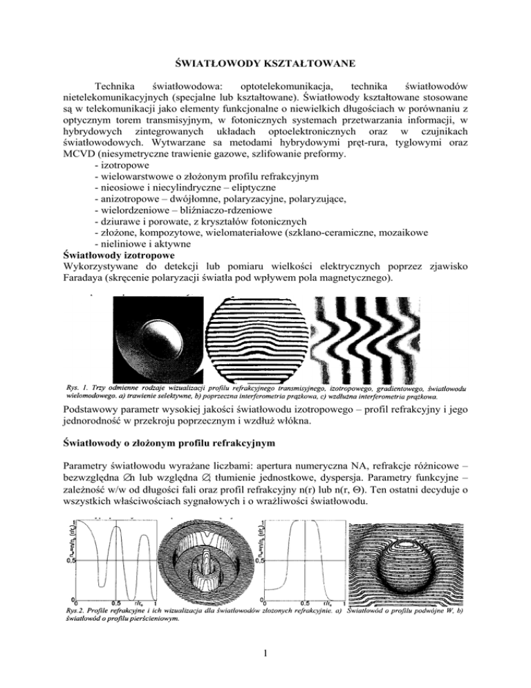 ŚWIATŁOWODY KSZTAŁTOWANE Technika światłowodowa: optotelekomunikacja, technika światłowodów nietelekomunikacyjnych (specjalne lub kształtowane). Światłowody kształtowane stosowane są w telekomunikacji jako elementy funkcjonalne o niewielkich długościach w porównaniu z optycznym torem transmisyjnym, w fotonicznych systemach przetwarzania informacji, w hybrydowych zintegrowanych układach optoelektronicznych oraz w czujnikach światłowodowych. Wytwarzane sa metodami hybrydowymi pręt-rura, tyglowymi oraz MCVD (niesymetryczne trawienie gazowe, szlifowanie preformy. - izotropowe - wielowarstwowe o złożonym profilu refrakcyjnym - nieosiowe i niecylindryczne – eliptyczne - anizotropowe – dwójłomne, polaryzacyjne, polaryzujące, - wielordzeniowe – bliźniaczo-rdzeniowe - dziurawe i porowate, z kryształów fotonicznych - złożone, kompozytowe, wielomateriałowe (szklano-ceramiczne, mozaikowe - nieliniowe i aktywne Światłowody izotropowe Wykorzystywane do detekcji lub pomiaru wielkości elektrycznych poprzez zjawisko Faradaya (skręcenie polaryzacji światła pod wpływem pola magnetycznego). Podstawowy parametr wysokiej jakości światłowodu izotropowego – profil refrakcyjny i jego jednorodność w przekroju poprzecznym i wzdłuż włókna. Światłowody o złożonym profilu refrakcyjnym Parametry światłowodu wyrażane liczbami: apertura numeryczna NA, refrakcje różnicowe – bezwzględna ∆n lub względna ∆, tłumienie jednostkowe, dyspersja. Parametry funkcyjne – zależność w/w od długości fali oraz profil refrakcyjny n(r) lub n(r, Θ). Ten ostatni decyduje o wszystkich właściwościach sygnałowych i o wrażliwości światłowodu. 1 Światłowody polaryzacyjne Anizotropowe, silnie dwójłomne o dwójłomności liniowej wprowadzonej do wnętrza światłowodu poprzez płaszczyznowy rozkład naprężeń (B=5*10-4, dB/dT=7[rad/m/oC], dB/dε=100[rad/mm]. Światłowody eliptyczne O naturalnej geometrycznej dwójłomności liniowej, wielomodowe i jednomodowe do światłowodowych czujników interferometrycznych. Utrzymają stała polaryzację poprzez separację stałych propagacji dwóch modów podstawowych. Światłowody dziurawe z amkrootworami i mikrootworami (porowate) Tworzony z pojedynczego materiału, a warunki propagacji ustalane są przez rozkłąd otworów oraz proporcje wymiarowe otwór-przerwa (fotoniczna przerwa zabroniona, lokalna zmiana efektywnego współczynnika załamania – mechanizmy propagacji fali w tym światłowodzie). 2 Światłowody nieliniowe Możliwość wykorzystania zjawisk nieliniowych w śwaitłowodzie do budowy: przesuwników, dzielników i mnożników częstotliwości, wzmacniaczy ramanowskich, elementów nieodwracalnych itp. 3 Światłowody aktywne i dużej mocy Domieszkowane jonami ziem rzadkich Wzmacniacze EDFA, TDFA, PDFA. o zastosowaniach telekomunikacyjnych. Światłowody Braggowskie Przeznaczone do systemów telekomunikacyjnych. Z siatką Bragga – bezstratne zwierciadło dla długości fali λ1. 4 Światłowody przewężane Światłowody o zmiennej wzdłuż włókna aperturze i profilu refrakcyjnym – sprzęgacz, czujnik z polem zanikającym Światłowody plastikowe Wielomodowe, gradientowe – bardziej elastyczne od szklanych, inny sposób łączenia i zestawiania, do celów obrazowodowych, czujnikowych, nieliniowych i transmisyjnych na niewielkie odległości. Z PMMA – polimetakrylanu akrylu, FP – fluoropolimerów i PS – polistyrenu. Światłowody uczulane technologicznie Np. o płaszczu czułym na oddziaływanie pola elektrycznego. 5 Światłowody wielordzeniowe Interferencja fali pomiędzy rdzeniami, multipleksowanie sygnału pomiędzy rdzeniami oraz transmisja wielokanałowa. Na podstawie: R.S. Romaniuk, „Światłowody kształtowane” 6