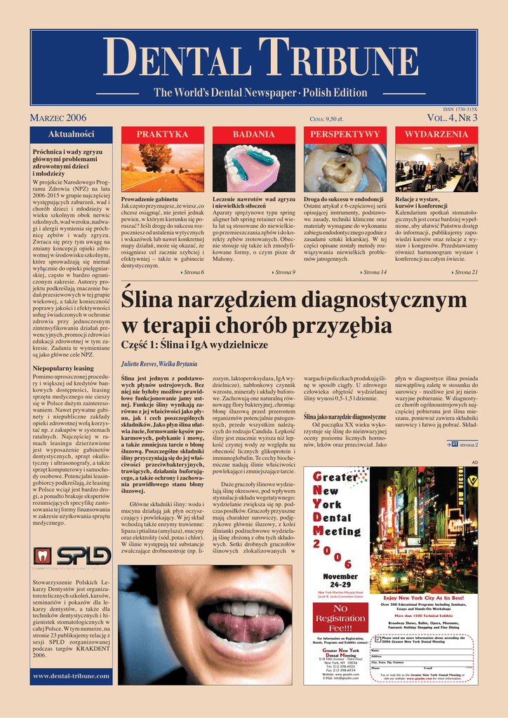 DENTAL TRIBUNE The World’s Dental Newspaper · Polish Edition ISSN 1730-315X MARZEC 2006 Aktualności VOL. 4, NR 3 CENA: 9,50 zł. PRAKTYKA BADANIA PERSPEKTYWY WYDARZENIA Prowadzenie gabinetu Jak często przyznajesz, że wiesz, co chcesz osiągnąć, nie jesteś jednak pewien, w którym kierunku się poruszać? Jeśli drogę do sukcesu rozpoczniesz od ustalenia wytycznych i wskazówek lub nawet konkretnej mapy działań, może się okazać, że osiągniesz cel zacznie szybciej i efektywniej – także w gabinecie dentystycznym. Strona 6 Leczenie nawrotów wad zgryzu i niewielkich stłoczeń Aparaty sprężynowe typu spring aligner lub spring retainer od wielu lat są stosowane do niewielkiego przemieszczania zębów i do korekty zębów zrotowanych. Obecnie stosuje się także ich zmodyfikowane formy, o czym pisze dr Mahony. Droga do sukcesu w endodoncji Ostatni artykuł z 6-częściowej serii opisującej instrumenty, podstawowe zasady, techniki kliniczne oraz materiały wymagane do wykonania zabiegu endodontycznego zgodnie z zasadami sztuki lekarskiej. W tej części opisane zostały metody rozwiązywania niewielkich problemów jatrogennych. Relacje z wystaw, kursów i konferencji Kalendarium spotkań stomatologicznych jest coraz bardziej wypełnione, aby ułatwić Państwu dostęp do informacji, publikujemy zapowiedzi kursów oraz relacje z wystaw i kongresów. Przedstawiamy również harmonogram wystaw i konferencji na całym świecie. Strona 9 Strona 14 Strona 21 Próchnica i wady zgryzu głównymi problemami zdrowotnymi dzieci i młodzieży W projekcie Narodowego Programu Zdrowia (NPZ) na lata 2006-2015 w grupie najczęściej występujących zaburzeń, wad i chorób dzieci i młodzieży w wieku szkolnym obok nerwic szkolnych, wad wzroku, nadwagi i alergii wymienia się próchnicę zębów i wady zgryzu. Zwraca się przy tym uwagę na zmiany koncepcji opieki zdrowotnej w środowisku szkolnym, które sprowadzają się niemal wyłącznie do opieki pielęgniarskiej, często w bardzo ograniczonym zakresie. Autorzy projektu podkreślają znaczenie badań przesiewowych w tej grupie wiekowej, a także konieczność poprawy jakości i efektywności usług świadczonych w ochronie zdrowia przy jednoczesnym zintensyfikowaniu działań prewencyjnych, promocji zdrowia i edukacji zdrowotnej w tym zakresie. Zadania te wymieniane są jako główne cele NPZ. Niepopularny leasing Pomimo uproszczonej procedury i większej od kredytów bankowych dostępności, leasing sprzętu medycznego nie cieszy się w Polsce dużym zainteresowaniem. Nawet prywatne gabinety i niepubliczne zakłady opieki zdrowotnej wolą korzystać np. z zakupów w systemach ratalnych. Najczęściej w ramach leasingu dzierżawione jest wyposażenie gabinetów dentystycznych, sprzęt okulistyczny i ultrasonografy, a także sprzęt komputerowy i samochody osobowe. Potencjalni leasingobiorcy podkreślają, że leasing w Polsce wciąż jest bardzo drogi, a ponadto brakuje ekspertów rozumiejących specyfikę zastosowania tej formy finansowania w zakresie użytkowania sprzętu medycznego. Stowarzyszenie Polskich Lekarzy Dentystów jest organizatorem licznych szkoleń, kursów, seminariów i pokazów dla lekarzy dentystów, a także dla techników dentystycznych i higienistek stomatologicznych w całej Polsce. W tym numerze, na stronie 23 publikujemy relację z sesji SPLD zorganizowanej podczas targów KRAKDENT 2006. www.dental-tribune.com Ślina narzędziem diagnostycznym w terapii chorób przyzębia Część 1: Ślina i IgA wydzielnicze Juliette Reeves, Wielka Brytania Ślina jest jednym z podstawowych płynów ustrojowych. Bez niej nie byłoby możliwe prawidłowe funkcjonowanie jamy ustnej. Funkcje śliny wynikają zarówno z jej właściwości jako płynu, jak i cech poszczególnych składników. Jako płyn ślina ułatwia żucie, formowanie kęsów pokarmowych, połykanie i mowę, a także zmniejsza tarcie o błonę śluzową. Poszczególne składniki śliny przyczyniają się do jej właściwości przeciwbakteryjnych, trawiących, działania buforującego, a także ochrony i zachowania prawidłowego stanu błony śluzowej. Główne składniki śliny: woda i mucyna działają jak płyn oczyszczający i powlekający. W jej skład wchodzą także enzymy trawienne: lipaza i ptialina (amylaza), mucyny oraz elektrolity (sód, potas i chlor). W ślinie występują też substancje zwalczające drobnoustroje (np. li- zozym, laktoperoksydaza, IgA wydzielnicze), nabłonkowy czynnik wzrostu, minerały i układy buforowe. Zachowują one naturalną równowagę flory bakteryjnej, chroniąc błonę śluzową przed przerostem organizmów potencjalnie patogennych, przede wszystkim należących do rodzaju Candida. Lepkość śliny jest znacznie wyższa niż lepkość czystej wody ze względu na obecność licznych glikoprotein i immunoglobulin. Te cechy biochemiczne nadają ślinie właściwości powlekające i zmniejszające tarcie. Duże gruczoły ślinowe wydzielają ślinę okresowo, pod wpływem stymulacji układu wegetatywnego: wydzielanie zwiększa się np. podczas posiłków. Gruczoły przyuszne mają charakter surowiczy, podjęzykowe głównie śluzowy, z kolei ślinianki podżuchwowe wydzielają ślinę złożoną z obu tych składowych. Setki drobnych gruczołów ślinowych zlokalizowanych w wargach i policzkach produkują ślinę w sposób ciągły. U zdrowego człowieka objętość wydzielanej śliny wynosi 0,5-1,5 l dziennie. Ślina jako narzędzie diagnostyczne Od początku XX wieku wykorzystuje się ślinę do nieinwazyjnej oceny poziomu licznych hormonów, leków oraz przeciwciał. Jako płyn w diagnostyce ślina posiada niewątpliwą zaletę w stosunku do surowicy - możliwe jest jej nieinwazyjne pobieranie. W diagnostyce chorób ogólnoustrojowych najczęściej pobierana jest ślina mieszana, ponieważ zawiera składniki surowicy i łatwo ją pobrać. Skład DT strona 2 AD * UHDWHU 1 HZ < RUN ' HQWDO 0 HHWLQJ 1RYHPEHU 0GY;QTM/CTT