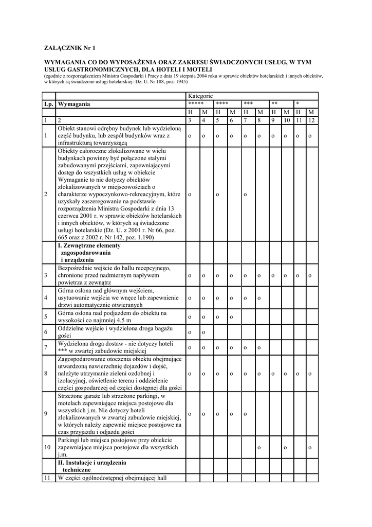 ZAŁĄCZNIK Nr 1 WYMAGANIA CO DO WYPOSAŻENIA ORAZ ZAKRESU ŚWIADCZONYCH USŁUG, W TYM USŁUG GASTRONOMICZNYCH, DLA HOTELI I MOTELI (zgodnie z rozporządzeniem Ministra Gospodarki i Pracy z dnia 19 sierpnia 2004 roku w sprawie obiektów hotelarskich i innych obiektów, w których są świadczone usługi hotelarskiej- Dz. U. Nr 188, poz. 1945) Lp. Wymagania 1 1 2 3 4 5 6 7 8 9 10 11 2 Obiekt stanowi odrębny budynek lub wydzieloną część budynku, lub zespół budynków wraz z infrastrukturą towarzyszącą Obiekty całoroczne zlokalizowane w wielu budynkach powinny być połączone stałymi zabudowanymi przejściami, zapewniającymi dostęp do wszystkich usług w obiekcie Wymaganie to nie dotyczy obiektów zlokalizowanych w miejscowościach o charakterze wypoczynkowo-rekreacyjnym, które uzyskały zaszeregowanie na podstawie rozporządzenia Ministra Gospodarki z dnia 13 czerwca 2001 r. w sprawie obiektów hotelarskich i innych obiektów, w których są świadczone usługi hotelarskie (Dz. U. z 2001 r. Nr 66, poz. 665 oraz z 2002 r. Nr 142, poz. 1.190) I. Zewnętrzne elementy zagospodarowania i urządzenia Bezpośrednie wejście do hallu recepcyjnego, chronione przed nadmiernym napływem powietrza z zewnątrz Górna osłona nad głównym wejściem, usytuowanie wejścia we wnęce lub zapewnienie drzwi automatycznie otwieranych Górna osłona nad podjazdem do obiektu na wysokości co najmniej 4,5 m Oddzielne wejście i wydzielona droga bagażu gości Wydzielona droga dostaw - nie dotyczy hoteli *** w zwartej zabudowie miejskiej Zagospodarowanie otoczenia obiektu obejmujące utwardzoną nawierzchnię dojazdów i dojść, należyte utrzymanie zieleni ozdobnej i izolacyjnej, oświetlenie terenu i oddzielenie części gospodarczej od części dostępnej dla gości Strzeżone garaże lub strzeżone parkingi, w motelach zapewniające miejsca postojowe dla wszystkich j.m. Nie dotyczy hoteli zlokalizowanych w zwartej zabudowie miejskiej, w których należy zapewnić miejsce postojowe na czas przyjazdu i odjazdu gości Parkingi lub miejsca postojowe przy obiekcie zapewniające miejsca postojowe dla wszystkich j.m. II. Instalacje i urządzenia techniczne W części ogólnodostępnej obejmującej hall Kategorie ***** **** H M H M 3 4 5 6 *** H M 7 8 ** * H M H M 9 10 11 12 o o o o o o o o o o o o o o o o o o o o o o o o o o o o o o o o o o o o o o o o o o o o o o o o o o o o o o o o o o o 12 13 14 15 16 17 18 19 20 21 recepcyjny, sale gastronomiczne i wielofunkcyjne: 1) klimatyzacja lub inne urządzenia i systemy zapewniające wymianę powietrza i utrzymanie temperatury 18 - 21° oraz wilgotność 45-60% 2) wentylacja mechaniczna 1) 3) wentylacja grawitacyjna lub mechaniczna - nie dotyczy hoteli, w odniesieniu do których obowiązujące przepisy w okresie dopuszczania do użytkowania nie wymagały spełnienia ww. wymagań* * potwierdza się następującymi dokumentami: decyzją o pozwoleniu na użytkowanie obiektu lub decyzją o pozwoleniu na zmianę sposobu użytkowania obiektu, a w przypadku obiektów wzniesionych przed 1.04.1995 r., które utraciły wymienione dokumenty, także opinią rzeczoznawcy budowlanego stwierdzającą bezpieczeństwo obiektu W części pobytowej - j.m.: 1)klimatyzacja lub inne urządzenia i systemy zapewniające wymianę powietrza i utrzymanie temperatury 18-21 °C, wilgotność 45-60% 2) wentylacja grawitacyjna lub mechaniczna - nie dotyczy hoteli, w odniesieniu do których obowiązujące przepisy w okresie dopuszczania do użytkowania nie wymagały spełnienia ww. wymagań* Wentylacja mechaniczna wyciągowa w w.h.s. dla ** i * dopuszcza się wentylację grawitacyjną, przy centralnym zaopatrzeniu w ciepłą wodę, w w.h.s. z oknem lub przy kubaturze kabin ustępowych przekraczającej 6,5 m3 Ogrzewanie w całym obiekcie lub w części nieklimatyzowanej Instalacja sanitarna: zimna i ciepła woda przez całą dobę Komfort akustyczny w całym obiekcie zgodnie z Polską Normą Oświetlenie dostosowane do charakteru pomieszczeń Telefon i faks dostępny dla gości w recepcji Dostęp do internetu w pokojach lub na odrębnych stanowiskach Instalacja radiowo-telewizyjna przystosowana do odbioru programów lokalnych i satelitarnych Dźwigi osobowe /ew. schody ruchome/ w obiektach: 1) poniżej kondygnacji O, o ile są tam usytuowane pomieszczenia usługowe (np. garaże, zespół odnowy biologicznej) 2) powyżej 1 kondygnacji w części przeznaczonej dla gości o o o o o o o o o o o o o o o o o o o o o o o o o o o o o o o o o o o o o o o o o o o o o o o o o o o o o o o o o o o o o o o o o o o o o o o o o o o o o o o o o o o o o o o o o o o o o o o o 22 23 24 25 26 3) powyżej 2 kondygnacji w części przeznaczonej dla gości 4) powyżej 3 kondygnacji w części przeznaczonej dla gości 5) powyżej 4 kondygnacji w części przeznaczonej dla gości Oddzielny dźwig towarowo-osobowy, o ile wymagany jest dźwig osobowy Dwustronne zasilanie energetyczne lub awaryjny agregat prądotwórczy w obiektach powyżej: 1) 150 j.m. 2) 200 j.m. 3) 300 j.m. III. Podstawowe elementy dotyczące funkcji, programu obsługowego i użytkowości obiektu Hall recepcyjny wielofunkcyjny: 1) o powierzchni minimum (w m2) do 50j.m. 2) o powierzchni dodatkowej (w m2) dla każdej j.m. powyżej 50 Zespół higieniczno-sanitarny przy części ogólnodostępnej Wyposażenie minimum: 1) umywalki z blatem lub półką 2) lustro nad każdą umywalką, z górnym lub bocznym oświetleniem 3) dozownik do płynnego mydła 4) pojemnik na papier i odpady 5) suszarka do rąk lub ręczniki jednorazowego użytku 6) wieszaki ścienne 7) WC ( w obiektach kategorii *****, **** i *** - oddzielne dla kobiet i mężczyzn) 8) pisuar w WC męskim IV. Część mieszkalna Powierzchnia mieszkalna pokoju w m2 (nie obejmuje wyodrębnionych w.h.s., przedpokojów, aneksów barowych, loggii itp.): 1) pokój 1-osobowy 2) pokój 2-osobowy 3) pokój 3-osobowy 4) pokój 4-osobowy 5) pokój większy niż 4-osobowy - powierzchnia 4- osobowego plus 