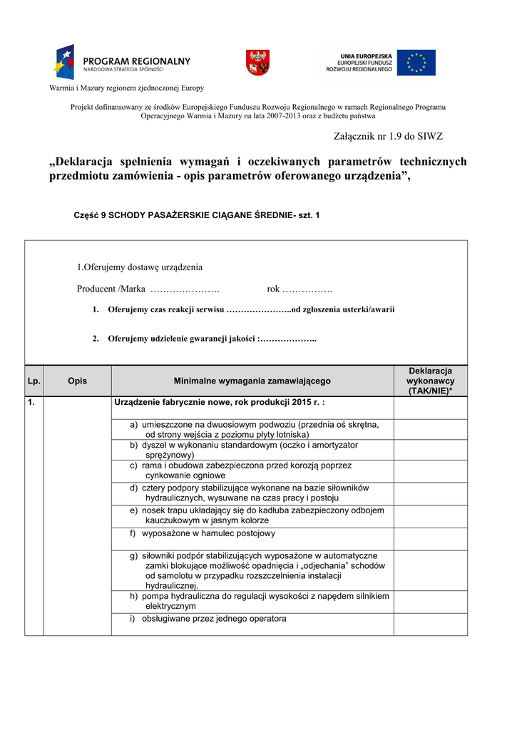 Warmia i Mazury regionem zjednoczonej Europy Projekt dofinansowany ze środków Europejskiego Funduszu Rozwoju Regionalnego w ramach Regionalnego Programu Operacyjnego Warmia i Mazury na lata 2007-2013 oraz z budżetu państwa Załącznik nr 1.9 do SIWZ „Deklaracja spełnienia wymagań i oczekiwanych parametrów technicznych przedmiotu zamówienia - opis parametrów oferowanego urządzenia”, Część 9 SCHODY PASAŻERSKIE CIĄGANE ŚREDNIE- szt. 1 1.Oferujemy dostawę urządzenia Producent /Marka …………………. Lp. 1. Opis rok ……………. 1. Oferujemy czas reakcji serwisu …………………..od zgłoszenia usterki/awarii 2. Oferujemy udzielenie gwarancji jakości :……………….. Minimalne wymagania zamawiającego Urządzenie fabrycznie nowe, rok produkcji 2015 r. : a) umieszczone na dwuosiowym podwoziu (przednia oś skrętna, od strony wejścia z poziomu płyty lotniska) b) dyszel w wykonaniu standardowym (oczko i amortyzator sprężynowy) c) rama i obudowa zabezpieczona przed korozją poprzez cynkowanie ogniowe d) cztery podpory stabilizujące wykonane na bazie siłowników hydraulicznych, wysuwane na czas pracy i postoju e) nosek trapu układający się do kadłuba zabezpieczony odbojem kauczukowym w jasnym kolorze f) wyposażone w hamulec postojowy g) siłowniki podpór stabilizujących wyposażone w automatyczne zamki blokujące możliwość opadnięcia i „odjechania” schodów od samolotu w przypadku rozszczelnienia instalacji hydraulicznej. h) pompa hydrauliczna do regulacji wysokości z napędem silnikiem elektrycznym i) obsługiwane przez jednego operatora Deklaracja wykonawcy (TAK/NIE)* Warmia i Mazury regionem zjednoczonej Europy Projekt dofinansowany ze środków Europejskiego Funduszu Rozwoju Regionalnego w ramach Regionalnego Programu Operacyjnego Warmia i Mazury na lata 2007-2013 oraz z budżetu państwa j) wyrób będzie wyposażony w blokady postojowe kół lub wyposażenie podobne, k) wyrób będzie wyposażony w koło zapasowe jezdne, l) pulpity sterujące precyzyjnym pozycjonowaniem schodów względem drzwi i kadłuba samolotu dostępne zarówno z poziomu gruntu jak i z trapu m) trap i platforma wyposażony w oświetlenie ze strumieniem rozproszonym o natężeniu nie mniejszym niż (50 lx), n) trepy stopni wykonane z perforowanego profilu aluminiowego o przeciwślizgowej zewnętrznej strukturze lub z blachy aluminiowej, łezkowej przeciwpoślizgowej o) Poręcze - uchwyty ciągu schodowego i poręcze burt pomostu wykonane z płaskownika stalowego pokrytego plastikową okładziną poręczową w kolorze jasnym. p) Wyposażenie w światła odblaskowe antykolizyjne, czerwone tył, białe przód, odblaskowe obrysowe pomarańczowe, boki i burty pomostu. Dodatkowo elementy wychodzące po za obrys ramy schodów oznakowane za pomocą odblaskowej taśmy czarnożółtej Ogólne: a) możliwość pracy w temperaturach od -30°C do +45ºC, b) światło antykolizyjne odblaskowe przód i tył, oraz wymagane oświetlenie, c) Producent gwarantuje, że wyrób nie generuje zakłóceń radiowych i spełnia odpowiednie normy dotyczące ochrony środowiska naturalnego d) Zostaną naniesione w sposób trwały, według wzoru dostarczonego przez zamawiającego logo i napisy identyfikujące użytkownika e) Komplet kluczy i narzędzi serwisowych jeśli instrukcja obsługi bieżącej przewiduje ich stosowanie f) standard i kolor pokrycia lakierniczego urządzenia RAL 9016 2. Wymagane normy i certyfikaty a) certyfikat CE b) zgodne z IATA AHM 920 (aktualne wydanie), c) zgodnie z normą PN-EN 12312-1, PN-EN 1915-1 i PN-EN ISO 12100:2012 d) Producent gwarantuje spełnienie wymagań homologacyjnych i/lub przepisów dozoru technicznego (jeżeli jest to wymagane) 3. Przeznaczenie a) b) c) d) A320, A319, A318 B 737-300/400/500/800/900 CRJ-700 E170/175, E190/195 Warmia i Mazury regionem zjednoczonej Europy Projekt dofinansowany ze środków Europejskiego Funduszu Rozwoju Regionalnego w ramach Regionalnego Programu Operacyjnego Warmia i Mazury na lata 2007-2013 oraz z budżetu państwa 4. Dane techniczne a) zakres roboczy operacyjny minimalny: 2400 mm do 3800 mm b) dopuszczalne obciążenia podestu 480 kg, pomost podnoszony przez siłownik hydrauliczny sterowany pompą hydrauliczną o napędzie elektrycznym d) zabezpieczenie schodów podczas pracy jak i postoju poprzez układ mechaniczno-hydraulicznych stabilizatorów e) dyszel w wykonaniu standardowym przewidzianym do podczepiania ciągników lotniskowych, chowany na czas pracy schodów f) stabilność przy obciążeniach wiatrowych 75 km/godz. c) g) prędkość trakcyjna holowania nie mniej niż 20 km/h h) pomost jak i burty przesuwane wyposażone w odbój ochronny niebrudzący burty boczne górne przesuwane z blokadą położenia i) schody wyposażone w pasy bezpieczeństwa na wejściu jak i pomoście k) wejście na ciąg schodowy i wejście na pomost wyposażone w automatycznie zwijane, odgradzające, pasy ostrzegawcze w kolorach czarno-żółtych. l) koła gumowe pełne lub pneumatyczne uznanego producenta j) m) szerokość podestu nie mniej niż 1250 mm, długość minimum 1450 mm n) szerokość ciągu schodowego od 1050mm 5. a) Gwarancja minimalny okres 24 miesiące, Gwarancja, serwis dokumentacja. b) Reakcja serwisu gwarancyjnego/pogwarancyjnego w czasie max 48 godzin od daty zgłoszenia, c) 6. Warunki Dostawy całodobowy kontakt telefoniczny z serwisem, DAP zgodnie z zasadami INCOTERMS 2010 * - należy wpisać: TAK – jeżeli oferowane urządzenie spełnia oczekiwane parametry NIE – jeżeli oferowane urządzenie nie spełnia oczekiwanych parametrów Warmia i Mazury regionem zjednoczonej Europy Projekt dofinansowany ze środków Europejskiego Funduszu Rozwoju Regionalnego w ramach Regionalnego Programu Operacyjnego Warmia i Mazury na lata 2007-2013 oraz z budżetu państwa Jeżeli oferowane urządzenie posiada inne parametry od oczekiwanych, wówczas należy wpisać rzeczywistą wartość parametru w kolumnie rzeczywis