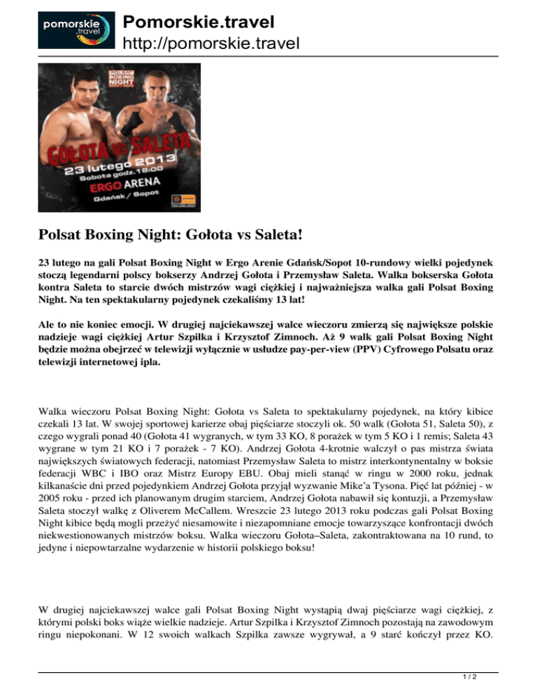 Pomorskie.travel http://pomorskie.travel Polsat Boxing Night: Gołota vs Saleta! 23 lutego na gali Polsat Boxing Night w Ergo Arenie Gdańsk/Sopot 10-rundowy wielki pojedynek stoczą legendarni polscy bokserzy Andrzej Gołota i Przemysław Saleta. Walka bokserska Gołota kontra Saleta to starcie dwóch mistrzów wagi ciężkiej i najważniejsza walka gali Polsat Boxing Night. Na ten spektakularny pojedynek czekaliśmy 13 lat! Ale to nie koniec emocji. W drugiej najciekawszej walce wieczoru zmierzą się największe polskie nadzieje wagi ciężkiej Artur Szpilka i Krzysztof Zimnoch. Aż 9 walk gali Polsat Boxing Night będzie można obejrzeć w telewizji wyłącznie w usłudze pay-per-view (PPV) Cyfrowego Polsatu oraz telewizji internetowej ipla. Walka wieczoru Polsat Boxing Night: Gołota vs Saleta to spektakularny pojedynek, na który kibice czekali 13 lat. W swojej sportowej karierze obaj pięściarze stoczyli ok. 50 walk (Gołota 51, Saleta 50), z czego wygrali ponad 40 (Gołota 41 wygranych, w tym 33 KO, 8 porażek w tym 5 KO i 1 remis; Saleta 43 wygrane w tym 21 KO i 7 porażek - 7 KO). Andrzej Gołota 4-krotnie walczył o pas mistrza świata największych światowych federacji, natomiast Przemysław Saleta to mistrz interkontynentalny w boksie federacji WBC i IBO oraz Mistrz Europy EBU. Obaj mieli stanąć w ringu w 2000 roku, jednak kilkanaście dni przed pojedynkiem Andrzej Gołota przyjął wyzwanie Mike’a Tysona. Pięć lat później - w 2005 roku - przed ich planowanym drugim starciem, Andrzej Gołota nabawił się kontuzji, a Przemysław Saleta stoczył walkę z Oliverem McCallem. Wreszcie 23 lutego 2013 roku podczas gali Polsat Boxing Night kibice będą mogli przeżyć niesamowite i niezapomniane emocje towarzyszące konfrontacji dwóch niekwestionowanych mistrzów boksu. Walka wieczoru Gołota–Saleta, zakontraktowana na 10 rund, to jedyne i niepowtarzalne wydarzenie w historii polskiego boksu! W drugiej najciekawszej walce gali Polsat Boxing Night wystąpią dwaj pięściarze wagi ciężkiej, z którymi polski boks wiąże wielkie nadzieje. Artur Szpilka i Krzysztof Zimnoch pozostają na zawodowym ringu niepokonani. W 12 swoich walkach Szpilka zawsze wygrywał, a 9 starć kończył przez KO. 1/2 Pomorskie.travel http://pomorskie.travel Krzysztof Zimnoch walczył do tej pory 14 razy, 13 pojedynków wygrał (10 KO), a jeden zakończył się remisem. Dodatkowego smaczku tej walce dodaje fakt, że w czasie kiedy obaj walczyli w grupie amatorów, Zimnoch wygrał ze Szpilką. Artur Szpilka zapowiada, że zakończy karierę Zimnocha, ten ostatni, że ponownie znokautuje rywala. Podczas gali Polsat Boxing Night dowiemy się, który z nich przegra po raz pierwszy na zawodowym ringu. PCIT 2/2 Powered by TCPDF (www.tcpdf.org)