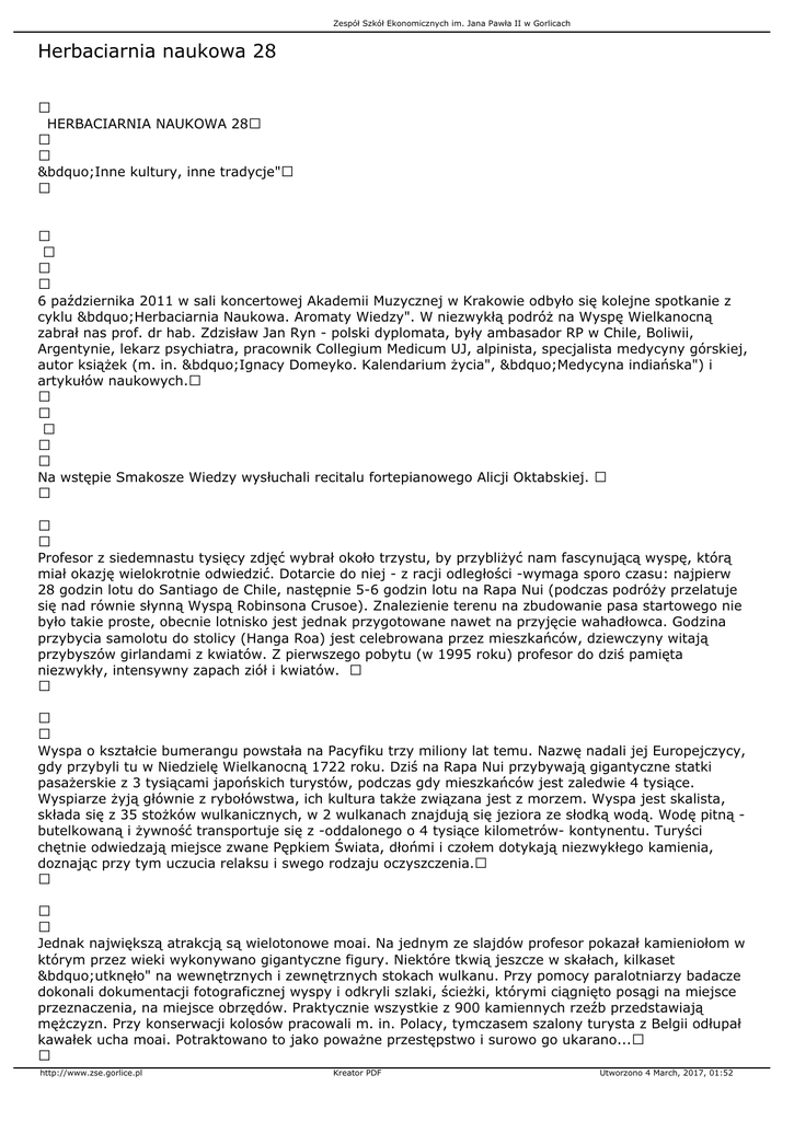 Zespół Szkół Ekonomicznych im. Jana Pawła II w Gorlicach Herbaciarnia naukowa 28 HERBACIARNIA NAUKOWA 28 „Inne kultury, inne tradycje" 6 października 2011 w sali koncertowej Akademii Muzycznej w Krakowie odbyło się kolejne spotkanie z cyklu „Herbaciarnia Naukowa. Aromaty Wiedzy". W niezwykłą podróż na Wyspę Wielkanocną zabrał nas prof. dr hab. Zdzisław Jan Ryn - polski dyplomata, były ambasador RP w Chile, Boliwii, Argentynie, lekarz psychiatra, pracownik Collegium Medicum UJ, alpinista, specjalista medycyny górskiej, autor książek (m. in. „Ignacy Domeyko. Kalendarium życia", „Medycyna indiańska") i artykułów naukowych. Na wstępie Smakosze Wiedzy wysłuchali recitalu fortepianowego Alicji Oktabskiej. Profesor z siedemnastu tysięcy zdjęć wybrał około trzystu, by przybliżyć nam fascynującą wyspę, którą miał okazję wielokrotnie odwiedzić. Dotarcie do niej - z racji odległości -wymaga sporo czasu: najpierw 28 godzin lotu do Santiago de Chile, następnie 5-6 godzin lotu na Rapa Nui (podczas podróży przelatuje się nad równie słynną Wyspą Robinsona Crusoe). Znalezienie terenu na zbudowanie pasa startowego nie było takie proste, obecnie lotnisko jest jednak przygotowane nawet na przyjęcie wahadłowca. Godzina przybycia samolotu do stolicy (Hanga Roa) jest celebrowana przez mieszkańców, dziewczyny witają przybyszów girlandami z kwiatów. Z pierwszego pobytu (w 1995 roku) profesor do dziś pamięta niezwykły, intensywny zapach ziół i kwiatów. Wyspa o kształcie bumerangu powstała na Pacyfiku trzy miliony lat temu. Nazwę nadali jej Europejczycy, gdy przybyli tu w Niedzielę Wielkanocną 1722 roku. Dziś na Rapa Nui przybywają gigantyczne statki pasażerskie z 3 tysiącami japońskich turystów, podczas gdy mieszkańców jest zaledwie 4 tysiące. Wyspiarze żyją głównie z rybołówstwa, ich kultura także związana jest z morzem. Wyspa jest skalista, składa się z 35 stożków wulkanicznych, w 2 wulkanach znajdują się jeziora ze słodką wodą. Wodę pitną butelkowaną i żywność transportuje się z -oddalonego o 4 tysiące kilometrów- kontynentu. Turyści chętnie odwiedzają miejsce zwane Pępkiem Świata, dłońmi i czołem dotykają niezwykłego kamienia, doznając przy tym uczucia relaksu i swego rodzaju oczyszczenia. Jednak największą atrakcją są wielotonowe moai. Na jednym ze slajdów profesor pokazał kamieniołom w którym przez wieki wykonywano gigantyczne figury. Niektóre tkwią jeszcze w skałach, kilkaset „utknęło" na wewnętrznych i zewnętrznych stokach wulkanu. Przy pomocy paralotniarzy badacze dokonali dokumentacji fotograficznej wyspy i odkryli szlaki, ścieżki, którymi ciągnięto posągi na miejsce przeznaczenia, na miejsce obrzędów. Praktycznie wszystkie z 900 kamiennych rzeźb przedstawiają mężczyzn. Przy konserwacji kolosów pracowali m. in. Polacy, tymczasem szalony turysta z Belgii odłupał kawałek ucha moai. Potraktowano to jako poważne przestępstwo i surowo go ukarano... http://www.zse.gorlice.pl Kreator PDF Utworzono 4 March, 2017, 01:52 Zespół Szkół Ekonomicznych im. Jana Pawła II w Gorlicach Barwna opowieść wykładowcy dotyczyła religii i bóstw, języka, roślin, potraw, tradycji i obyczajów (np. kobiety noszą kwiaty za prawym lub lewym uchem w zależności od tego, czy są pannami, czy mężatkami). Gość Aromatów Wiedzy wspominał swój udział w wyprawach eksploracyjno-speleologicznych kierowanych przez Andrzeja Ciszewskiego. „W 2008 roku ekspedycji kierowanej przez Andrzeja Ciszewskiego udało się na Rapa Nui uzyskać zgodę miejscowej Rady Starszych na prowadzenie badań w jaskiniach należących do poszczególnych rodów zamieszkujących wyspę od pokoleń, do których to miejsc przybywający tam naukowcy nie mają zwykle dostępu. W trakcie prac badacze dokonali wielu niezwykle cennych ustaleń na temat kultury i historii mieszkańców Wyspy Wielkanocnej, zaznaczyli liczne stanowiska archeologiczne i antropologiczne oraz m.in. zebrali materiał do dalszych badań , mających ustalić, skąd i kiedy przybyli na wyspę pierwsi ludzie" (http://kolosy.pl/ciszewski.php). Czy tylko jaskinie przyciągają profesora Ryna na Rapa Nui? Chyba chce być blisko mieszkańców wyspy, którzy mówią o sobie „My nie szukamy szczęścia, my jesteśmy szczęśliwi". Smakosze Wiedzy z ZSE: Klaudia Piecuch, Kinga Oratowska, Sylwia Nowak, Anna Jamro, Ewelina Pilch, Magdalena Wójcik, Szymon Budzyniak, Mateusz Gawlak. Opieka: Monika Przybyło, Katarzyna Ćwiklik. http://www.zse.gorlice.pl Kreator PDF Utworzono 4 March, 2017, 01:52