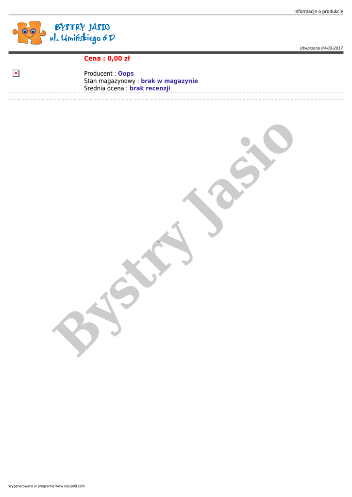 Informacje o produkcie Utworzono 04-03-2017 Cena : 0,00 zł B ys tr y Ja si o Producent : Oops Stan magazynowy : brak w magazynie Średnia ocena : brak recenzji Wygenerowano w programie www.oscGold.com