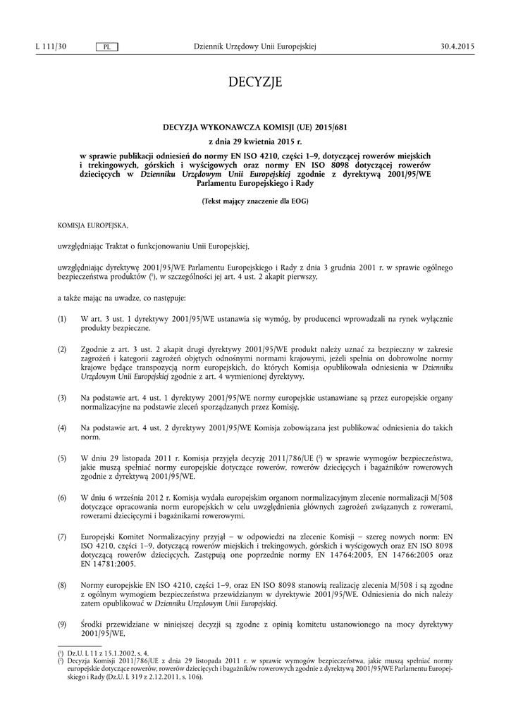 L 111/30 Dziennik Urzędowy Unii Europejskiej PL 30.4.2015 DECYZJE DECYZJA WYKONAWCZA KOMISJI (UE) 2015/681 z dnia 29 kwietnia 2015 r. w sprawie publikacji odniesień do normy EN ISO 4210, części 1–9, dotyczącej rowerów miejskich i trekingowych, górskich i wyścigowych oraz normy EN ISO 8098 dotyczącej rowerów dziecięcych w Dzienniku Urzędowym Unii Europejskiej zgodnie z dyrektywą 2001/95/WE Parlamentu Europejskiego i Rady (Tekst mający znaczenie dla EOG) KOMISJA EUROPEJSKA, uwzględniając Traktat o funkcjonowaniu Unii Europejskiej, uwzględniając dyrektywę 2001/95/WE Parlamentu Europejskiego i Rady z dnia 3 grudnia 2001 r. w sprawie ogólnego bezpieczeństwa produktów (1), w szczególności jej art. 4 ust. 2 akapit pierwszy, a także mając na uwadze, co następuje: (1) W art. 3 ust. 1 dyrektywy 2001/95/WE ustanawia się wymóg, by producenci wprowadzali na rynek wyłącznie produkty bezpieczne. (2) Zgodnie z art. 3 ust. 2 akapit drugi dyrektywy 2001/95/WE produkt należy uznać za bezpieczny w zakresie zagrożeń i kategorii zagrożeń objętych odnośnymi normami krajowymi, jeżeli spełnia on dobrowolne normy krajowe będące transpozycją norm europejskich, do których Komisja opublikowała odniesienia w Dzienniku Urzędowym Unii Europejskiej zgodnie z art. 4 wymienionej dyrektywy. (3) Na podstawie art. 4 ust. 1 dyrektywy 2001/95/WE normy europejskie ustanawiane są przez europejskie organy normalizacyjne na podstawie zleceń sporządzanych przez Komisję. (4) Na podstawie art. 4 ust. 2 dyrektywy 2001/95/WE Komisja zobowiązana jest publikować odniesienia do takich norm. (5) W dniu 29 listopada 2011 r. Komisja przyjęła decyzję 2011/786/UE (2) w sprawie wymogów bezpieczeństwa, jakie muszą spełniać normy europejskie dotyczące rowerów, rowerów dziecięcych i bagażników rowerowych zgodnie z dyrektywą 2001/95/WE. (6) W dniu 6 września 2012 r. Komisja wydała europejskim organom normalizacyjnym zlecenie normalizacji M/508 dotyczące opracowania norm europejskich w celu uwzględnienia głównych zagrożeń związanych z rowerami, rowerami dziecięcymi i bagażnikami rowerowymi. (7) Europejski Komitet Normalizacyjny przyjął – w odpowiedzi na zlecenie Komisji – szereg nowych norm: EN ISO 4210, części 1–9, dotyczącą rowerów miejskich i trekingowych, górskich i wyścigowych oraz EN ISO 8098 dotyczącą rowerów dziecięcych. Zastępują one poprzednie normy EN 14764:2005, EN 14766:2005 oraz EN 14781:2005. (8) Normy europejskie EN ISO 4210, części 1–9, oraz EN ISO 8098 stanowią realizację zlecenia M/508 i są zgodne z ogólnym wymogiem bezpieczeństwa przewidzianym w dyrektywie 2001/95/WE. Odniesienia do nich należy zatem opublikować w Dzienniku Urzędowym Unii Europejskiej. (9) Środki przewidziane w niniejszej decyzji są zgodne z opinią komitetu ustanowionego na mocy dyrektywy 2001/95/WE, (1) Dz.U. L 11 z 15.1.2002, s. 4. (2) Decyzja Komisji 2011/786/UE z dnia 29 listopada 2011 r. w sprawie wymogów bezpieczeństwa, jakie muszą spełniać normy europejskie dotyczące rowerów, rowerów dziecięcych i bagażników rowerowych zgodnie z dyrektywą 2001/95/WE Parlamentu Europej skiego i Rady (Dz.U. L 319 z 2.12.2011, s. 106). 30.4.2015 PL Dziennik Urzędowy Unii Europejskiej L 111/31 PRZYJMUJE NINIEJSZĄ DECYZJĘ: Artykuł 1 Odniesienia do następujących norm są publikowane w serii C Dziennika Urzędowego Unii Europejskiej: a) EN ISO 4210-1:2014 „Rowery — Wymagania bezpieczeństwa dla rowerów” — Część 1: „Terminy i definicje”; b) EN ISO 4210-2:2014 „Rowery — Wymagania bezpieczeństwa dla rowerów” — Część 2: „Wymagania dla rowerów miejskich i trekingowych, dla starszej młodzieży, górskich i wyścigowych”; c) EN ISO 4210-3:2014 „Rowery — Wymagania bezpieczeństwa dla rowerów” — Część 3: „Ogólne metody badań”; d) EN ISO 4210-4:2014 „Rowery — Wymagania bezpieczeństwa dla rowerów” — Część 4: „Metody badań hamulców”; e) EN ISO 4210-5:2014 „Rowery — Wymagania bezpieczeństwa dla rowerów” — Część 5: „Metody badań układu sterowania”; f) EN ISO 4210-6:2014 „Rowery — Wymagania bezpieczeństwa dla rowerów” — Część 6: „Metody badań ramy i widelca”; g) EN ISO 4210-7:2014 „Rowery — Wymagania bezpieczeństwa dla rowerów” — Część 7: „Metody badań kół i obręczy”; h) EN ISO 4210-8:2014 „Rowery — Wymagania bezpieczeństwa dla rowerów” — Część 8: „Metody badań układu napędowego i pedałów”; i) EN ISO 4210-9:2014 „Rowery — Wymagania bezpieczeństwa dla rowerów” — Część 9: „Metody badań siodełek i wsporników siodeł”; j) EN ISO 8098:2014 „Rowery dziecięce — Wymagania bezpieczeństwa i metody badań” Artykuł 2 Niniejsza decyzja wchodzi w życie dwudziestego dnia po jej opublikowaniu w Dzienniku Urzędowym Unii Europejskiej. Sporządzono w Brukseli dnia 29 kwietnia 2015 r. W imieniu Komisji Jean-Claude JUNCKER Przewodniczący