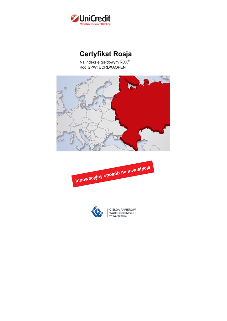 Certyfikat Rosja Na indeksie giełdowym RDX® Kod GPW: UCRDXAOPEN Innow acyj e estycj w n i a s ób n n y s po Dlaczego warto kupić "Certyfikat Rosja"? z Dostęp do wschodzącego rynku Nowej Europy z Dywersyfikacja portfela inwestycyjnego z Możliwość inwestycji w koszyk rosyjskich spółek ® tworzących indeks RDX z Notowanie ciągłe certyfikatów na Giełdzie Papierów Wartościowych w Warszawie S.A. z Możliwość inwestycji niewielkiego kapitału z Możliwości zakupu na rachunek inwestycyjny prowadzony przez Domy Maklerskie w Polsce Jak kształtuje się gospodarka Rosji? Tendencja wzrostowa Z punktu widzenia inwestorów globalnych, rosyjski rynek akcji zajmuje dominującą pozycję w regionie Europy Wschodniej. Według oficjalnych danych, udział rosyjskich aktywów w portfelach zagranicznych funduszy lokujących kapitał na rynkach wschodzących Europy sięga ponad 40 %. Gospodarka rosyjska jest w coraz lepszej kondycji, co znajduje odzwierciedlenie w prężnym tempie wzrostu PKB sięgającym 6,7 % w roku 2006 i prognozowanym na 6 % w roku 2007. Globalny popyt na surowce mineralne oraz ich rekordowe ceny na świecie mają znaczący wpływ na kondycję największych rosyjskich firm. Poza wpływami z wydobycia surowców, gospodarkę rosyjską napędza wzrost lokalnej konsumpcji oraz napływ bezpośrednich inwestycji zagranicznych, których poziom szacunkowo, w kolejnych latach, powinien sięgać około 20 miliardów USD rocznie. Oznacza to, że inwestorzy mogą liczyć na kontynuację wzrostu gospodarczego w Rosji i inwestując w "Certyfikat Rosja", skorzystają z szans, jakie oferują tamtejsze akcje. Czym jest certyfikat? "Certyfikat Rosja" jest dłużnym papierem wartościowym emitowanym przez Bayerische Hypo- und Vereinsbank AG, należący do grupy UniCredit, a jego wartość uzależniona jest od zachowania się kursów akcji wchodzących w skład indeksu RDX®. Indeks RDX® Indeks RDX® skupia akcje najpłynniejszych spółek rosyjskich notowanych na giełdzie w Londynie. Ich udział w portfelu indeksu ustalany jest na podstawie kapitalizacji. RDX® jest indeksem typu cenowego, co oznacza, że przy obliczaniu jego wartości nie uwzględnia się dochodów z tytułu dywidend. Aktualny skład indeksu Nazwa akcji Branża Gazprom Paliwowa Udział w indeksie LUKoil Paliwowa 17,45 % Norilsk Nickel Metalowa 10,95 % Novatek Energetyczna Novolipetsk Steel Metalowa 2,35 % OAO Severstal Metalowa 2,10 % Rosneft Paliwowa 11,65 % Rostelecom Telekomunikacja Surgutneftegaz Paliwowa Tatneft Paliwowa 2,87 % UES Paliwowa 7,43 % VTB Bank Bankowość 4,39 % 25,41 % 2,10 % 1,89 % 11,43 % Stan z dnia 18 grudnia 2007, źródło: Bloomberg Rzuć okiem w przeszłość Porównując wartości historyczne indeksu RDX® z indeksem WIG® obserwujemy imponujący wzrost rosyjskiego indeksu. Indeks zanotował prawie 150 % wzrostu od 1 sierpnia 2005 roku. 210 (znormalizowane do 100) RDX WIG 190 170 150 130 90 gru 05 sty 06 lut 06 mar 06 kwi 06 maj 06 cze 06 lip 06 sie 06 wrz 06 paź 06 lis 06 gru 06 sty 07 lut 07 mar 07 kwi 07 maj 07 cze 07 lip 07 sie 07 wrz 07 paź 07 lis 07 gru 07 110 Źródło danych: Bloomberg, 18 grudnia 2007. Wyniki osiągnięte w przeszłości nie są wyznacznikiem obecnych ani przyszłych zysków. Jak można zainwestować? Aby zakupić "Certyfikat Rosja" na rynku pierwotnym, należy złożyć w Domu Maklerskim odpowiedni zapis w okresie oferty publicznej przed rozpoczęciem notowań na Giełdzie Papierów Wartościowych w Warszawie oraz dokonać płatności za certyfikaty. Od dnia pierwszego notowania na GPW, certyfikaty będzie można kupować i/lub sprzedawać na identycznych zasadach jak notowane na GPW instrumenty finansowe. Minimalna kwota inwestycji odpowiada cenie jednego certyfikatu. Nabyte certyfikaty będą zapisane na rachunku inwestycyjnym klienta. Z tytułu nabycia certyfikatu pobierana jest prowizja maklerska bezpośrednio przez Dom Maklerski, w którym zapis lub zlecenie zostały złożone. Jakich zwrotów z inwestycji można się spodziewać? W ramach zwrotu z inwestycji klient otrzyma 100 % udziału w zmienności ceny certyfikatu "Certyfikat Rosja", którego wartość uzależniona jest od zachowania się kursów rosyjskich akcji wchodzących w skład indeksu ® RDX . Jedynym kosztem z punktu widzenia inwestora są podatki oraz koszty usług maklerskich ponoszone przez inwestora. Poniżej przedstawiono przykład ilustrujący obliczanie zwrotu z inwestycji w "Certyfikat Rosja" przy różnych scenariuszach zmian ceny certyfikatu przy założeniu, że pierwotna inwestycja wynosi 20.000 PLN. Pierwotna inwestycja w PLN Zmiana procentowa ceny Certyfikatu w okresie Zyski/Straty w PLN w okresie Wartość inwestycji w PLN na koniec okresu 20.000 40% 8.000* 28.000 20.000 15% 3.000* 23.000 20.000 0% 0* 20.000 20.000 -15% -3.000* 17.000 20.000 -40% -8.000* 12.000 * Podane wartości nie uwzględniają podatków oraz kosztów usług maklerskich ponoszonych przez inwestora. Przedstawiona tabela zawiera wartości hipotetyczne, które nie bazują na wartościach historycznych, nie są prognozą i mają charakter wyłącznie ilustracyjny. Jakie jest ryzyko? z Inwestor kupujący certyfikat ponosi ryzyko w szczególności związane ze zmianą cen akcji i kursu walutowego. z Nie można wykluczyć utraty części lub całości zainwestowanego kapitału. z Kurs certyfikatu jest zależny od notowań rosyjskiego indeksu RDX®. ® z RDX jest indeksem cenowym. Tak jak w przypadku indeksu WIG 20 – wartość RDX® jest obniżona o wartość wypłaconej dywidendy. Jak można wyjść z inwestycji? Aby wyjść z inwestycji, klient może złożyć zlecenie sprzedaży certyfikatów na Giełdzie Papierów Wartościowych w Warszawie S.A., tak jak w przypadku innych papierów wartościowych, np. akcji, lub złożyć dyspozycję umorzenia w sposób określony w prospekcie emisyjnym oraz dokumencie zawierającym ostateczne warunki emisji certyfikatów. Szczegółowe informacje Nazwa produktu Certyfikat Ro