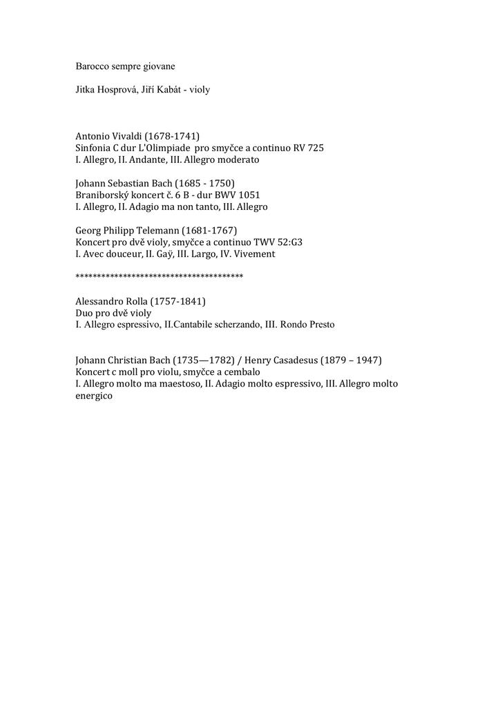 Barocco sempre giovane Jitka Hosprová, Jiří Kabát - violy Antonio Vivaldi (1678-1741) Sinfonia C dur L'Olimpiade pro smyčce a continuo RV 725 I. Allegro, II. Andante, III. Allegro moderato Johann Sebastian Bach (1685 - 1750) Braniborský koncert č. 6 B - dur BWV 1051 I. Allegro, II. Adagio ma non tanto, III. Allegro Georg Philipp Telemann (1681-1767) Koncert pro dvě violy, smyčce a continuo TWV 52:G3 I. Avec douceur, II. Gaÿ, III. Largo, IV. Vivement *************************************** Alessandro Rolla (1757-1841) Duo pro dvě violy I. Allegro espressivo, II.Cantabile scherzando, III. Rondo Presto Johann Christian Bach (1735—1782) / Henry Casadesus (1879 – 1947) Koncert c moll pro violu, smyčce a cembalo I. Allegro molto ma maestoso, II. Adagio molto espressivo, III. Allegro molto energico