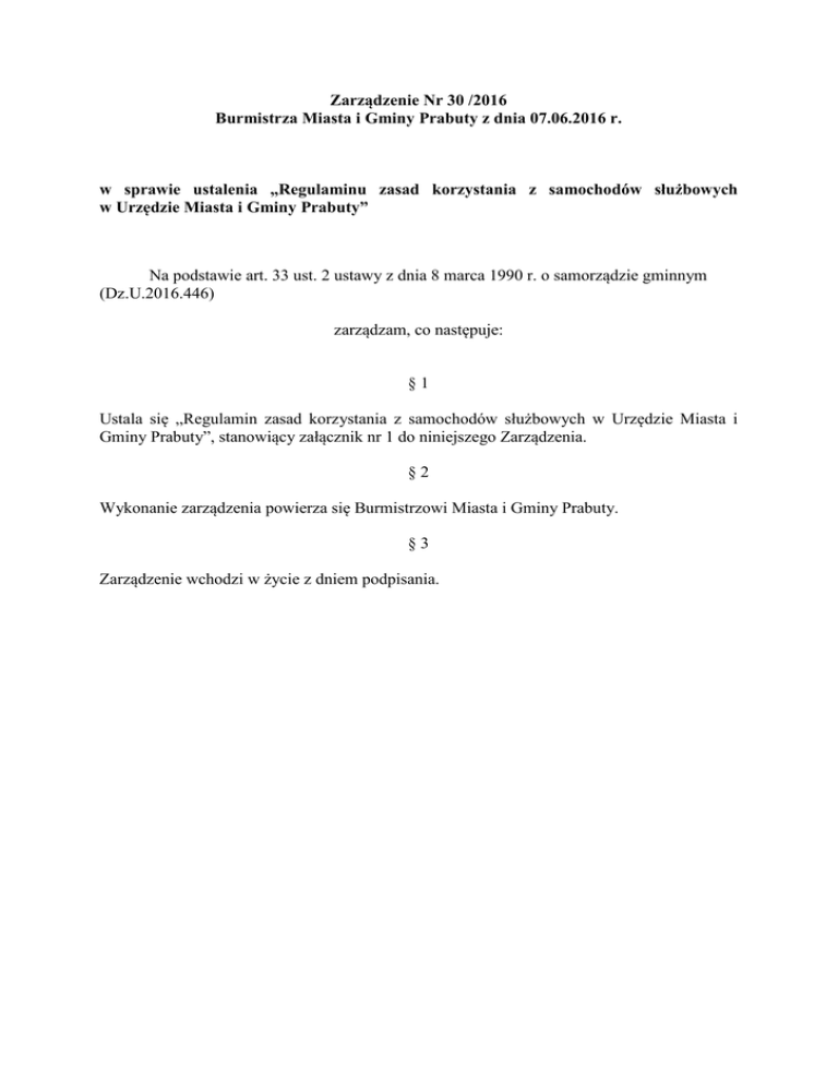 Zarządzenie Nr 30 /2016 Burmistrza Miasta i Gminy Prabuty z dnia 07.06.2016 r. w sprawie ustalenia „Regulaminu zasad korzystania z samochodów służbowych w Urzędzie Miasta i Gminy Prabuty” Na podstawie art. 33 ust. 2 ustawy z dnia 8 marca 1990 r. o samorządzie gminnym (Dz.U.2016.446) zarządzam, co następuje: §1 Ustala się „Regulamin zasad korzystania z samochodów służbowych w Urzędzie Miasta i Gminy Prabuty”, stanowiący załącznik nr 1 do niniejszego Zarządzenia. §2 Wykonanie zarządzenia powierza się Burmistrzowi Miasta i Gminy Prabuty. §3 Zarządzenie wchodzi w życie z dniem podpisania. Załącznik nr 1 do Zarządzenia nr …… / 2016 Burmistrza Miasta i Gminy Prabuty z dnia ………………. REGULAMIN ZASAD KORZYSTANIA Z SAMOCHODÓW SŁUŻBOWYCH W URZĘDZIE MIASTA I GMINY PRABUTY §1 1. Samochody będące w dyspozycji Urzędu Miasta i Gminy Prabuty mogą być wykorzystywane wyłącznie do celów służbowych związanych z wykonywaniem funkcji, zadań i obowiązków służbowych przez osoby zatrudnione w Urzędzie. 2. Osobami uprawnionymi do korzystania z samochodów służbowych oraz podejmowania decyzji w zakresie ich wykorzystywania są: - Burmistrz Miasta i Gminy Prabuty - Zastępca Burmistrza Miasta i Gminy Prabuty - Sekretarz Miasta i Gminy Prabuty. 3. Z samochodów służbowych mogą również korzystać pracownicy Urzędu, w celu realizacji obowiązków służbowych, posiadający pisemne upoważnienie do użytkowania stałego lub prowadzenia pojazdu służbowego, wystawione przez Burmistrza Miasta i Gminy lub Sekretarza Miasta i Gminy. §2 1. Upoważnienie do prowadzenia pojazdów służbowych pracownik otrzymuje pod warunkiem posiadania prawa jazdy odpowiedniej kategorii, wymaganych przepisami badań lekarskich oraz złożenia pisemnego oświadczenia o zapoznaniu się z niniejszym Regulaminem. 2. Wzór pisemnego upoważnienia, o którym mowa w ust. 1 stanowi Załącznik Nr 1 do niniejszego Regulaminu. 3. Pracownik posiadający upoważnienie do prowadzenia pojazdów służbowych jest zobowiązany do niezwłocznego pisemnego powiadomienia pracodawcy o fakcie utraty uprawnień do prowadzenia pojazdów. 4. Przekazanie pracownikowi samochodu służbowego w użytkowanie stałe, o którym mowa w § 1 ust. 3 następuje na podstawie protokołu przekazania samochodu służbowego. Wzór protokołu z przekazania samochodu służbowego użytkownikowi stanowi Załącznik Nr 2 do niniejszego Regulaminu. 5. Pracownicy, którym nie został przekazany samochód służbowy do użytkowania stałego, a jedynie użytkują go okazyjnie – potwierdzą swoje użytkowanie wpisem w odpowiedniej rubryce karty drogowej. Pracownicy użytkujący samochody służbowe okazyjnie zobowiązani są do przestrzegania niniejszego zarządzenia w równym stopniu, jak pracownicy, którym przekazano pojazd służbowy w drodze protokołu przekazania. §3 Pojazdy będące w dyspozycji Urzędu Miasta i Gminy Prabuty służą wyłącznie do celów służbowych. §4 1. Pracownik, któremu powierzono pojazd służbowy odpowiada za pojazd i jego wyposażenie. 2. Kierujący pojazdem służbowym zobowiązany jest do: a) kierowania pojazdem zgodnie z przepisami prawa o ruchu drogowym, b) eksploatowania pojazdu z zachowaniem bezpieczeństwa i ekonomicznych warunków jazdy, c) dbania o czystość i estetyczny wygląd pojazdu, d) dokonywania codziennej i okresowej obsługi samochodu, włącznie z tankowaniem paliwa, e) niezwłocznego zgłaszania przełożonemu stwierdzonej usterki oraz potrzeby dokonania naprawy pojazdu, f) odprowadzania pojazdu na miejsce stałego garażowania każdorazowo na koniec dnia pracy, g) w przypadku wypadku drogowego, kolizji, zaistnienia kradzieży samochodu, bądź elementów jego wyposażenia – podjęcia wszelkich działań dla zmniejszenia skutków zdarzenia, niezwłocznego powiadomienia organu Policji oraz zgłoszenia szkody Burmistrzowi Miasta i Gminy lub Sekretarzowi Miasta i Gminy. 3. W przypadku uszkodzenia pojazdu wynikającego z niewłaściwego użytkowania, a także niewłaściwej eksploatacji pojazdu, pracownik zobowiązany jest do zwrotu kosztów naprawy pojazdu. 4. Pracownik uczestniczący we wszystkich zdarzeniach, w wyniku których dojdzie do uszkodzenia pojazdu, zobowiązany jest do niezwłocznego powiadomienia Burmistrza Miasta i Gminy Prabuty lub Sekretarza Miasta i Gminy. §5 1. Obowiązkiem każdego pracownika, prowadzącego pojazd służbowy jest posiadanie i wypełnienie prawidłowo karty drogowej. 2. Wzór karty drogowej, o której mowa w ust. 1, zasady jej wypełniania i postępowania określa Załącznik Nr 3 do niniejszego Regulaminu. §6 1. Ustala się normy zużycia paliwa dla samochodów będących w dyspozycji Urzędu Miasta i Gminy Prabuty. W przypadku zakupu/najmu nowego pojazdu służbowego normę zużycia paliwa ustala się po upływie 3 miesięcy od dnia zakupu/najmu pojazdu. 2. Szczegółowy wykaz miesięcznych norm zużycia paliwa, wzór miesięcznej karty zużycia paliwa dla pojazdu oraz sposób rozliczania paliwa określa Załącznik Nr 4 do niniejszego Regulaminu. 3. Miesięczne zużycie paliwa rozliczane będzie po zakończeniu miesiąca, nie później niż do 15 dnia kalendarzowego po upływie okresu rozliczeniowego. 4. W celu prawidłowego rozliczenia paliwa wprowadza się obowiązek zatankowania pojazdu do pełnego zbiornika, ostatniego dnia pracy w miesiącu na koniec pracy. 5. Osobami odpowiedzialnymi za wykonanie obowiązku określonego w ust. 4 są osoby, którym powierzono pojazdy służbowe. §7 1. W ramach czynności dodatkowych osoba, której powierzono pojazd służbowy zobowiązana jest do wykonywania obsługi codziennej pojazdu oraz dbania o sprawność ogólną pojazdu i stan jego wyposażenia. 2. Osoba, o której mowa w ust. 1 zobowiązana jest do dostarczenia oraz odbioru pojazdu w celu dokonywania okresowych obsług technicznych, a także napraw bieżących pojazdu w wyznaczonych stacjach obsługi pojazdów. 3.