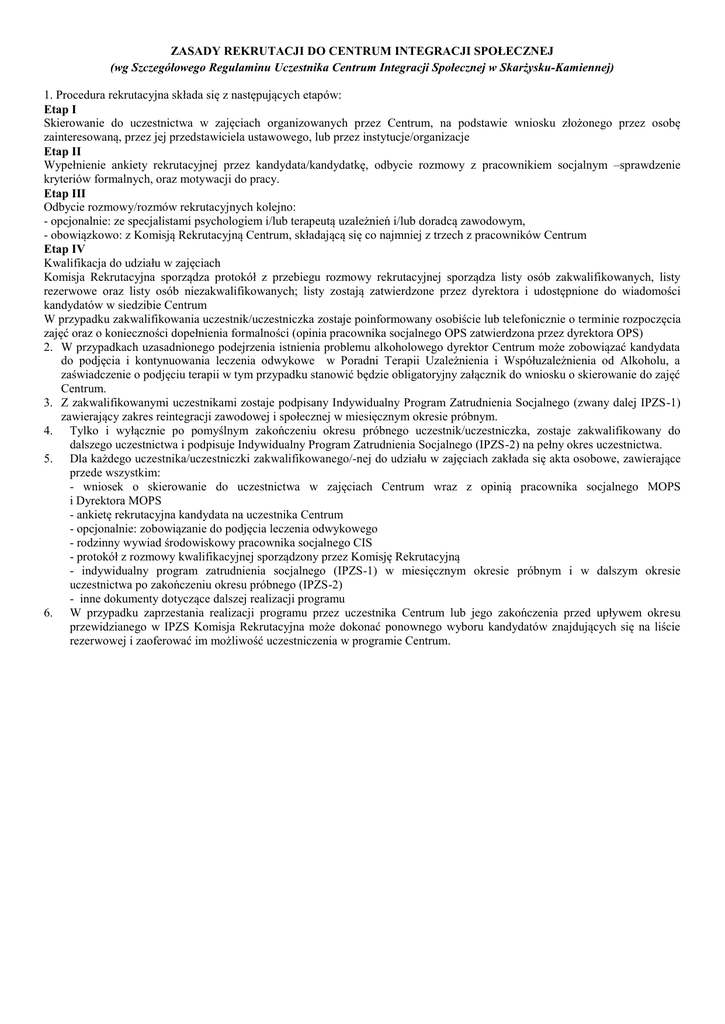 ZASADY REKRUTACJI DO CENTRUM INTEGRACJI SPOŁECZNEJ (wg Szczegółowego Regulaminu Uczestnika Centrum Integracji Społecznej w Skarżysku-Kamiennej) 1. Procedura rekrutacyjna składa się z następujących etapów: Etap I Skierowanie do uczestnictwa w zajęciach organizowanych przez Centrum, na podstawie wniosku złożonego przez osobę zainteresowaną, przez jej przedstawiciela ustawowego, lub przez instytucje/organizacje Etap II Wypełnienie ankiety rekrutacyjnej przez kandydata/kandydatkę, odbycie rozmowy z pracownikiem socjalnym –sprawdzenie kryteriów formalnych, oraz motywacji do pracy. Etap III Odbycie rozmowy/rozmów rekrutacyjnych kolejno: - opcjonalnie: ze specjalistami psychologiem i/lub terapeutą uzależnień i/lub doradcą zawodowym, - obowiązkowo: z Komisją Rekrutacyjną Centrum, składającą się co najmniej z trzech z pracowników Centrum Etap IV Kwalifikacja do udziału w zajęciach Komisja Rekrutacyjna sporządza protokół z przebiegu rozmowy rekrutacyjnej sporządza listy osób zakwalifikowanych, listy rezerwowe oraz listy osób niezakwalifikowanych; listy zostają zatwierdzone przez dyrektora i udostępnione do wiadomości kandydatów w siedzibie Centrum W przypadku zakwalifikowania uczestnik/uczestniczka zostaje poinformowany osobiście lub telefonicznie o terminie rozpoczęcia zajęć oraz o konieczności dopełnienia formalności (opinia pracownika socjalnego OPS zatwierdzona przez dyrektora OPS) 2. W przypadkach uzasadnionego podejrzenia istnienia problemu alkoholowego dyrektor Centrum może zobowiązać kandydata do podjęcia i kontynuowania leczenia odwykowe w Poradni Terapii Uzależnienia i Współuzależnienia od Alkoholu, a zaświadczenie o podjęciu terapii w tym przypadku stanowić będzie obligatoryjny załącznik do wniosku o skierowanie do zajęć Centrum. 3. Z zakwalifikowanymi uczestnikami zostaje podpisany Indywidualny Program Zatrudnienia Socjalnego (zwany dalej IPZS-1) zawierający zakres reintegracji zawodowej i społecznej w miesięcznym okresie próbnym. 4. Tylko i wyłącznie po pomyślnym zakończeniu okresu próbnego uczestnik/uczestniczka, zostaje zakwalifikowany do dalszego uczestnictwa i podpisuje Indywidualny Program Zatrudnienia Socjalnego (IPZS-2) na pełny okres uczestnictwa. 5. Dla każdego uczestnika/uczestniczki zakwalifikowanego/-nej do udziału w zajęciach zakłada się akta osobowe, zawierające przede wszystkim: - wniosek o skierowanie do uczestnictwa w zajęciach Centrum wraz z opinią pracownika socjalnego MOPS i Dyrektora MOPS - ankietę rekrutacyjna kandydata na uczestnika Centrum - opcjonalnie: zobowiązanie do podjęcia leczenia odwykowego - rodzinny wywiad środowiskowy pracownika socjalnego CIS - protokół z rozmowy kwalifikacyjnej sporządzony przez Komisję Rekrutacyjną - indywidualny program zatrudnienia socjalnego (IPZS-1) w miesięcznym okresie próbnym i w dalszym okresie uczestnictwa po zakończeniu okresu próbnego (IPZS-2) - inne dokumenty dotyczące dalszej realizacji programu 6. W przypadku zaprzestania realizacji programu przez uczestnika Centrum lub jego zakończenia przed upływem okresu przewidzianego w IPZS Komisja Rekrutacyjna może dokonać ponownego wyboru kandydatów znajdujących się na liście rezerwowej i zaoferować im możliwość uczestniczenia w programie Centrum.
