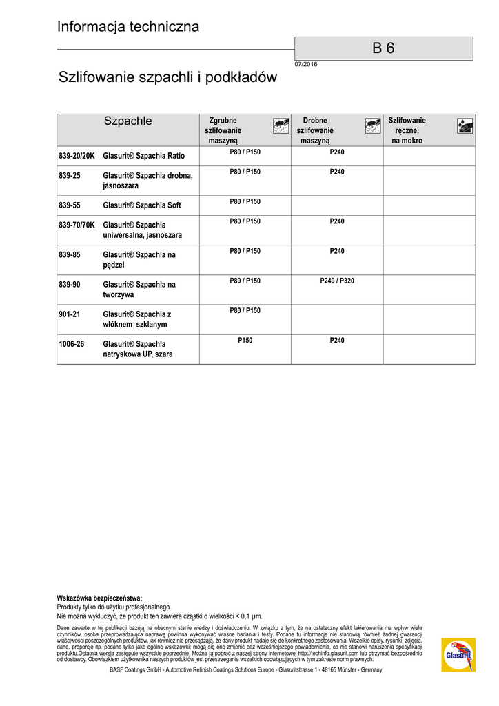 Informacja techniczna B6 Szlifowanie szpachli i podkładów Szpachle Zgrubne szlifowanie maszyną 07/2016 Drobne szlifowanie maszyną Szlifowanie ręczne, na mokro 839-20/20K Glasurit® Szpachla Ratio P80 / P150 P240 839-25 Glasurit® Szpachla drobna, jasnoszara P80 / P150 P240 839-55 Glasurit® Szpachla Soft P80 / P150 839-70/70K Glasurit® Szpachla uniwersalna, jasnoszara P80 / P150 P240 839-85 Glasurit® Szpachla na pędzel P80 / P150 P240 839-90 Glasurit® Szpachla na tworzywa P80 / P150 P240 / P320 901-21 Glasurit® Szpachla z włóknem szklanym P80 / P150 1006-26 Glasurit® Szpachla natryskowa UP, szara P150 P240 Wskazówka bezpieczeństwa: Produkty tylko do użytku profesjonalnego. Nie można wykluczyć, że produkt ten zawiera cząstki o wielkości < 0,1 µm. Dane zawarte w tej publikacji bazują na obecnym stanie wiedzy i doświadczeniu. W związku z tym, że na ostateczny efekt lakierowania ma wpływ wiele czynników, osoba przeprowadzająca naprawę powinna wykonywać własne badania i testy. Podane tu informacje nie stanowią również żadnej gwarancji właściwości poszczególnych produktów, jak również nie przesądzają, że dany produkt nadaje się do konkretnego zastosowania. Wszelkie opisy, rysunki, zdjęcia, dane, proporcje itp. podano tylko jako ogólne wskazówki; mogą się one zmienić bez wcześniejszego powiadomienia, co nie stanowi naruszenia specyfikacji produktu.Ostatnia wersja zastępuje wszystkie poprzednie. Można ją pobrać z naszej strony internetowej http://techinfo.glasurit.com lub otrzymać bezpośrednio od dostawcy. Obowiązkiem użytkownika naszych produktów jest przestrzeganie wszelkich obowiązujących w tym zakresie norm prawnych. BASF Coatings GmbH - Automotive Refinish Coatings Solutions Europe - Glasuritstrasse 1 - 48165 Münster - Germany Informacja techniczna B6 Szlifowanie szpachli i podkładów Podkłady gruntujące 151-170 Glasurit® Podkład gruntujący UV, szary 176-72 Glasurit® Podkład gruntujący 1K na bazie wodnej, ciemnoszary 283-150 Glasurit® Podkład gruntujący, jasnobeżowy 285-230 Glasurit® Podkład gruntujący Pro, biały 285-270 Glasurit® Podkład gruntujący Pro, szary 285-290 Glasurit® Podkład gruntujący Pro, czarny 285-505 Glasurit® Podkład gruntujący HS, szary 285-555 Glasurit® Podkład gruntujący HS, czarny 285-655 Glasurit® Podkład gruntujący HS, biały 285-700 Glasurit® Podkład gruntujący, szary 285-730 Glasurit® Podkład gruntujący, biały 285-790 Glasurit® Podkład gruntujący, czarny 801-72 Glasurit® Epoksydowy podkład gruntujący VOC, szary Zgrubne szlifowanie maszyną 07/2016 Drobne szlifowanie maszyną Szlifowanie ręczne, na mokro P400 - P500 P800 P400 - P500 P800 P800 P400 - P500 P800 P400 - P500 P800 P400 - P500 P800 P400 - P500 P800 P400 - P500 P800 P400 - P500 P800 P400 - P500 P800 P400 - P500 P800 P400 - P500 P800 P400 - P500 P800 Wskazówka bezpieczeństwa: Produkty tylko do użytku profesjonalnego. Nie można wykluczyć, że produkt ten zawiera cząstki o wielkości < 0,1 µm. Dane zawarte w tej publikacji bazują na obecnym stanie wiedzy i doświadczeniu. W związku z tym, że na ostateczny efekt lakierowania ma wpływ wiele czynników, osoba przeprowadzająca naprawę powinna wykonywać własne badania i testy. Podane tu informacje nie stanowią również żadnej gwarancji właściwości poszczególnych produktów, jak również nie przesądzają, że dany produkt nadaje się do konkretnego zastosowania. Wszelkie opisy, rysunki, zdjęcia, dane, proporcje itp. podano tylko jako ogólne wskazówki; mogą się one zmienić bez wcześniejszego powiadomienia, co nie stanowi naruszenia specyfikacji produktu.Ostatnia wersja zastępuje wszystkie poprzednie. Można ją pobrać z naszej strony internetowej http://techinfo.glasurit.com lub otrzymać bezpośrednio od dostawcy. Obowiązkiem użytkownika naszych produktów jest przestrzeganie wszelkich obowiązujących w tym zakresie norm prawnych. BASF Coatings GmbH - Automotive Refinish Coatings Solutions Europe - Glasuritstrasse 1 - 48165 Münster - Germany Informacja techniczna B6 Szlifowanie szpachli i podkładów Podkłady wypełniające 285-95 Glasurit® Podkład do dobarwiania HS, transparentny Zgrubne szlifowanie maszyną 07/2016 Drobne szlifowanie maszyną P400 - P500 Szlifowanie ręczne, na mokro P800 Wskazówka bezpieczeństwa: Produkty tylko do użytku profesjonalnego. Nie można wykluczyć, że produkt ten zawiera cząstki o wielkości < 0,1 µm. Dane zawarte w tej publikacji bazują na obecnym stanie wiedzy i doświadczeniu. W związku z tym, że na ostateczny efekt lakierowania ma wpływ wiele czynników, osoba przeprowadzająca naprawę powinna wykonywać własne badania i testy. Podane tu informacje nie stanowią również żadnej gwarancji właściwości poszczególnych produktów, jak również nie przesądzają, że dany produkt nadaje się do konkretnego zastosowania. Wszelkie opisy, rysunki, zdjęcia, dane, proporcje itp. podano tylko jako ogólne wskazówki; mogą się one zmienić bez wcześniejszego powiadomienia, co nie stanowi naruszenia specyfikacji produktu.Ostatnia wersja zastępuje wszystkie poprzednie. Można ją pobrać z naszej strony internetowej http://techinfo.glasurit.com lub otrzymać bezpośrednio od dostawcy. Obowiązkiem użytkownika naszych produktów jest przestrzeganie wszelkich obowiązujących w tym zakresie norm prawnych. BASF Coatings GmbH - Automotive Refinish Coatings Solutions Europe - Glasuritstrasse 1 - 48165 Münster - Germany