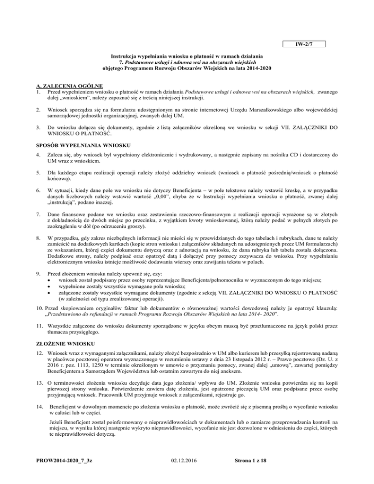 IW-2/7 Instrukcja wypełniania wniosku o płatność w ramach działania 7. Podstawowe usługi i odnowa wsi na obszarach wiejskich objętego Programem Rozwoju Obszarów Wiejskich na lata 2014-2020 A. ZALECENIA OGÓLNE 1. Przed wypełnieniem wniosku o płatność w ramach działania Podstawowe usługi i odnowa wsi na obszarach wiejskich, zwanego dalej „wnioskiem”, należy zapoznać się z treścią niniejszej instrukcji. 2. Wniosek sporządza się na formularzu udostępnionym na stronie internetowej Urzędu Marszałkowskiego albo wojewódzkiej samorządowej jednostki organizacyjnej, zwanych dalej UM. 3. Do wniosku dołącza się dokumenty, zgodnie z listą załączników określoną we wniosku w sekcji VII. ZAŁĄCZNIKI DO WNIOSKU O PŁATNOŚĆ. SPOSÓB WYPEŁNIANIA WNIOSKU 4. Zaleca się, aby wniosek był wypełniony elektronicznie i wydrukowany, a następnie zapisany na nośniku CD i dostarczony do UM wraz z wnioskiem. 5. Dla każdego etapu realizacji operacji należy złożyć oddzielny wniosek (wniosek o płatność pośrednią/wniosek o płatność końcową). 6. W sytuacji, kiedy dane pole we wniosku nie dotyczy Beneficjenta – w pole tekstowe należy wstawić kreskę, a w przypadku danych liczbowych należy wstawić wartość „0,00”, chyba że w Instrukcji wypełniania wniosku o płatność, zwanej dalej „instrukcją”, podano inaczej. 7. Dane finansowe podane we wniosku oraz zestawieniu rzeczowo-finansowym z realizacji operacji wyrażone są w złotych z dokładnością do dwóch miejsc po przecinku, z wyjątkiem kwoty wnioskowanej, którą należy podać w pełnych złotych po zaokrągleniu w dół (po odrzuceniu groszy). 8. W przypadku, gdy zakres niezbędnych informacji nie mieści się w przewidzianych do tego tabelach i rubrykach, dane te należy zamieścić na dodatkowych kartkach (kopie stron wniosku i załączników składanych na udostępnionych przez UM formularzach) ze wskazaniem, której części dokumentu dotyczą oraz z adnotacją na wniosku, że dana rubryka lub tabela została dołączona. Dodatkowe strony, należy podpisać oraz opatrzyć datą i dołączyć przy pomocy zszywacza do wniosku. Przy wypełnianiu elektronicznym wniosku istnieje możliwość dodawania wierszy oraz zawijania tekstu w polach. 9. Przed złożeniem wniosku należy upewnić się, czy: wniosek został podpisany przez osoby reprezentujące Beneficjenta/pełnomocnika w wyznaczonym do tego miejscu; wypełnione zostały wszystkie wymagane pola wniosku; załączone zostały wszystkie wymagane dokumenty (zgodnie z sekcją VII. ZAŁĄCZNIKI DO WNIOSKU O PŁATNOŚĆ (w zależności od typu zrealizowanej operacji). 10. Przed skopiowaniem oryginałów faktur lub dokumentów o równoważnej wartości dowodowej należy je opatrzyć klauzulą: „Przedstawiono do refundacji w ramach Programu Rozwoju Obszarów Wiejskich na lata 2014- 2020”. 11. Wszystkie załączone do wniosku dokumenty sporządzone w języku obcym muszą być przetłumaczone na język polski przez tłumacza przysięgłego. ZŁOŻENIE WNIOSKU 12. Wniosek wraz z wymaganymi załącznikami, należy złożyć bezpośrednio w UM albo kurierem lub przesyłką rejestrowaną nadaną w placówce pocztowej operatora wyznaczonego w rozumieniu ustawy z dnia 23 listopada 2012 r. – Prawo pocztowe (Dz. U. z 2016 r. poz. 1113, 1250 w terminie określonym w umowie o przyznaniu pomocy, zwanej dalej „umową”, zawartej pomiędzy Beneficjentem a Samorządem Województwa lub ostatnim zawartym do niej aneksem. 13. O terminowości złożenia wniosku decyduje data jego złożenia/ wpływu do UM. Złożenie wniosku potwierdza się na kopii pierwszej strony wniosku. Potwierdzenie zawiera datę złożenia, jest opatrzone pieczęcią UM oraz podpisane przez osobę przyjmującą wniosek. Pracownik UM przyjmuje wniosek z załącznikami, rejestruje go. 14. Beneficjent w dowolnym momencie po złożeniu wniosku o płatność, może zwrócić się z pisemną prośbą o wycofanie wniosku w całości lub w części. Jeżeli Beneficjent został poinformowany o nieprawidłowościach w dokumentach lub o zamiarze przeprowadzenia kontroli na miejscu, w wyniku której następnie wykryto nieprawidłowości, wycofanie nie jest dozwolone w odniesieniu do części, których te nieprawidłowości dotyczą. PROW2014-2020_7_3z 02.12.2016 Strona 1 z 18 Jeśli UM poinformował już Beneficjenta o jakichkolwiek przypadkach niezgodności w dokumentach, lub jeśli powiadomił go o zamiarze przeprowadzenia kontroli na miejscu lub jeśli ta kontrola ujawni jakiekolwiek przypadki niezgodności, wycofanie nie jest dozwolone odnośnie do części tych dokumentów, których dotyczy niezgodność. Wycofanie wniosku w całości nie wywołuje żadnych skutków prawnych, powstaje więc sytuacja jakby Beneficjent tego wniosku nie złożył. Natomiast wycofanie wniosku w części lub innej deklaracji (załącznika) sprawia, że Beneficjent znajduje się w sytuacji sprzed złożenia odnośnych dokumentów lub ich części. ROZPATRZENIE WNIOSKU 15. Jeżeli wniosek o płatność zawiera braki (np. brak poprawnego dokumentu / niedołączenie wymaganego dokumentu / brak poprawnie wypełnionych pól wniosku / brak wypełnionego pola wniosku), UM wzywa Beneficjenta, w formie pisemnej do ich usunięcia w terminie 14 dni od dnia doręczenia wezwania. Termin uważa się za zachowany, jeżeli przed jego upływem nadano przesyłkę rejestrowaną w placówce pocztowej operatora wyznaczonego. 16. Jeżeli Beneficjent pomimo wezwania, nie usunął (uzupełnił) braków w wyznaczonym terminie, UM ponownie wzywa Beneficjenta, w formie pisemnej, do usunięcia braków w terminie 14 dni od dnia doręczenia wezwania. 17. Jeżeli Beneficjent, pomimo ponownego wezwania do usunięcia braków nie usunął ich w wyznaczonym terminie UM rozpatruje wniosek w zakresie, w jakim został wypełniony oraz na podstawie dołączonych i poprawnie sporządzonych dokumentów. 18. W trakcie rozpatrywania wniosku, UM może w