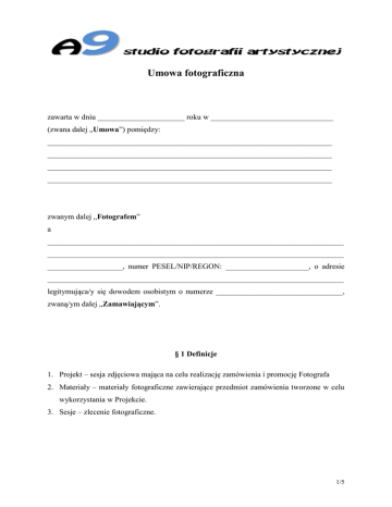 Umowa fotograficzna zawarta w dniu ______________________ roku w _______________________________ (zwana dalej „Umowa”) pomiędzy: ________________________________________________________________________ ________________________________________________________________________ ________________________________________________________________________ ________________________________________________________________________ zwanym dalej „Fotografem” a ___________________________________________________________________________ ___________________________________________________________________________ ___________________, numer PESEL/NIP/REGON: _____________________, o adresie ___________________________________________________________________________ legitymująca/y się dowodem osobistym o numerze ________________________________, zwaną/ym dalej „Zamawiającym”. § 1 Definicje 1. Projekt – sesja zdjęciowa mająca na celu realizację zamówienia i promocję Fotografa 2. Materiały – materiały fotograficzne zawierające przedmiot zamówienia tworzone w celu wykorzystania w Projekcie. 3. Sesje – zlecenie fotograficzne. 1/5 §2 Przedmiot umowy 1. Przedmiotem niniejszej umowy jest pełne i rzetelne wykonanie usługi fotograficznej. Opis usługi: ___________________________________________________________ ________________________________________________________________________ _______________________________________________________________________ Czas i miejsce wykonania usługi: ____________________________________________ ________________________________________________________________________ ________________________________________________________________________ Istotne uwagi dla Fotografa: _________________________________________________ ________________________________________________________________________ ________________________________________________________________________ ________________________________________________________________________ ________________________________________________________________________ ________________________________________________________________________ ________________________________________________________________________ 2. Miejsce wykonania Sesji, rodzaj i ilość wykonanych Materiałów oraz obecność osób trzecich mających współpracować przy Sesji zostaną ustalone odpowiednio wcześniej przed jej rozpoczęciem. 3. W celu realizacji zlecenia Zamawiający zapewni nieodpłatnie Fotografowi: a. wstęp i możliwość swobodnego poruszania się po miejscu odbywania zlecenia; b. dostęp do instalacji elektrycznej 230 V na potrzeby ładowania sprzętu. c. miejsce parkingowe, na terenie miejsca będącego przedmiotem zamówienia, na czas trwania zlecenia 2/5 §3 Prawa autorskie 1. Fotograf udziela nieodpłatnie licencji niewyłącznej Zamawiającemu na czas nieoznaczony. 2. Licencja obejmuje zgodę na rozpowszechnianie, utrwalanie i zwielokrotnianie dowolną techniką Materiałów wyłącznie w ramach działań mieszczących się w zakresie niniejszej Umowy. 3. Fotograf ma prawo nieodpłatnie wykorzystać wszystkie wykonane Materiały i rozpowszechniać zdjęcia wykonane dla Zamawiającego w celach prezentacji własnej twórczości, w szczególności na stronach internetowych, publikacjach dotyczących własnych prac, publikacjach zbiorowych, wernisażach i wystawach zbiorowych, konkursach oraz w celach promocyjno-reklamowych dotyczących Fotografa w dowolnym czasie i miejscu na terytorium całego świata. 4. Fotograf zastrzega sobie wyłączne prawo do dokonywania jakichkolwiek przeróbek i modyfikacji zmieniających oryginalną postać zdjęć. 5. Zabrania się jakiejkolwiek ingerencji w strukturę i treść Materiałów łącznie z przetwarzaniem elektronicznym, kadrowaniem, zmianą kolorystyki, stosowaniem filtrów, a w szczególności usuwaniem znaku wodnego Fotografa przez Zamawiającego lub osoby trzecie. 6. Zamawiający udziela fotografowi zgody na wykorzystywanie komercyjne produktów uwidocznionych podczas Sesji. 3/5 §4 Wynagrodzenie Fotografa 1. Fotograf informuje Zamawiającego, iż nie jest płatnikiem VAT. 2. Wynagrodzenie z tytułu wykonania niniejszej umowy dla Fotografa wynosi ________________________________________________________________ zł brutto (słownie _____________________________________________________________zł). 3. Wynagrodzenie płatne będzie w terminie __________ dni od przekazania materiałów, o których mowa niniejszej umowy na rachunek bankowy wskazany przez Fotografa na fakturze lub gotówką za pokwitowaniem. 4. Fotograf, w ciągu _______________________ od dnia wykonania Sesji przekaże egzemplarze fotografii na płycie DVD 5. §7 Odpowiedzialność za szkody 1. Fotograf nie ponosi odpowiedzialności za szkody poniesione przez Zamawiającego oraz osoby trzecie, wynikające z działań samego Zamawiającego i wyrządzone podczas wykonywania Sesji do Projektu i przy jej sposobności. 2. Zamawiający ponosi pełną odpowiedzialność za szkody powstałe w warunkach określonych w powyższym punkcie 1. 3. Zamawiający w wypadku odwołania stanowiących przedmiot zamówienia zgody na rozpowszechnianie fotografii jest zobowiązana do zapłaty 1000 zł (tysiąc złotych) tytułem kary umownej. Jeżeli szkoda poniesiona przez Fotografa przewyższy wysokość zastrzeżonej kary, może on dochodzić pozostałej części odszkodowania na zasadach ogólnych. 4. Fotograf może odstąpić od dochodzenia powyższej kary umownej. 4/5 §8 Postanowienia końcowe 1. Wszelkie zmiany niniejszej Umowy wymagają formy pisemnej pod rygorem nieważności w postaci aneksu. 2. Niniejsza Umowa stanowi całość i zastępuje wszelkie wcześniejsze umowy, porozumienia, postanowienia, ustalenia w przedmiocie niniejszej Umowy. 3. Strony dążyć będą do polubownego rozstrzygania ewentualnych sporów mogących wynikać w związku z wykonaniem, niewykonaniem lub nienależytym wykonaniem niniejszej Umowy. 4. W pr