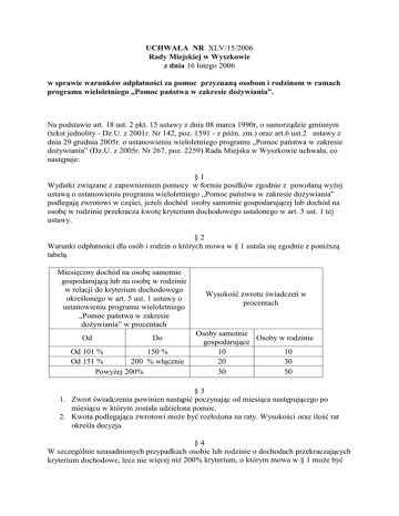 UCHWAŁA NR XLV/15/2006 Rady Miejskiej w Wyszkowie z dnia 16 lutego 2006 w sprawie warunków odpłatności za pomoc przyznaną osobom i rodzinom w ramach programu wieloletniego „Pomoc państwa w zakresie doŜywiania”. Na podstawie art. 18 ust. 2 pkt. 15 ustawy z dnia 08 marca 1990r, o samorządzie gminnym (tekst jednolity - Dz.U. z 2001r. Nr 142, poz. 1591 - z późn. zm.) oraz art.6 ust.2 ustawy z dnia 29 grudnia 2005r. o ustanowieniu wieloletniego programu „Pomoc państwa w zakresie doŜywiania” (Dz.U. z 2005r. Nr 267, poz. 2259) Rada Miejska w Wyszkowie uchwala, co następuje: §1 Wydatki związane z zapewnieniem pomocy w formie posiłków zgodnie z powołaną wyŜej ustawą o ustanowieniu programu wieloletniego „Pomoc państwa w zakresie doŜywiania” podlegają zwrotowi w części, jeŜeli dochód osoby samotnie gospodarującej lub dochód na osobę w rodzinie przekracza kwotę kryterium dochodowego ustalonego w art. 5 ust. 1 tej ustawy. §2 Warunki odpłatności dla osób i rodzin o których mowa w § 1 ustala się zgodnie z poniŜszą tabelą Miesięczny dochód na osobę samotnie gospodarującą lub na osobę w rodzinie w relacji do kryterium dochodowego określonego w art. 5 ust. 1 ustawy o ustanowieniu programu wieloletniego „Pomoc państwa w zakresie doŜywiania” w procentach Od Do Od 101 % 150 % Od 151 % 200 % włącznie PowyŜej 200% Wysokość zwrotu świadczeń w procentach Osoby samotnie Osoby w rodzinie gospodarujące 10 10 20 30 30 50 §3 1. Zwrot świadczenia powinien nastąpić poczynając od miesiąca następującego po miesiącu w którym została udzielona pomoc. 2. Kwota podlegająca zwrotowi moŜe być rozłoŜona na raty. Wysokości oraz ilość rat określa decyzja. §4 W szczególnie uzasadnionych przypadkach osobie lub rodzinie o dochodach przekraczających kryterium dochodowe, lecz nie więcej niŜ 200% kryterium, o którym mowa w § 1 moŜe być przyznana pomoc bezzwrotna, jeŜeli Ŝądanie zwrotu wydatków na udzielone świadczenie stanowiłoby dla osoby zobowiązanej nadmierne obciąŜenie, lub niweczyłoby skutki udzielonej pomocy. §5 Wykonanie uchwały powierza się Kierownikowi Ośrodka Pomocy Społecznej w Wyszkowie. §6 Uchwała wchodzi w Ŝycie z dniem podjęcia, z mocą od dnia 01 stycznia 2006r. Przewodniczący Rady Adam Warpas §6 Przyznany jednorazowy zasiłek oraz bezprocentowa poŜyczka moŜe być świadczeniem bezzwrotnym lub zwrotnym w całości lub częściowo. 1. Do bezzwrotnego zasiłku celowego oraz bezprocentowej poŜyczki uprawnione są osoby lub rodziny, których dochód na osobę nie przekracza kryterium dochodowego, o którym mowa w art. 8 ustawy o pomocy społecznej. 2. Osoby lub rodziny, których dochód na osobę w rodzinie przekracza kryterium dochodowe, o którym mowa w pkt 1 zobowiązane są do zwrotu: a) w całości, jeŜeli świadczenie zostało wykorzystane niezgodnie z przeznaczeniem, b) w 50% - jeŜeli przyznany zasiłek doprowadził do ich usamodzielnienia. 3. Świadczeniobiorca zobowiązany do zwrotu świadczenia składa oświadczenie, Ŝe zobowiązuje się do jego zwrotu na zasadach określonych w decyzji . 4. Zwrot wydatków w wysokości określonej w decyzji lub umowie następuje poprzez dokonanie wpłaty do kasy lub na rachunek bankowy Ośrodka Pomocy Społecznej. 5. W przypadku, jeŜeli osoba zobowiązana do zwrotu naleŜności nie spełni ciąŜącego na niej zobowiązania, nie moŜe ponownie otrzymać świadczenia o charakterze zwrotnym do czasu jego uregulowania. §7 Wykonanie uchwały powierza się Kierownikowi Ośrodka Pomocy Społecznej w Wyszkowie. §8 Traci moc Uchwała Nr XXVI /50/96 Rady Gminy w Wyszkowie z dnia 12 grudnia 1996r. w sprawie określenia szczegółowych zasad przyznawania i zwrotu świadczeń z pomocy społecznej z zakresu zadań własnych Gminy oraz odpłatności za usługi opiekuńcze oraz Uchwała Nr III /19/98 Rady Gminy w Wyszkowie z dnia 29 grudnia 1998r. w sprawie zmian w Uchwale Nr XXVI /50/96 Rady Gminy w Wyszkowie z dnia 12 grudnia 1996r. §9 Uchwała wchodzi w Ŝycie z dniem 01 listopada 2004r. i podlega ogłoszeniu w Dzienniku Urzędowym Województwa Mazowieckiego. Przewodniczący Rady Wojciech Chodkowski
