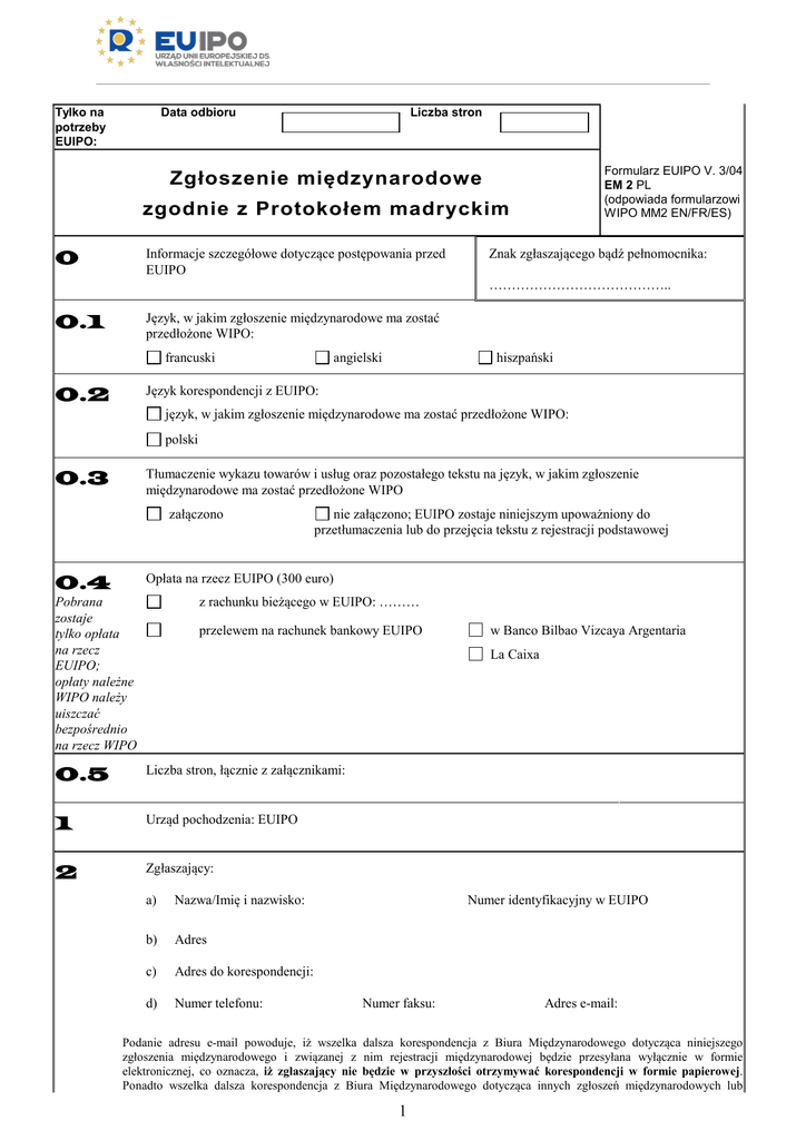 Tylko na potrzeby EUIPO: Data odbioru Liczba stron Zgłoszenie międzynarodowe Formularz EUIPO V. 3/04 EM 2 PL (odpowiada formularzowi WIPO MM2 EN/FR/ES) zgodnie z Protokołem madryckim Informacje szczegółowe dotyczące postępowania przed EUIPO 0 Znak zgłaszającego bądź pełnomocnika: ………………………………….. Język, w jakim zgłoszenie międzynarodowe ma zostać przedłożone WIPO: 0.1 francuski hiszpański angielski Język korespondencji z EUIPO: 0.2 język, w jakim zgłoszenie międzynarodowe ma zostać przedłożone WIPO: polski Tłumaczenie wykazu towarów i usług oraz pozostałego tekstu na język, w jakim zgłoszenie międzynarodowe ma zostać przedłożone WIPO 0.3 załączono nie załączono; EUIPO zostaje niniejszym upoważniony do przetłumaczenia lub do przejęcia tekstu z rejestracji podstawowej Opłata na rzecz EUIPO (300 euro) 0.4 z rachunku bieżącego w EUIPO: ……… Pobrana zostaje tylko opłata na rzecz EUIPO; opłaty należne WIPO należy uiszczać bezpośrednio na rzecz WIPO przelewem na rachunek bankowy EUIPO w Banco Bilbao Vizcaya Argentaria La Caixa 0.5 Liczba stron, łącznie z załącznikami: 1 Urząd pochodzenia: EUIPO 2 Zgłaszający: a) Nazwa/Imię i nazwisko: b) Adres c) Adres do korespondencji: d) Numer telefonu: Numer identyfikacyjny w EUIPO Numer faksu: Adres e-mail: Podanie adresu e-mail powoduje, iż wszelka dalsza korespondencja z Biura Międzynarodowego dotycząca niniejszego zgłoszenia międzynarodowego i związanej z nim rejestracji międzynarodowej będzie przesyłana wyłącznie w formie elektronicznej, co oznacza, iż zgłaszający nie będzie w przyszłości otrzymywać korespondencji w formie papierowej. Ponadto wszelka dalsza korespondencja z Biura Międzynarodowego dotycząca innych zgłoszeń międzynarodowych lub 1 rejestracji międzynarodowych, dla których podany został lub zostanie ten sam adres e-mail, również będzie przesyłana wyłącznie w formie elektronicznej. Uwaga: dla każdej rejestracji międzynarodowej można podać tylko jeden adres e-mail do celów komunikacji elektronicznej. e) Preferowany język korespondencji z WIPO: f) Inne informacje (wymagane przez niektóre wskazane umawiające się strony; podanie takich informacji jest konieczne np. w przypadku wskazania Stanów Zjednoczonych Ameryki Północnej): angielski francuski hiszpański i) w przypadku, gdy zgłaszający jest osobą fizyczną: obywatelstwo zgłaszającego ii) w przypadku, gdy zgłaszający jest osobą prawną, - status prawny jednostki posiadającej osobowość prawną: - państwo (bądź, w danym przypadku, obszar administracyjny wewnątrz państwa), którego prawu podlega osoba prawna: Podstawa prawna do złożenia wniosku: 3 a) zgłaszający jest obywatelem jednego z państw członkowskich Unii Europejskiej, a mianowicie: b) zgłaszający posiada i) miejsce zamieszkania lub siedzibę w państwie członkowskim UE ii) rzeczywiste i poważne przedsiębiorstwo przemysłowe lub handlowe w państwie członkowskim UE Adres (jeśli inny od podanego w pkt 2 lit. b)): …………………………………………………………………………. …………………………………………………………………………. 4a Pełnomocnik wyznaczony do reprezentacji przed Biurem Międzynarodowym: Nazwa/Imię i nazwisko: Adres: Numer telefonu: Numer faksu: Adres e-mail: Podanie adresu e-mail powoduje, iż wszelka dalsza korespondencja z Biura Międzynarodowego dotycząca niniejszego zgłoszenia międzynarodowego i związanej z nim rejestracji międzynarodowej będzie przesyłana wyłącznie w formie elektronicznej, co oznacza, iż zgłaszający nie będzie w przyszłości otrzymywać korespondencji w formie papierowej. Ponadto wszelka dalsza korespondencja z Biura Międzynarodowego dotycząca innych zgłoszeń międzynarodowych lub rejestracji międzynarodowych, dla których podany został lub zostanie ten sam adres e-mail, również będzie przesyłana wyłącznie w formie elektronicznej. Uwaga: dla każdej rejestracji międzynarodowej można podać tylko jeden adres e-mail do celów komunikacji elektronicznej. 4b Pełnomocnik wyznaczony do reprezentacji przed EUIPO: uprzednio wskazany w zgłoszeniu podstawowym/rejestracji podstawowej nowo wyznaczony: 2 Nazwa/Imię i nazwisko: Numer identyfikacyjny w EUIPO: Adres: 5 Zgłoszenie podstawowe lub rejestracja podstawowa: Zgłoszenie międzynarodowe sporządzono na podstawie zgłoszenia podstawowego: Numer: Data dokonania zgłoszenia: (DD/MM/RRRR) rejestracji podstawowej: Numer: Data rejestracji: (DD/MM/RRRR) zarejestrowanego znaku towarowego Unii Europejskiej w rozumieniu rejestracji podstawowej, w chwili rejestracji zgłoszenia znaku towarowego Unii Europejskiej (art. 146 ust. 2 RZTUE): Numer zgłoszenia znaku towarowego Unii Europejskiej: Data rejestracji znaku towarowego Unii Europejskiej: zostanie dodana przez EUIPO) 6 Zastrzegane pierwszeństwo: Zgłaszający zastrzega pierwszeństwo z następującego wcześniejszego zgłoszenia: Urząd, w którym dokonano poprzedniego zgłoszenia: Numer poprzedniego zgłoszenia (jeśli jest dostępny): (DD/MM/RRRR) Data poprzedniego zgłoszenia: W przypadku gdy zgłaszający zastrzega pierwszeństwo tylko w stosunku do niektórych towarów i usług podanych w pkt 10, należy poniżej podać towary i usługi, których dotyczy zastrzegane pierwszeństwo: ............................................................................................................................................. ..................................................... ............................................................................................................................................. ..................................................... Jeżeli zastrzegana jest większa liczba praw pierwszeństwa, należy zaznaczyć niniejsze pole i podać informacje dotyczące poszczególnych zastrzeganych praw na arkuszu dodatkowym. 7 Przedstawienie