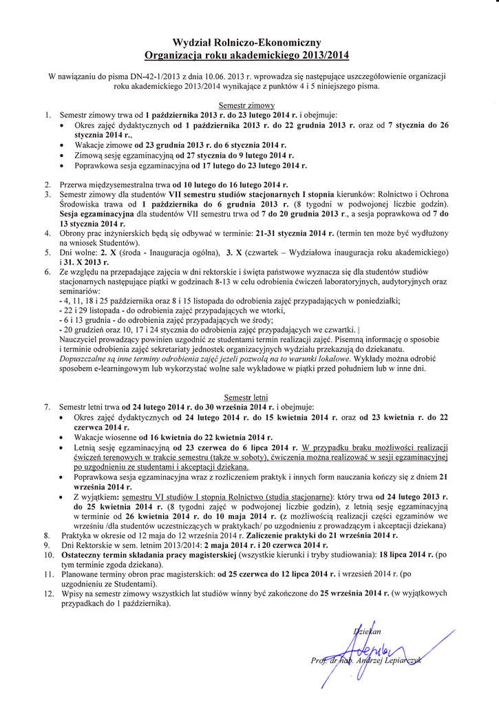 Wydział Rolniczo-Ekonomiczny Oreanizacia roku akademickieeo 2013/2014 W nawiązaniu do pisma DN-42-ll20l3 z dnta 10.06. 20l3 r. wprowadza się następujące uszczegółowienie organizacji roku akademickiego 20l3l20l4 wynikające z punktów 4 i 5 niniejszego pisma. l. Semestr zimowy trwa od . o C r 2. J. 4. okęs zajęć dydaktycznych od stycznia 2014 r., 6. l Semestr zimowy 2013 r. do 23 lutego 2014 r. i obejmuje: października 20t3 r. do 22 grudnia 2013 r. oraz od 7 stycznia do 26 Wakacje zimowe od 23 grudnia 2013 r. do 6 stycznia 2014 r. Zimowąsesję egzaminacyjną od 27 stycznia do 9 lutego 2014 r. Poprawkowa sesja egzaminacyjna od 17 lutego do 23 lutego 2014 r. Przęrwa międzysemestralna trwa od 10 lutego do 16 lutego 2014 r. Semestr zimowy dla studentów VII semestru studiów stacjonarnych I stopnia kierunków: Rolnictwo i ochrona Srodowiska trawa od t października do ó grudnia 2013 r. (8 tygodni w podwojonej liczbie godzin). Sesja egzaminacyjna dla studentów VII semestru trwa od 7 do 20 grudnia 2013 r., a sesja poprawkowa od 7 do 13 stycznia 2014 r. obrony prac inzynierskich będą się odbywać w terminie: 21_31 stycznia 2014 r. (termin ten moze być wydłuzony na wniosek Studentów). 5. t października Dni wolne: 2. i 31. X 2013 r. X (środa- Inauguracja ogólna), 3. X (czwartek - Wydziałowa inauguracja roku akademickiego) Ze względu na przepadające zajęcia w dni rektorskie i świętapaństwowe wyznacza się dla studentów studiów stacjonarnych następujące piątki w godzinach 8-l3 w celu odrobięniaćwiczeń laboratoryjnych, audytoryjnychoraz seminariów: - 4, 7l, 1 8 i 25 paździemika oruz 8 i 15 listopada do odrobienia zajęć przypadających w poniedziałki; - 22 i29 listopada - do odrobienia zajęć przypadających we wtorki, - 6 i 13 grudnia - do odrobieniazajęćprzypadających we środy; - 20 grudzień oraz l0, |7 i24 stycznia do odrobięnia zajęć przypadających we czwartki. Nauczyciel prowadzący powinien uzgodnić ze studentami termin realizacji zajęć. Pisemną informację o sposobie i terminie odrobienia zajęć sekretariatyjednostek organizacyjnych wydziałuprzekazujądo dziekanatu. Dopuszczalne są inne terminy odrobienia zajęć jeżeli ponuolą ną to wąrunki lokąlowe. Wykłady moŻna odrobić I sposobem e-learningowym lub wykorzystać wolne sale wykładowe w piątki przed południem lub w inne dni. 7 . Semestr letni Semestr letni trwa od 24 lutego 2014 r. do 30 września 20t4 r. i obejmuje: o okes . o o . 8. 9' l0. l l. 12. zajęć dydaktycznych od 24 lutego 2014 r. do 15 kwietnia Ż0l4 r. oraz od 23 kwietnia r. do 22 czerwca 2014 r. Wakacje wiosenne od l6 kwietnia do 2Ż kwietnia 20t4 r. Letnią sesję egzaminacyjną od 23 czerwca do 6 lipca 2014 r. W prz},padku braku mozliwości realizacji ćwiczeń terenow}'ch w trakcie semestru (także w sobotv). ćwiczęnia można realizować w sesji egzaminacyjnęj po uzgodnieniu ze studentami i akceptacji dziekana. Poprawkowa sesja egzaminacyjnawrazzrozliczeniem praktyk i innych form nauczaniakończy się z dniem 21 września 20t4 r. Z wyjątkiem: semestru VI studiów I stopnia Rolnictwo (studia stacjonarne): który trwa od 24 lutego 20|3 r. do 25 kwietnia 2014 r. (8 tygodni zajęć w podwojonej liczbie godzin), z letnią sesję egzaminacyjną w tęrminie od 26 kwietnia 20t4 r. do l0 maja 2014 r. (z moŻliwościąrealizacji części egzaminów we wrześniu/dla studentów uczestniczących w praktykach/ po uzgodnieniuzprowadzącym i akceptacji dziekana) Praktyka w okęsię od 12 maja do 12 września2}|4 r. Zaliczenie praktyki do 21 września 2014 r. Dni Rektorskie w sem. letnim 20l3l20l4: 2 maja Ż0t4 r. i 20 czerwca 2014 r. Ostateczny termin składania pracy magisterskiej (wszystkie kierunki i tryby studiowania): l8 lipca 2014 r. (po tym terminie zgoda dziekana). Planowane terminy obron prac magisterskich: od 25 czerwca do 12 lipca 20|4 r, i wrzesień 2014 r. (po uzgodnieniu ze Studentami). Wpisy na SęmęStr zimowy wszystkich lat studiów winny być zakoi'tczone do 25 wrzeŚnia 2014 r. (w wyjątkowych przypadkach do 1 października).