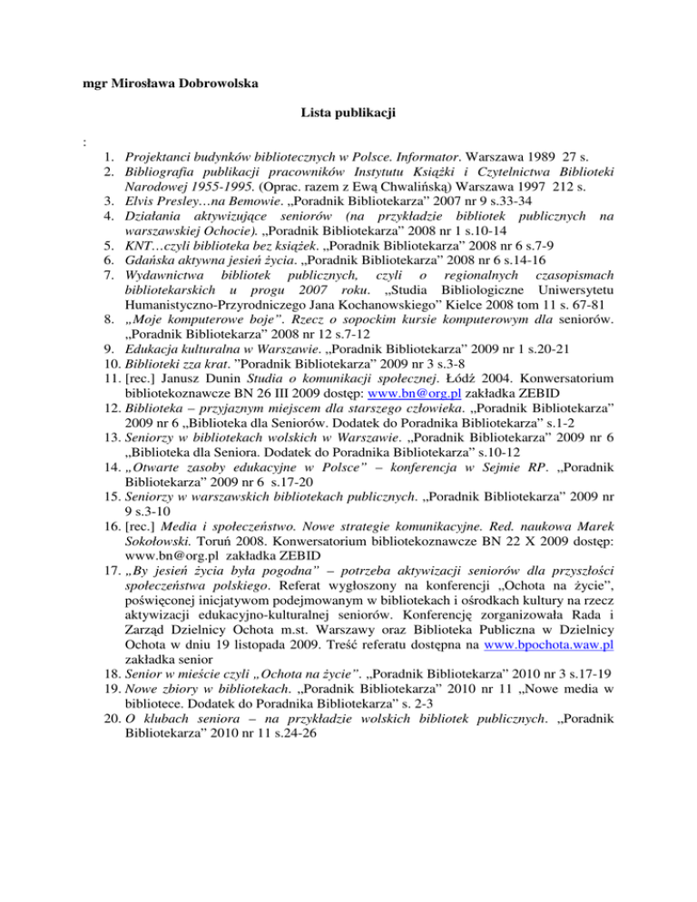 mgr Mirosława Dobrowolska Lista publikacji : 1. Projektanci budynków bibliotecznych w Polsce. Informator. Warszawa 1989 27 s. 2. Bibliografia publikacji pracowników Instytutu Książki i Czytelnictwa Biblioteki Narodowej 1955-1995. (Oprac. razem z Ewą Chwalińską) Warszawa 1997 212 s. 3. Elvis Presley…na Bemowie. „Poradnik Bibliotekarza” 2007 nr 9 s.33-34 4. Działania aktywizujące seniorów (na przykładzie bibliotek publicznych na warszawskiej Ochocie). „Poradnik Bibliotekarza” 2008 nr 1 s.10-14 5. KNT…czyli biblioteka bez książek. „Poradnik Bibliotekarza” 2008 nr 6 s.7-9 6. Gdańska aktywna jesień życia. „Poradnik Bibliotekarza” 2008 nr 6 s.14-16 7. Wydawnictwa bibliotek publicznych, czyli o regionalnych czasopismach bibliotekarskich u progu 2007 roku. „Studia Bibliologiczne Uniwersytetu Humanistyczno-Przyrodniczego Jana Kochanowskiego” Kielce 2008 tom 11 s. 67-81 8. „Moje komputerowe boje”. Rzecz o sopockim kursie komputerowym dla seniorów. „Poradnik Bibliotekarza” 2008 nr 12 s.7-12 9. Edukacja kulturalna w Warszawie. „Poradnik Bibliotekarza” 2009 nr 1 s.20-21 10. Biblioteki zza krat. ”Poradnik Bibliotekarza” 2009 nr 3 s.3-8 11. [rec.] Janusz Dunin Studia o komunikacji społecznej. Łódź 2004. Konwersatorium bibliotekoznawcze BN 26 III 2009 dostęp: [email protected] zakładka ZEBID 12. Biblioteka – przyjaznym miejscem dla starszego człowieka. „Poradnik Bibliotekarza” 2009 nr 6 „Biblioteka dla Seniorów. Dodatek do Poradnika Bibliotekarza” s.1-2 13. Seniorzy w bibliotekach wolskich w Warszawie. „Poradnik Bibliotekarza” 2009 nr 6 „Biblioteka dla Seniora. Dodatek do Poradnika Bibliotekarza” s.10-12 14. „Otwarte zasoby edukacyjne w Polsce” – konferencja w Sejmie RP. „Poradnik Bibliotekarza” 2009 nr 6 s.17-20 15. Seniorzy w warszawskich bibliotekach publicznych. „Poradnik Bibliotekarza” 2009 nr 9 s.3-10 16. [rec.] Media i społeczeństwo. Nowe strategie komunikacyjne. Red. naukowa Marek Sokołowski. Toruń 2008. Konwersatorium bibliotekoznawcze BN 22 X 2009 dostęp: [email protected] zakładka ZEBID 17. „By jesień życia była pogodna” – potrzeba aktywizacji seniorów dla przyszłości społeczeństwa polskiego. Referat wygłoszony na konferencji „Ochota na życie”, poświęconej inicjatywom podejmowanym w bibliotekach i ośrodkach kultury na rzecz aktywizacji edukacyjno-kulturalnej seniorów. Konferencję zorganizowała Rada i Zarząd Dzielnicy Ochota m.st. Warszawy oraz Biblioteka Publiczna w Dzielnicy Ochota w dniu 19 listopada 2009. Treść referatu dostępna na www.bpochota.waw.pl zakładka senior 18. Senior w mieście czyli „Ochota na życie”. „Poradnik Bibliotekarza” 2010 nr 3 s.17-19 19. Nowe zbiory w bibliotekach. „Poradnik Bibliotekarza” 2010 nr 11 „Nowe media w bibliotece. Dodatek do Poradnika Bibliotekarza” s. 2-3 20. O klubach seniora – na przykładzie wolskich bibliotek publicznych. „Poradnik Bibliotekarza” 2010 nr 11 s.24-26