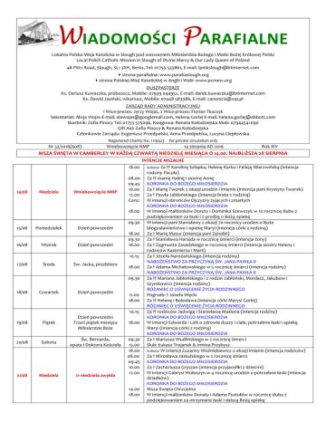 WIADOMOŚCI PARAFIALNE Lokalna Polska Misja Katolicka w Slough pod wezwaniem Miłosierdzia Bożego i Matki Bożej Królowej Polski Local Polish Catholic Mission in Slough of Divine Mercy & Our Lady Queen of Poland 48 Pitts Road, Slough, SL1 3XH, Berks, Tel: 01753 533861, E-mail: [email protected] strona parafialna: www.parafiaslough.org strona Polskiej Misji Katolickiej w Anglii i Walii: www.pcmew.org DUSZPASTERZE Ks. Dariusz Kuwaczka, proboszcz, Mobile: 07939 044952, E-mail: [email protected] Ks. Dawid Jasiński, wikariusz, Mobile: 07448 583386, E-mail: [email protected] ZARZĄD RADY ADMINISTRACYJNEJ 1 Wice-prezes: Jerzy Wojas, 2 Wice-prezes: Florian Tkaczyk Sekretariat: Alicja Wojas E-mail: [email protected], Helena Gorlej E-mail: [email protected] Skarbnik: Zofia Pinocy Tel: 01753 575096, Księgowa: Renata Kołodziejska Mob: 07944541090 Gift Aid: Zofia Pinocy & Renata Kołodziejska Członkowie Zarządu: Eugeniusz Przedpełski, Anna Przedpełska, Lucyna Ciepłowska Registered Charity No. 1119423 Nr 32/2016(608) Wniebowzięcie NMP for private circulation only 14 sierpnia AD 2016 Rok XIV MSZA ŚWIĘTA W CAMBERLEY W KAŻDĄ CZWARTĄ NIEDZIELĘ MIESIĄCA O 14.00. NAJBLIŻSZA 28 SIERPNIA INTENCJE MSZALNE 18.00 14/08 Niedziela Wniebowzięcie NMP 08.00 09.45 10.00 12.00 Conc: 18.00 09.30 15/08 16/08 Poniedziałek Wtorek Dzień powszedni Dzień powszedni 18.00 09.30 18.00 10.15 17/08 Środa Św. Jacka, prezbitera 18.00 09.30 18/08 Czwartek Dzień powszedni 19/08 Piątek Dzień powszedni Trzeci piątek miesiąca Miłosierdzie Boże 20/08 Sobota Św. Bernarda, opata i Doktora Kościoła 21/08 Niedziela 21 niedziela zwykła 11.00 18.00 10.15 18.00 09.30 15.00 18.00 08.00 09.45 10.00 12.00 14.00 18.00 Sobota: Za †† Karolinę Szłapka, Helenę Karko i Felicję Mierzwińską (intencja rodziny Pacuła) Za †† mamę Halinę i siostrę Annę KORONKA DO BOŻEGO MIŁOSIERDZIA Za † Marię Tworek z okazji urodzin i imienin (intencja pani Krystyny Tworek) Za † Pawła Jabłońskiego (intencja brata z rodziną) W intencji obrońców Ojczyzny żyjących i zmarłych KORONKA DO BOŻEGO MIŁOSIERDZIA W intencji małżonków Doroty i Dominika Szewczyk w 10 rocznicę ślubu z podziękowaniem za łaski i z prośbą o Bożą opiekę W intencji pani Stanisławy z okazji 70 rocznicy urodzin o Boże błogosławieństwo i opiekę Maryi (intencja córki z rodziną) Za † Marię Mazur (intencja pani Zenobii) Za † Stanisława Harajda w rocznicę śmierci (intencja żony) Za † Zygmunta Zasadzkiego w rocznicę śmierci (intencja siostry Heleny i rodziców Kazimierza i Marii) Za † Józefa Narożańskiego (intencja rodziny) NABOŻEŃSTWO ZA PRZYCZYNĄ ŚW. JANA PAWŁA II Za † Adama Michałowskiego w 5 rocznicę śmierci (intencja rodziny) NABOŻEŃSTWO ZA PRZYCZYNĄ ŚW. JANA PAWŁA II Za †† Mariana Jabłońskiego i z rodzin Jabłoński, Mordacz, Jakubow i Szymkowicz (intencja rodziny) RÓŻANIEC O UŚWIĘCENIE ŻYCIA RODZINNEGO Pogrzeb: † Józefa Węcki Za †† Helenę i Bolesława (intencja córki Marysi Gorlej) RÓŻANIEC O UŚWIĘCENIE ŻYCIA RODZINNEGO Za †† rodziców Jadwigę i Stanisława Maślona (intencja rodziny) KORONKA DO BOŻEGO MIŁOSIERDZIA W intencji Edwarda i Lidii o zdrowie duszy i ciała, potrzebne łaski i opiekę Maryi (intencja córki z rodziną) KORONKA DO BOŻEGO MIŁOSIERDZIA Za † Mariusza Wudlińskiego w 2 rocznicę śmierci Ślub: Łukasz Trojanek & Irmina Przybysz Sobota: W intencji Zuzanny Woźniakiewicz z okazji imienin (intencja rodziców) Za † Mirosława Jaskulskiego w 2 rocznicę śmierci KORONKA DO BOŻEGO MIŁOSIERDZIA Za † Zachariusza Gryszan (intencja przyjaciółki z dziećmi) W intencji Gabrysi Wołoszyn w 4 rocznicę urodzin o potrzebne łaski (intencja dziadków) KORONKA DO BOŻEGO MIŁOSIERDZIA Msza Święta Chrzcielna W intencji małżonków Donaty i Adama Pustułów w rocznicę ślubu z podziękowaniem za otrzymane łaski i dalszą Bożą opiekę ADORACJA NAJŚWIĘTSZEGO SAKRAMENTU ADORATION OF THE HOLY SACRAMENT czwartek: po Mszy Świętej wieczornej do 19.30 modlitwa w ciszy; 19.30 – 20.30 Różaniec i Koronka w języku angielskim Thursday: after evening Mass adoration in silence till 7.30 pm & 7.30 – 8.30 pm Rosary and Divine Mercy in English sobota: 17.00 – 18.00 Saturday: 5 – 6 pm BEZPOŚREDNIE PRZYGOTOWANIE DO MAŁŻEŃSTWA ROK 2016 Program spotkań przygotowania do małżeństwa na rok 2016 jest następujący: • trzecia seria 06/10 (czwartek o 20.00); 09/10 (niedziela o 19.00); 13/10 (czwartek o 20.00) Zgłoszenia do udziału w kursie podczas pierwszego wieczoru. Narzeczeni podczas zgłoszeń wpłacają £20.00. SAKRAMENT POJEDNANIA I POKUTY Każdego dnia pół godziny przed Mszą Świętą, a w każdą sobotę i pierwszy piątek miesiąca od 17.00 do 17.50 okazja do skorzystania z sakramentu pojednania i pokuty. Bardzo prosimy, aby nie przychodzić na parę minut przed Mszą Świętą. PAPIESKIE INTECJE APOSTOLSTWA MODLITWY W SIERPNIU INTENCJA OGÓLNA: Aby sport był okazją do braterskiego spotkania między narodami i przyczyniał się do sprawy pokoju na świecie. INTENCJA EWANGELIZACYJNA: Aby chrześcijanie żyli zgodnie z Ewangelią, dając świadectwo wiary, uczciwości i miłości bliźniego. CHÓRY Męski i żeński: czwartek od 20.30 do 22.00 Schola: czwartek od 21.00 do 22.30 Chór rodzinny: Pociąg do nieba piątek o 18.30 w kawiarence POLSKIE HARCERSTWO Piątki 18.30 – 20:30 Stowarzyszenie Polskie SPOTKANIA GRUPA (AA) ANONIMOWYCH ALKOHOLIKÓW Nowy Świat – poniedziałek i piątek o 20.00 Kontakt: Tomek 07502206041 MS Nowy Rejs – niedziela 14,00 Kontakt: Michał 07825298842 Małgorzata 07990289769 GRUPA RODZINNA AL-ANON „WIKTORIA” spotkania w każdy wtorek o 19.00. Kontakty: pani Agnieszka: 07894536677, pani Ewa: 07791327119 BIBLIOTEKA Każda niedziela 8.00 – 10.00; 13.00 – 13.30; 19.00 – 19.30. SPRAWY AKTUALNE UROCZYSTOŚĆ WNIEBOWZIĘCIA NMP Słowo Rektora PMK Ks. prałata Stefana Wylężka Dziś urocz