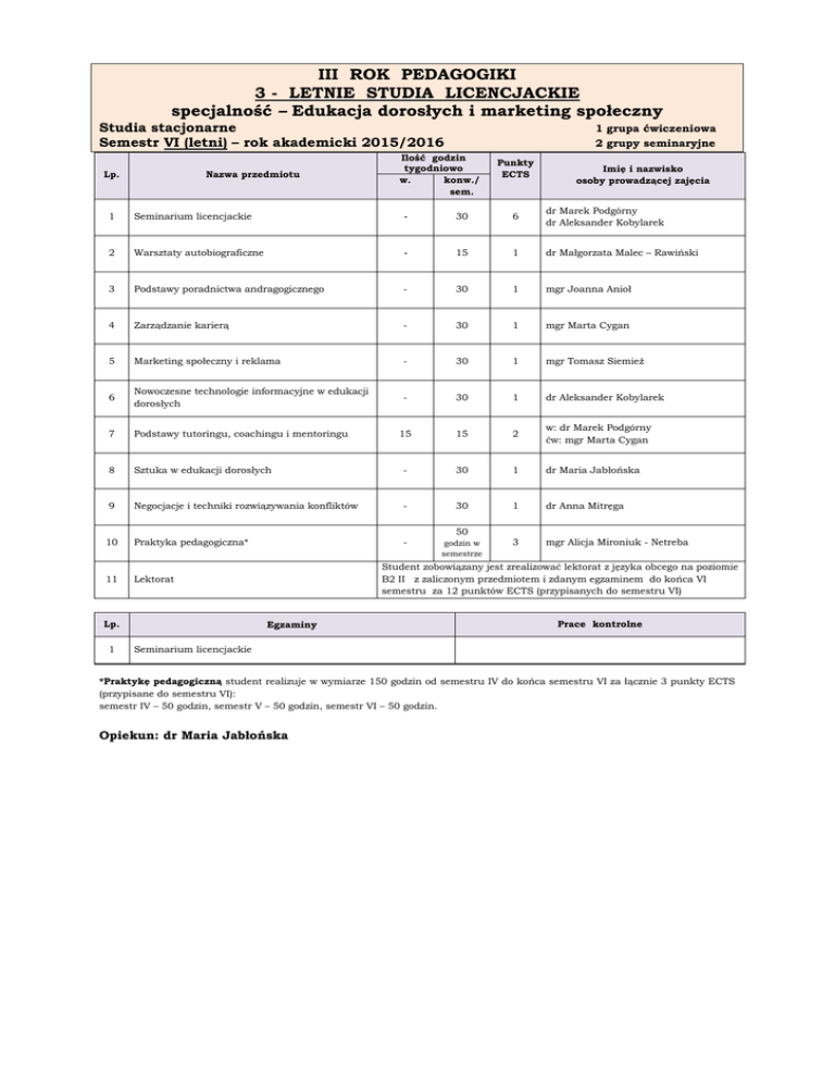 III ROK PEDAGOGIKI 3 - LETNIE STUDIA LICENCJACKIE specjalność – Edukacja dorosłych i marketing społeczny Studia stacjonarne Semestr VI (letni) – rok akademicki 2015/2016 Lp. Nazwa przedmiotu 1 grupa ćwiczeniowa 2 grupy seminaryjne Ilość godzin tygodniowo w. konw./ sem. Punkty ECTS Imię i nazwisko osoby prowadzącej zajęcia 1 Seminarium licencjackie - 30 6 dr Marek Podgórny dr Aleksander Kobylarek 2 Warsztaty autobiograficzne - 15 1 dr Małgorzata Malec – Rawiński 3 Podstawy poradnictwa andragogicznego - 30 1 mgr Joanna Anioł 4 Zarządzanie karierą - 30 1 mgr Marta Cygan 5 Marketing społeczny i reklama - 30 1 mgr Tomasz Siemież 6 Nowoczesne technologie informacyjne w edukacji dorosłych - 30 1 dr Aleksander Kobylarek 7 Podstawy tutoringu, coachingu i mentoringu 15 15 2 w: dr Marek Podgórny ćw: mgr Marta Cygan 8 Sztuka w edukacji dorosłych - 30 1 dr Maria Jabłońska 9 Negocjacje i techniki rozwiązywania konfliktów - 30 1 dr Anna Mitręga 10 Praktyka pedagogiczna* - godzin w semestrze 3 mgr Alicja Mironiuk - Netreba 11 Lektorat Lp. 1 50 Student zobowiązany jest zrealizować lektorat z języka obcego na poziomie B2 II z zaliczonym przedmiotem i zdanym egzaminem do końca VI semestru za 12 punktów ECTS (przypisanych do semestru VI) Egzaminy Prace kontrolne Seminarium licencjackie *Praktykę pedagogiczną student realizuje w wymiarze 150 godzin od semestru IV do końca semestru VI za łącznie 3 punkty ECTS (przypisane do semestru VI): semestr IV – 50 godzin, semestr V – 50 godzin, semestr VI – 50 godzin. Opiekun: dr Maria Jabłońska