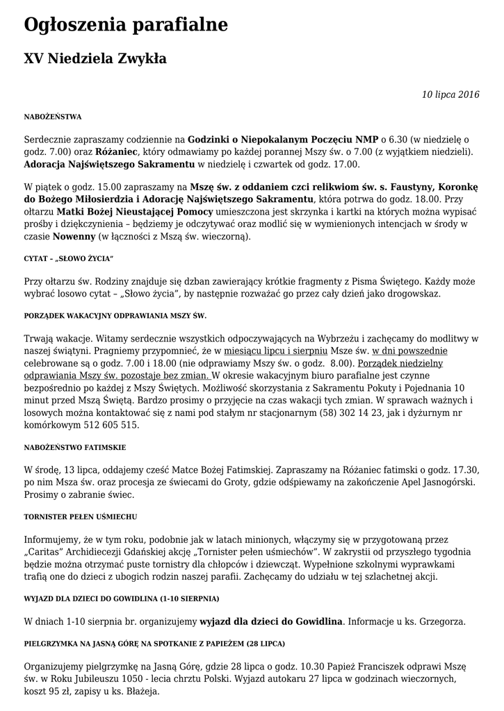 Ogłoszenia parafialne XV Niedziela Zwykła 10 lipca 2016 NABOŻEŃSTWA Serdecznie zapraszamy codziennie na Godzinki o Niepokalanym Poczęciu NMP o 6.30 (w niedzielę o godz. 7.00) oraz Różaniec, który odmawiamy po każdej porannej Mszy św. o 7.00 (z wyjątkiem niedzieli). Adoracja Najświętszego Sakramentu w niedzielę i czwartek od godz. 17.00. W piątek o godz. 15.00 zapraszamy na Mszę św. z oddaniem czci relikwiom św. s. Faustyny, Koronkę do Bożego Miłosierdzia i Adorację Najświętszego Sakramentu, która potrwa do godz. 18.00. Przy ołtarzu Matki Bożej Nieustającej Pomocy umieszczona jest skrzynka i kartki na których można wypisać prośby i dziękczynienia – będziemy je odczytywać oraz modlić się w wymienionych intencjach w środy w czasie Nowenny (w łączności z Mszą św. wieczorną). CYTAT – „SŁOWO ŻYCIA” Przy ołtarzu św. Rodziny znajduje się dzban zawierający krótkie fragmenty z Pisma Świętego. Każdy może wybrać losowo cytat – „Słowo życia”, by następnie rozważać go przez cały dzień jako drogowskaz. PORZĄDEK WAKACYJNY ODPRAWIANIA MSZY ŚW. Trwają wakacje. Witamy serdecznie wszystkich odpoczywających na Wybrzeżu i zachęcamy do modlitwy w naszej świątyni. Pragniemy przypomnieć, że w miesiącu lipcu i sierpniu Msze św. w dni powszednie celebrowane są o godz. 7.00 i 18.00 (nie odprawiamy Mszy św. o godz. 8.00). Porządek niedzielny odprawiania Mszy św. pozostaje bez zmian. W okresie wakacyjnym biuro parafialne jest czynne bezpośrednio po każdej z Mszy Świętych. Możliwość skorzystania z Sakramentu Pokuty i Pojednania 10 minut przed Mszą Świętą. Bardzo prosimy o przyjęcie na czas wakacji tych zmian. W sprawach ważnych i losowych można kontaktować się z nami pod stałym nr stacjonarnym (58) 302 14 23, jak i dyżurnym nr komórkowym 512 605 515. NABOŻEŃSTWO FATIMSKIE W środę, 13 lipca, oddajemy cześć Matce Bożej Fatimskiej. Zapraszamy na Różaniec fatimski o godz. 17.30, po nim Msza św. oraz procesja ze świecami do Groty, gdzie odśpiewamy na zakończenie Apel Jasnogórski. Prosimy o zabranie świec. TORNISTER PEŁEN UŚMIECHU Informujemy, że w tym roku, podobnie jak w latach minionych, włączymy się w przygotowaną przez „Caritas” Archidiecezji Gdańskiej akcję „Tornister pełen uśmiechów”. W zakrystii od przyszłego tygodnia będzie można otrzymać puste tornistry dla chłopców i dziewcząt. Wypełnione szkolnymi wyprawkami trafią one do dzieci z ubogich rodzin naszej parafii. Zachęcamy do udziału w tej szlachetnej akcji. WYJAZD DLA DZIECI DO GOWIDLINA (1-10 SIERPNIA) W dniach 1-10 sierpnia br. organizujemy wyjazd dla dzieci do Gowidlina. Informacje u ks. Grzegorza. PIELGRZYMKA NA JASNĄ GÓRĘ NA SPOTKANIE Z PAPIEŻEM (28 LIPCA) Organizujemy pielgrzymkę na Jasną Górę, gdzie 28 lipca o godz. 10.30 Papież Franciszek odprawi Mszę św. w Roku Jubileuszu 1050 - lecia chrztu Polski. Wyjazd autokaru 27 lipca w godzinach wieczornych, koszt 95 zł, zapisy u ks. Błażeja. PRASA KATOLICKA Zachęcamy do nabycia i czytania prasy katolickiej - w sposób szczególny nowego numeru „Gościa niedzielnego” oraz naszego parafialnego biuletynu. PODZIĘKOWANIA Składamy serdeczne podziękowania za wszelkie złożone ofiary, szczególnie za złożone dzisiaj na nasze potrzeby inwestycyjne i spłatę naszych parafialnych zobowiązań oraz za wpłaty przekazane na nasze konto parafialne w banku. Za tydzień możemy wesprzeć dzieci i młodzież z naszej Parafii, które pragną wyjechać na kolonie organizowane przez Caritas Archidiecezji Gdańskiej. Dziękujemy Wszystkim za pomoc i życzliwość. ŻYCZENIA W liturgii tego tygodnia: w poniedziałek święto św. Benedykta, we wtorek Wspomnienie św. Brunona Bonifacego z Kwerfurtu, w środę Św. Pustelników Andrzeja Świerada i Benedykta, w piątek Św. Bonawentury, a w sobotę MB Szkaplerznej – tego dnia uroczystość odpustowa u Ojców Karmelitów w kościele Św. Katarzyny. Wszystkim Solenizantom i Jubilatom składamy najserdeczniejsze życzenia i w modlitwie polecamy opiece Maryi oraz świętych Patronów. Zapraszamy również na naszą stronę internetową - www.chrystuskrol.diecezja.gda.pl. Zachęcamy do wpisywania intencji (prośby i dziękczynienia) – odczytujemy je w każdą środę w czasie Nowenny. KRONIKA ŻAŁOBNA Naszym zwyczajem na zakończenie niedzielnej Eucharystii pomódlmy się zmarłego w minionym tygodniu: Helena Firyn l.89 Marian Ejsmont l.81 Mirosław Załecki l.60 Donata Madany Kuczmarska l.85. Polećmy zmarłych Duszpasterzy, Siostry zakonne, Wszystkich posługujących niegdyś w naszej Parafii, zmarłych Dobrodziejów [i polecanych w tej Mszy św. NN], a także zmarłych z naszych Rodzin. Wieczny odpoczynek... Witając przybyłych do nas Gości, dziękujemy za wspólną modlitwę i życzymy wszystkim radosnego i owocnego przeżywania Dnia Pańskiego oraz udanego tygodnia.