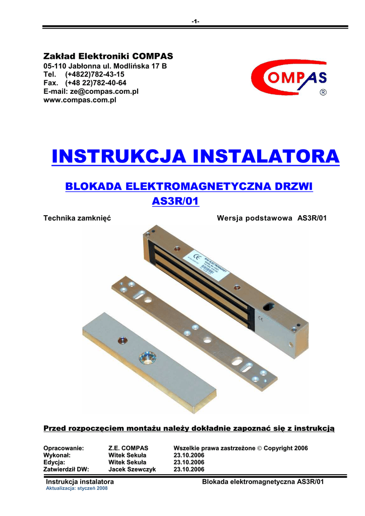 -1- Zakład Elektroniki COMPAS 05-110 Jabłonna ul. Modlińska 17 B Tel. (+4822)782-43-15 Fax. (+48 22)782-40-64 E-mail: [email protected] www.compas.com.pl INSTRUKCJA INSTALATORA BLOKADA ELEKTROMAGNETYCZNA DRZWI AS3R/01 Technika zamknięć Wersja podstawowa AS3R/01 Przed rozpoczęciem montaŜu naleŜy dokładnie zapoznać się z instrukcją Opracowanie: Wykonał: Edycja: Zatwierdził DW: Z.E. COMPAS Witek Sekuła Witek Sekuła Jacek Szewczyk Instrukcja instalatora Aktualizacja: styczeń 2008 Wszelkie prawa zastrzeŜone Copyright 2006 23.10.2006 23.10.2006 23.10.2006 Blokada elektromagnetyczna AS3R/01 -2- SPIS TREŚCI 1. Opis ogólny strona 3 1.1 Dane techniczne strona 3 2. Sposób montaŜu AS3R/01 strona 3 2.1 Elementy podstawowego zestawu montaŜowego strona 4 2.2 Instalacja mechaniczna AS3R/01 strona 5 2.2.1 Sposób instalacji zwory na drzwiach jedno i dwuskrzydłowych strona 7 2.2.2 MontaŜ zwory strona 8 2.2.3 MontaŜ elektromagnesu strona 8 3. MontaŜ elektryczny strona 9 4. Uwagi i zalecenia strona 9 5. Konserwacja strona 10 6. Ograniczenie gwarancji strona 11 7. Karta gwarancyjna strona 11 Instrukcja instalatora Aktualizacja: styczeń 2008 Blokada elektromagnetyczna AS3R/01 -3- 1. OPIS OGÓLNY Blokada elektromagnetyczna typ AS3R/01 jest rozwiązaniem techniki zamknięć zamkiem elektromagnetycznym blokującym drzwi, bramy itp. Jest prosta w obsłudze, dostosowana do wszystkich rodzaju drzwi bez konieczności ich przerabiania. Nie posiada elementów ruchomych, przewyŜsza pod względem skuteczności działania dotychczas stosowane zabezpieczenia elektromechaniczne. Jej dwa podstawowe elementy to elektromagnes i zwora. Zestaw podstawowy: elektromagnes, zwora, elementy montaŜu-akcesoria. Standardowo elektromagnes mocuje się za pomocą przekładki na ościeŜnicy, a zworę na drzwiach. W instalacjach wymagających wysokiego zabezpieczenia drzwi powinny być stosowane 2 komplety AS3R/01 1.1 DANE TECHNICZNE • • • • • napięcie zasilania pobór mocy pobór prądu siła trzymania wymiary: elektromagnes zwora 12 VDC lub 24VDC ~ 6 W (12VDC) 0,5 A (12VDC) 250 kg 250×42×25 mm 185x38 x12 mm 2. SPOSÓB MONTAśU AS3R/01 Stosowana jest m.in.: przy drzwiach otwieranych do środka pomieszczenia chronionego. Elektromagnes montowany jest na ścianie lub ościeŜnicy nad drzwiami, a do drzwi przymocowany jest zestaw mocujący wraz ze zworą. Zestaw mocujący pozycjonuje zworę przed elektromagnesem. WYMIARY ELEKTROMAGNESU i ZWORY Instrukcja instalatora Aktualizacja: styczeń 2008 Blokada elektromagnetyczna AS3R/01 -4- 2.1 ELEMENTY PODSTAWOWEGO ZESTAWU MONTAśOWEGO BLOKADY AS3R/01 ELEMENTY MONTAśU – akcesoria 1. Płytka instalacyjna 1 szt. 2. Elektromagnes 1 szt. 3. MosięŜna tuleja 2 szt. 4. Śruba 2 szt. 5. Śruba mocująca 1 szt. 6. Zwora 1 szt. 7. Podkładka gumowa 1 szt. 8. Wkładki prowadzące 4 szt. 9. Podkładki 2 szt. 10. Tuleja drzwiowa 1 szt. 11. Śruba łącząca 1 szt. . Firma „COMPAS" zaleca, aby instalator był wyposaŜony w dodatkowy zestaw elementów instalacyjnych (np. śruby i wkręty) a takŜe dodatkowy osprzęt dostosowany do specyfiki obszaru fizycznego, w którym ma być zamontowana blokada. Instrukcja instalatora Aktualizacja: styczeń 2008 Blokada elektromagnetyczna AS3R/01 -5- 2.2 INSTALACJA MECHANICZNA AS3R/01 Z powodu duŜej róŜnorodności sytuacji, w których blokada drzwi AS3R/01 moŜe być zastosowana, naleŜy najpierw zbadać obszar fizyczny, w którym ma być umieszczona i określić najlepszą metodę jej zamontowania. W tym wstępnym planowaniu brane są pod uwagę dwa względy: - metoda montaŜu musi zapewnić odpowiednią wytrzymałość, aby pełna siła podtrzymująca blokadę drzwi mogła być efektywna. - blokada drzwi i jej okablowanie muszą być w odpowiednim stopniu zabezpieczone przed uszkodzeniem przez intruzów i wandali. Często niezbędne są dodatkowe elementy. Firma „COMPAS" zaleca, aby instalator był wyposaŜony w oddzielny zestaw narzędzi instalacyjnych, który zawiera m.in. specjalne wiertła, a takŜe dodatkowy osprzęt. Jeśli ma być zainstalowanych wiele blokad lub instalator spodziewa się następnych instalacji, polecamy skompletowanie specjalistycznego zestawu narzędzi, który zmniejszy czas montaŜu i polepszy jakość pracy. MONTAś W DRZWIACH OTWIERAJĄCYCH SIĘ NA ZEWNĄTRZ (Rys.1 , 2) Rys.1 MontaŜ w drzwiach otwierających się na zewnątrz Instrukcja instalatora Aktualizacja: styczeń 2008 Blokada elektromagnetyczna AS3R/01 -6- ELEMENTY MONTAśU 1. Framuga 2. Płytka instalacyjna 1 szt. 3. Elektromagnes 2 szt. 4. Drzwi 5. Zwora 1 szt. 6. Podkładki 1 kpl. Rys.2 MontaŜ w drzwiach otwierających się na zewnątrz MONTAś W DRZWIACH OTWIERAJĄCYCH SIĘ DO WEWNĄTRZ (Rys.3 , 4) Rys.3 MontaŜ w drzwiach otwierających się do wewnątrz Instrukcja instalatora Aktualizacja: styczeń 2008 Blokada elektromagnetyczna AS3R/01 -7- ELEMENTY MONTAśU 1. Kątownik AS3R/01/L 1 szt. 2. Framuga 3. Drzwi 4. Płytka instalacyjna 1 szt. 5. Zwora 1 szt. 6. Podkładki 1 kpl. 7. Zetownik AS3R/01/Z 1 kpl. Rys.4 MontaŜ w drzwiach otwierających się do wewnątrz 2.2.1 SPOSÓB INSTALACJI ZWORY NA DRZWIACH JEDNOSKRZYDŁOWYCH I DWUSKRZYDŁOWYCH W przypadku instalacji blokady elektromagnetycznej na drzwiach dwuskrzydłowych naleŜy zastosować dwa zestawy montaŜowe AS3R/01. Instrukcja instalatora Aktualizacja: styczeń 2008 Blokada elektromagnetyczna AS3R/01 -8- 2.2.2 MONTAś ZWORY Zwora powinna być zamontowana przed elektromagnesem w górnym rogu drzwi. Ostateczne umiejscowienie zwory jest dyktowane przez poŜądaną pozycję elektromagnesu. Zwora musi być usytuowana centralnie względem biegunów elektromagnesu - 3 paski. Elektromagnes powinien być przesunięty względem rogu ościeŜnicy tak, aby otwory do montaŜu elektromagnesu nie musiały być wiercone w samym rogu. Kiedy zostało wybrane połoŜenie zwory, trzeba wywiercić w drzwiach otwór, który ma umoŜliwić zamocowanie zwory na drzwiach. NaleŜy nawiercić równieŜ