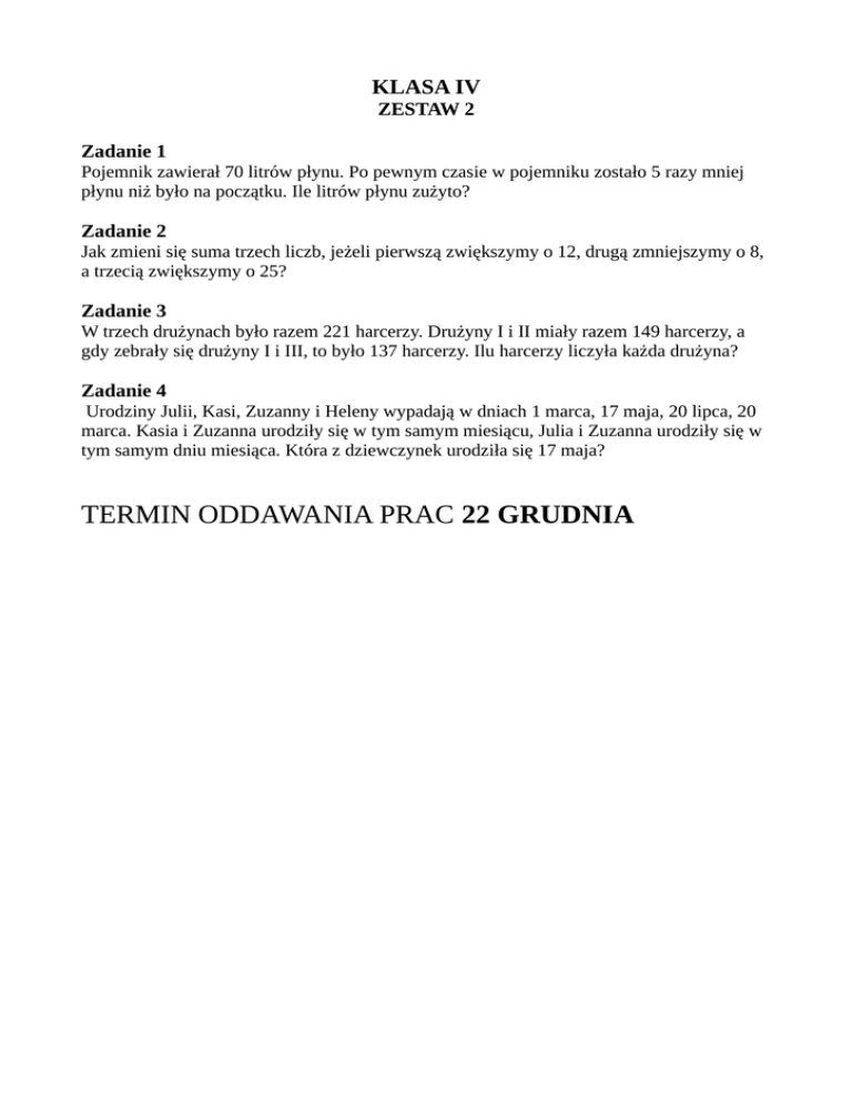 KLASA IV ZESTAW 2 Zadanie 1 Pojemnik zawierał 70 litrów płynu. Po pewnym czasie w pojemniku zostało 5 razy mniej płynu niż było na początku. Ile litrów płynu zużyto? Zadanie 2 Jak zmieni się suma trzech liczb, jeżeli pierwszą zwiększymy o 12, drugą zmniejszymy o 8, a trzecią zwiększymy o 25? Zadanie 3 W trzech drużynach było razem 221 harcerzy. Drużyny I i II miały razem 149 harcerzy, a gdy zebrały się drużyny I i III, to było 137 harcerzy. Ilu harcerzy liczyła każda drużyna? Zadanie 4 Urodziny Julii, Kasi, Zuzanny i Heleny wypadają w dniach 1 marca, 17 maja, 20 lipca, 20 marca. Kasia i Zuzanna urodziły się w tym samym miesiącu, Julia i Zuzanna urodziły się w tym samym dniu miesiąca. Która z dziewczynek urodziła się 17 maja? TERMIN ODDAWANIA PRAC 22 GRUDNIA KLASA V ZESTAW 2 Zadanie 1 Pewien człowiek urodził się w pewną niedzielę 29 lutego. Po ilu latach będzie on obchodził po raz pierwszy urodziny także w niedzielę 29 lutego? Zadanie 2 Obwód prostokąta wynosi 54cm. Jego szerokość jest równa połowie długości. Ile wynosi długość prostokąta? Zadanie 3 Ile najwięcej jednakowych paczek można sporządzić ze 144 czekolad, 180 jabłek i 324 orzechów tak, aby wszystkie produkty były wykorzystane? Po ile czekolad, jabłek, orzechów będzie w każdej takiej paczce? Zadanie 4 Zapytano wędkarza, ile waży złowiona przez niego ryba, na co wędkarz odpowiedział: Waży ona 2 kg i jeszcze 2 razy po 5 1 wagi swojego ciężaru. 5 Oblicz, ile waży ryba. TERMIN ODDAWANIA PRAC 22 GRUDNIA KLASA VI ZESTAW 2 Zadanie 1 Ela przyszła na przyjęcie urodzinowe Ani 5 minut wcześniej niż Staś, lecz 3 minuty później niż Iwona. Iwona pierwsza opuściła przyjęcie. Wyszła 2 minuty wcześniej niż Staś i 5 minut wcześniej niż Ela. Ile minut dłużej od Stasia przebywała na przyjęciu Ela? Zadanie 2 Od poniedziałku do środy Marek zawsze kłamie, w pozostałe dni tygodnia mówi prawdę. Pewnego dnia Marek spotkał Marię i powiedział: „ Wczoraj kłamałem. Od pojutrza przez dwa kolejne dni będę kłamał.” W jakim dniu tygodnia Marek spotkał Marię? Zadanie 3 Kwadrat ma obwód 32dm. Środki dwu kolejnych boków tego kwadratu połączono za sobą i z wierzchołkiem nie należącym do tych boków. Oblicz pole otrzymanego w ten sposób trójkąta. Jaką część pola kwadratu stanowi pole tego trójkąta? Zadanie 4 Sad owocowy ma kształt prostokąta, którego długości boków są w stosunku 2:7. Krótszy bok jest równy 240 metrów. Po ilu dobach obejdzie ten sad dookoła ślimak idący ze średnią prędkością 4 km ? h TERMIN ODDAWANIA PRAC 22 GRUDNIA KLASA I gim ZESTAW 2 Zadanie 1 Liczbę dodatnią b zwiększono o 25%. Następnie otrzymaną liczbę ponownie zwiększono o 25% i otrzymano liczbę r. Oblicz stosunek otrzymanej liczby r do liczby b. Zadanie 2 Pszczelarz stwierdził, że na skutek epidemii wymarło mu 20% pszczół w pasiece. O ile procent powinna wzrosnąć liczba pszczół, żeby liczebność pasieki była taka jak przed epidemią? Zadanie 3 Wyznacz wszystkie liczby całkowite m, które spełniają podany warunek. a) −3 √ 2 < m < 3 √ 2 b) c) 1 5 √7 < m < √7 3 3 −3 √ 3 < m < √ 3 Zadanie 4 W klasie liczącej 32 uczniów 17 uczęszcza na dodatkowe lekcje języka angielskiego, 8 francuskiego, a 13 – niemieckiego. Trzech uczniów doucza się języka niemieckiego i francuskiego, 5 – angielskiego i francuskiego, a 8 – angielskiego i niemieckiego. Jeden uczeń korzysta z dodatkowych lekcji z trzech języków. Ilu uczniów w klasie nie korzysta z dodatkowych lekcji języków obcych? Zadanie 5 Wyznacz kąty trójkąta równoramiennego ABC, w którym |AC|=|BC| , a dwusieczna AD tworzy z bokiem BC kąt 120°. TERMIN ODDAWANIA PRAC 22 GRUDNIA KLASA II gim ZESTAW 2 Zadanie 1 Cena biletu do muzeum wzrosła o 40%, ale wpływy ze sprzedaży zwiększyły się tylko o 20%. O ile procent zmniejszyła się liczba zwiedzających? Zadanie 2 Czy dana liczba jest liczbą wymierną czy niewymierną? √18−8 √ 2+ √11+6 √2 Zadanie 3 Kąt rozwarty rombu ma miarę 135°. Oblicz obwód rombu, jeśli jego pole jest równe 32 cm2 . Zadanie 4 2 , gdzie n oznacza liczbę naturalną nieparzystą, można n n(n+1) 2 1 1 n+1 = + przedstawić jako sumę , gdzie x= i y= . n x y 2 2 2 Przedstaw w takiej postaci ułamek . 37 Każdy ułamek postaci Zadanie 5 Do okręgów o1 i o2 stycznych zewnętrznie w punkcie A poprowadzono wspólną styczną zewnętrzną BC (B, C to punkty styczności) . Udowodnij, że |<BAC|=90°. B C O1 A O2 TERMIN ODDAWANIA PRAC 22 GRUDNIA KLASA III gim ZESTAW 2 Zadanie 1 Suma cyfr liczby dwucyfrowej jest równa 7. jeśli w tej liczbie przestawimy cyfry, to otrzymana liczba będzie o 2 większa od podwojonej pierwszej liczby. Jaka to liczba? Zadanie 2 Czy dana liczba jest liczbą wymierną, czy niewymierną? √ 9−4 √ 5+√ 14−6 √5 Zadanie 3 Z punktu A leżącego na okręgu o promieniu 5 cm poprowadzono dwie cięciwy AB i AC. Odległości cięciw AB i AC od środka okręgu są odpowiednio równe 4 cm i 3 cm . Wykaż, że trójkąt ABC jest prostokątny. Zadanie 4 W trójkąt prostokątny równoramienny wpisano dwa okręgi styczne zewnętrznie do siebie, każdy o promieniu 1 cm . Oblicz obwód tego trójkąta. 45º 45º Zadanie 5 W trójkącie prostokątnym ABC przyprostokątne mają długość: |AB|= 32 cm , |AC|= 24 cm . Symetralna boku BC przecina ten bok w punkcie D, bok AB w punkcie E i przedłużenie boku AC w punkcie F. Udowodnij, że trójkąt EBD jest podobny do trójkąta EAF i oblicz skalę tego podobieństwa. TERMIN ODDAWANIA PRAC 22 GRUDNIA