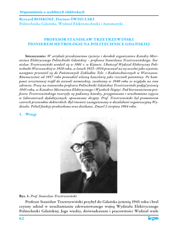 Wspomnienia o wybitnych elektrykach Ryszard ROSKOSZ, Dariusz ŚWISULSKI Politechnika Gdańska, Wydział Elektrotechniki i Automatyki PROFESOR STANISŁAW TRZETRZEWIŃSKI PIONIEREM METROLOGII NA POLITECHNICE GDAŃSKIEJ Streszczenie: W artykule przedstawiono życiorys i dorobek organizatora Katedry Miernictwa Elektrycznego Politechniki Gdańskiej – profesora Stanisława Trzetrzewińskiego. Stanisław Trzetrzewiński urodził się w 1901 r. w Kijowie. Ukończył Wydział Elektryczny Politechniki Warszawskiej w 1928 roku, w latach 1925–1934 pracował na tej uczelni jako asystent, następnie przeniósł się do Państwowych Zakładów Tele- i Radiotechnicznych w Warszawie. Równocześnie od 1937 roku prowadził własną kancelarię jako rzecznik patentowy. Po kampanii wrześniowej trafił do niewoli niemieckiej, zwolniony w 1940 roku ze względu na stan zdrowia. Pracę na stanowisku profesora Politechniki Gdańskiej Trzetrzewiński podjął jesienią 1945 roku, w Katedrze Miernictwa Elektrycznego i Wysokich Napięć. Pod kierownictwem profesora Trzetrzewińskiego tworzyły się podstawy katedry, przygotowano i uruchomiono zajęcia w laboratoriach dydaktycznych, opracowano skrypty. Prof. Trzetrzewiński był promotorem czterech przewodów doktorskich. Był również zaangażowany w działalność organizacyjną Wydziału. Pełnił funkcje prodziekana oraz dziekana. Zmarł 2 sierpnia 1964 roku. 1. Wstęp Rys. 1. Prof. Stanisław Trzetrzewiński Profesor Stanisław Trzetrzewiński przybył do Gdańska jesienią 1945 roku i brał czynny udział w uruchamianiu zdewastowanego wojną Wydziału Elektrycznego Politechniki Gdańskiej. Jego wiedzy, doświadczeniu i pracowitości Wydział wiele 62 Wspomnienia o wybitnych elektrykach zawdzięcza, jeśli chodzi o organizację dydaktyki, wyposażanie i uruchamianie laboratoriów, a także – organizację administracji. Profesor był osobowością nieprzeciętną, wzorem uczonego i wychowawcy. Cechowała Go rzetelność i pracowitość w badaniach naukowych, staranność i solidność w prowadzeniu dydaktyki, szlachetność i duża kultura osobista w życiu codziennym. Aktywnie uczestniczył w reaktywacji Oddziału Wybrzeża Morskiego Stowarzyszenia Elektryków Polskich, a w najtrudniejszych pierwszych latach powojennych (1945–1946) w swoim mieszkaniu przy ul. Matejki 23 prowadził sekretariat Oddziału SEP [1]. 2. Okres przedwojenny Stanisław Trzetrzewiński urodził się 6 lipca 1901 r. w Kijowie. W 1919 r. zdał maturę w gimnazjum rosyjskim w Charkowie, a po roku ponownie – w polskim Gimnazjum im. E. A. Rontalera w Warszawie, aby otworzyć sobie drogę do studiów w Polsce. Po krótkim epizodzie ochotniczej służby wojskowej w 1921 r. podjął studia na Wydziale Elektrycznym Politechniki Warszawskiej i w 1928 roku otrzymał dyplom inżyniera elektryka. Jeszcze podczas studiów został (1925) asystentem prof. Kazimierza Drewnowskiego w Zakładzie Miernictwa Elektrycznego i Wysokich Napięć i tę funkcję pełnił również po dyplomie, aż do 1934 r. W tym czasie opracowywał metody oraz stanowiska pomiarowe do badań naukowych i do zajęć dydaktycznych, a także przygotował wiele materiałów do publikacji. Równocześnie, w latach 1929–1930, był radcą technicznym w Urzędzie Patentowym w Warszawie, zajmując się wynalazkami z miernictwa elektrycznego, wysokich napięć, materiałów magnetycznych oraz lamp żarowych, jonowych i elektronowych. W 1934 roku inż. S. Trzetrzewiński przeszedł do Państwowych Zakładów Telei Radiotechnicznych w Warszawie jako starszy konstruktor w Dziale Studiów i zarazem rzecznik patentowy. W 1938 r. został powołany przez ministra poczt i telegrafów w skład Komisji Modyfikacji Prawa Patentowego. Za zasługi w tej dziedzinie otrzymał Srebrny Krzyż Zasługi. Podczas pracy w Zakładach Tele- i Radiotechnicznych opracował metody badania materiałów magnetycznych przy częstotliwościach akustycznych oraz metody badań sprzętu elektroakustycznego w warunkach masowej produkcji. Skonstruował i wdrożył seryjną produkcję przenośników teletechnicznych, był też autorem takich wynalazków, jak wzmacniacz małej częstotliwości (1936) czy skala do radioodbiorników (1938) opatentowanych przez te Zakłady. W sierpniu 1939 roku został zmobilizowany, a po kampanii wrześniowej trafił do niewoli niemieckiej, internowany w obozie jenieckim w Grossborn (dziś: Borne Sulinowo). Kiedy zachorował, w czerwcu 1940 roku został zwolniony i wrócił do Warszawy, gdzie prowadził przedsiębiorstwo elektroinstalacyjne i był rzecznikiem patentowym [1]. 3. Okres po 1945 roku Po wyzwoleniu, w lutym 1945, wszedł w skład Grupy Operacyjnej, jako pełnomocnik Ministra Komunikacji z misją zorganizowania Wojewódzkiego Urzędu Nr 180 63 Wspomnienia o wybitnych elektrykach Samochodowego w Bydgoszczy. Już we wrześniu 1945 r. S. Trzetrzewiński poprosił o zwolnienie z tej funkcji, bo starał się o zatrudnienie na Politechnice Gdańskiej. Rektor PG prof. Stanisław Łukaszewicz 1 listopada 1945 roku powierzył inż. S. Trzetrzewińskiemu pełnienie „obowiązków profesora nadzwyczajnego na Katedrze Miernictwa Elektrycznego i Wysokich Napięć na Wydziale Elektrotechnicznym” [1]. Rozpoczął się pionierski okres działalności Profesora na Politechnice Gdańskiej. Pod kierownictwem profesora Trzetrzewińskiego tworzyły się podstawy katedry. Zatrudniono kolejnych pracowników dydaktycznych (Longin Kurski, Jerzy Jaczewski, Eugeniusz Jabłonka, Tadeusz Lipski, Alojzy Spichalski, Czesław Wojniłłowicz, Jerzy Gumiński, Romuald Dołmat). Uporządkowano i uzupełniano aparaturę laboratoryjną, przygotowano i uruchomiono zajęcia w laboratoriach dydaktycznych, opracowano pierwsze instrukcje, a następnie skrypty do ćwiczeń [5]. Rys. 2. Profesor Stanisław Trzetrzewiński prowadzi wykład z miernictwa elektrycznego w sali E-41, WE PG, 1958 rok [2] Pierwsze instrukcje do ćwiczeń laboratoryjnych z miernictwa el