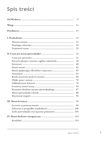 Spis treści Od Wydawcy ................................................................................................... 9 Wstęp . ............................................................................................................... 11 Przedmowa....................................................................................................... 13 I. Pochodzenie................................................................................................. 15 Historia masażu....................................................................................... 15 Fizjologia człowieka................................................................................ 19 Znajomość marm .................................................................................... 25 II. Czym jest masaż ajurwedyjski?.............................................................. 31 Czym jest ajurweda? .............................................................................. Korzyści płynące z masażu i ogólne wskazówki................................. Szirowasti.................................................................................................. Zimny masaż............................................................................................. Masaż upiększający dla kobiet i mężczyzn.......................................... Automasaż . .............................................................................................. Ruchy stosowane podczas masażu........................................................ Olejki, pasty i esencje.............................................................................. Oddziaływanie kolorów......................................................................... Leczniczy masaż uryną........................................................................... Korzystne działanie masażu ajurwedyjskiego . .................................. Masaż ajurwedyjski z Kerali . ................................................................ Masowanie nogami . ............................................................................... 31 39 60 62 63 65 66 70 78 83 87 88 93 III. Masaż leczniczy........................................................................................ 94 Leczenie za pomocą masażu.................................................................. 94 Zalecenia w przypadku niepłodności ................................................. 100 Zioła ajurwedyjskie oraz łączenie pokarmów..................................... 105 IV. Masaż duchowo-energetyczny.............................................................. 114 Kundalini.................................................................................................. 114 Spis treści 7 Czakry . ..................................................................................................... 115 Czakry i gruczoły wydzielania wewnętrznego.................................. 121 Techniki masażu duchowo-energetycznego....................................... 127 V. Akupresura i refleksologia....................................................................... 134 Akupresura................................................................................................ 134 Refleksologia (terapia strefowa)............................................................ 140 VI. Joga nidra i kajakalpa ............................................................................. 147 Joga nidra.................................................................................................. 147 Kajakalpa . ................................................................................................ 148 Tabele marm .................................................................................................... 151 Bibliografia....................................................................................................... 161 Indeks . .............................................................................................................. 163