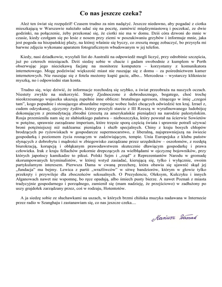 Co nas jeszcze czeka? Ależ ten świat się rozpędził! Czasem trudno za nim nadążyć. Jeszcze niedawno, aby pogadać z ciotka mieszkającą w Warszawie należało udać się na pocztę, zamówić międzymiastową i poczekać, ze dwie godzinki, na połączenie, żeby przekonać się, że ciotki nie ma w domu. Dziś córa dzwoni do mnie w czasie, kiedy czołgam się po lesie z nosem przy ziemi w poszukiwaniu grzybów i informuje mnie, jaka jest pogoda na hiszpańskiej plaży, na której właśnie się byczy, co zresztą mogę zobaczyć, bo przysyła mi barwne zdjęcia wykonane aparatem fotograficznym wbudowanym w jej telefon. Kiedy, nasi dziadkowie, wysyłali list do Australii na odpowiedź mogli liczyć, przy odrobinie szczęścia, już po czterech miesiącach. Dziś siedzę sobie w chacie i gadam swobodnie z kumplem w Perth obserwując jego nieciekawą facjatę na monitorze komputera – korzystamy z komunikatora internetowego. Mogę podziwiać większość miast nie ruszając się z domu – za pośrednictwem kamer internetowych. Nie ruszając się z fotela możemy kupić gacie, albo... Mercedesa – wystarczy klikniecie myszką, no i odpowiedni stan konta. Trudno się, więc dziwić, że informacje rozchodzą się szybko, a świat przeobraża na naszych oczach. Niestety zwykle na niekorzyść. Stany Zjednoczone z dobrodusznego, bogatego, choć trochę nieokrzesanego wujaszka ukazują zupełnie inne oblicze: brutalnego agresora, rżnącego w imię „czegoś tam”, kogo popadnie i stosującego absurdalne represje wobec ludzi chcących odwiedzić ten kraj. Izrael z, cudem odzyskanej, ojczyzny żydów, którzy przeżyli starcie z III Rzeszą w wyrafinowanego ludobójcę dokonującym z premedytacją zbrodni (zresztą za amerykańskie pieniądze) na narodzie palestyńskim. Rosja przemieniła nam się ze słabiutkiego państwa – nieboszczyka, który powstał na ścierwie Sowietów w potężne, sprawnie zarządzane imperium, które trzęsie sporą częścią świata i sprawnie potrafi używać broni potężniejszej niż nuklearna: pieniądza i służb specjalnych. Chiny z kraju bosych chłopów brodzących po ryżowiskach w gospodarcze supermocarstwo, z liberalną, najsprawniejszą na świecie gospodarką i poziomem życia rosnącym w zadziwiającym, tempie. Unia Europejska z klubu państw słynących z dobrobytu i mądrości w zbiegowisko zarządzane przez urzędników – oszołomów, z rozdętą biurokracją, korupcją i obłąkanym prawodawstwem skutecznie dławiącym gospodarkę i prawa człowieka. Irak z kraju fellachów pokornie drepczących za wielbłądami w ojczyznę bojowników, przy których japońscy kamikadze to pikuś. Polski Sejm i „rząd” z Reprezentantów Narodu w gromadę skorumpowanych kryminalistów, w której wstyd zasiadać, kierującą się, tylko i wyłącznie, swoim partykularnym interesem. Pierwsza Dama w cwaną przecherę, która obawia się ujawnić skąd jej „fundacja” ma bejmy. Lewica z partii „wrażliwców” w sitwę bandziorów, którym w głowie tylko przekręty i przywileje dla zboczeńców seksualnych. O Prezydencie, Oleksym, Kulczyku i innych Ałganowach nawet nie wspomnę, bo ręce opadają, albo śmiech pusty bierze. A nawet Poznań z miasta tradycyjnie gospodarnego i porządnego, zamienił się (mam nadzieję, że przejściowo) w zadłużony po uszy grajdołek zarządzany przez, coś w rodzaju, Hotentotów. A ja siedzę sobie ze słuchawkami na uszach, w których brzmi chińska muzyka nadawana w Internecie przez radio w Szanghaju i zastanawiam się, co nas jeszcze czeka....