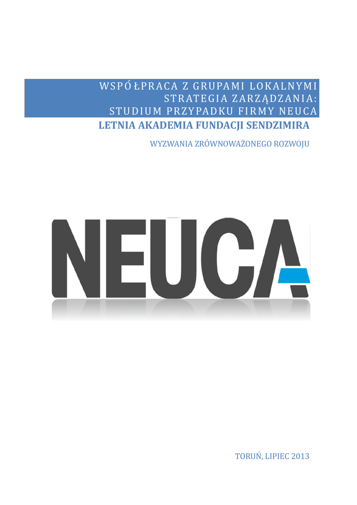 W S P Ó Ł P R AC A Z G RU PA M I L Ó K A L N Y M I ST R AT E G I A Z A R Z Ą DZ A N I A : ST U D I U M P RZ Y PA D KU F I R M Y N E U C A LETNIA AKADEMIA FUNDACJI SENDZIMIRA WYZWANIA ZRÓWNÓWAZÓNEGÓ RÓZWÓJU TÓRUN, LIPIEC 2013 AU TO R Z Y R A P O RT U ENIKÓ MELEG KRYSTYNA MANTURZYK TÓMASZ ZAPAŁA ANDREEA PAUNA NADIIA GRYSHCHENKÓ Órganizator Partner biznesowy Sponsor Fundacja Sendzimira NEUCA Narodowy Fundusz Óchrony Srodowiska i Gospodarki Wodnej 2 Podziękowania Chcielibysmy podziękowac Pani Agnieszce Anielskiej, specjalistki od PR z firmy NEUCA za cenne informacje i komentarze. Chcielibysmy rowniez wyrazic wdzięcznosc dla Joanny Klak, Tomasza Bergiera, Jakuba Kronenberga, Karoliny Maliszewskiej, Beaty Sochackiej i Renaty Putkowskiej za ich cierpliwosc i udzielone porady. Bez ich wsparcia ten projekt nigdy nie doszedłby do skutku. 3 Spis treści WSTĘP 6 1. PÓDSTAWÓWE INFÓRMACJE Ó NEUCA SA 7 2. INTERESARIUSZE 9 2.1. Pracownicy 9 2.2. Apteki i szpitale 10 2.5. Pacjenci i grupy lokalne 10 2.6. Jednostki edukacyjne 10 3. SPÓŁECZNE WSKAZNIKI CSR 11 3.1. Ócena CSR za pomocą metody CÓMPASS 11 4. WYZWANIA ZRÓWNÓWAZÓNEGÓ RÓZWÓJU FIRMY 14 5. DÓBRE PRAKTYKI 15 5.1.Lekcje pierwszej pomocy w szkołach. 15 5.2. Fundacja: działania edukacyjne i profilaktyka skierowana do dzieci. 15 5.3. Grupa Pelion: leki za tonery 15 5.4. Audyt dostawcow HP 16 5.5. Wal-Mart: rewolucja w opakowaniach 16 6. REKÓMENDACJE DLA NEUCA 17 6.1. Zaangazowanie pracownikow 17 6.2. Program wsparcia osob uzaleznionych od medykamentow. 17 6.3. Edukacja prozdrowotna w szkołach. 17 6.4.Wzmocnienie wspołpracy z lokalnymi organizacjami pozarządowymi. 18 6.5. Ódpis 1% podatku w firmie NEUCA 18 6.6.Zaangazowane partnerow biznesowych. 18 6.7. Promowanie etycznych zachowan wsrod dostawcow. 19 6.8. Ópakowaniowa karta wynikow dla dostawcow firmy 19 7. PÓDSUMÓWANIE 20 8. ZRÓDŁA 21 4 STRESZCZENIE Projekt ma na celu ulepszenie wspołpracy firmy z lokalną społecznoscią oraz znalezienie potencjalnych nowych interesariuszy. Raport składa się ze streszczenia, spisu tresci, wstępu, 6 rozdziałow z podrozdziałami. Po krotkim wstępie znajduje się rozdział z podstawowymi informacjami o firmie, następny traktuje o interesariuszach. W kolejnym rozdziale przedstawione są wskazniki CSR, Po nim jest opis wybranych dobrych praktyk z dziedziny wspołpracy z lokalną społecznoscią, Sugestie i konkluzje uzupełniają głowną częsc pracy. Praca nad projektem była skoncentrowana głownie na poprawie wspołpracy między firmą, a grupami lokalnymi oraz jednostkami edukacyjnymi, jako waznymi interesariuszami. Interesariusze zostali podzieleni na wg następujących kategorii: interesariusze wewnętrzni (pracownicy) oraz zewnętrzni, głownie apteki i szpitale, producenci, inwestorzy, pacjenci i grupy lokalne, jednostki edukacyjne. Została utworzona lista wskaznikow do oszacowaniu CSR oraz zostały wyznaczone najwazniejsze wyzwania w tym zakresie. Wyzwania dotyczą następujących kwestii: gruntowna wspołpraca między firmą a grupami lokalnymi; tworzenie nowych form wspołpracy; weryfikowanie polityki CSR dostawcow produktow; stosowanie ekoetykietowania i udzielanie informacji na temat wytwarzania produktow wg zasad zrownowazonego rozwoju; oraz działanie wg zasad etycznych na danym polu. Dobre praktyki zostały wybrane, aby przedstawic mozliwe rozwiązania w odpowiedzi na wyzwania firmy oraz udzielic informacji na temat wdrazania praktyk zarządzania firmą pod kątem zrownowazonego rozwoju. Zaproponowane rozwiązania opierają się na doswiadczeniu roznych firm z całego swiata. Składa się na nie: zaangazowanie pracownikow, oferta wsparcia dla ludzi w trudnej sytuacji społecznej, kampanie edukacyjne, wspołpraca z NGÓ, sprawdzanie dostawcow i podwykonawcow pod kątem ich etyki pracy. 5 WSTĘP Raport został przygotowany przez grupę 5 członkow Akademii Letniej „Wyzwania Zrownowazonego Rozwoju”, ktora odbywała się w miejscowosci Przysiek k/Torunia w lipcu 2013 i była organizowana przez Fundację Sendzimira. Fundacja szerzy wiedzę oraz zastosowania gospodarki zrownowazonego rozwoju poprzez akcje edukacyjne, badania oraz działania praktyczne. Szczegolna uwaga jest poswięcona długofalowym partnerstwom oraz wspołpracy między Akademią, administracją publiczną, biznesem oraz sektorem NGÓ w zakresie zrownowazonego rozwoju oraz usług ekosystemow. Letnia Akademia jest waznym działaniem szkoleniowym, ktore odbywa się rokrocznie od 1998. Studenci to młodzi fachowcy z roznych dziedzin z Europy Srodkowo-Wschodniej, ktorzy spotykają się, aby pracowac przez 3 tygodnie nad dwoma projektami: lokalnym i biznesowym. Praca w grupach oraz warsztaty, ktore odbywają się rownolegle z wizytami na miejscu pomagają zrozumiec jak pewne rzeczy działają w realnych warunkach i jak wprowadzac zmiany. Celem projektu praktycznego jest poprawa wspołpracy firmy z grupami lokalnymi oraz znalezienie nowych interesariuszy. Raport przedstawia wachlarz działan, ktore NEUCA moze zainicjowac w celu poprawy dialogu z interesariuszami. Naszym zadaniem było (1) przedstawic mapę obecnych interesariuszy NEUCA oraz zidentyfikowac ich; (2) zasugerowac indykatory CSR; (3) przedstawic najlepsze praktyki CSR; (4) zarekomendowac nowe działania dla obecnych interesariuszy oraz podjąc akcje by dotrzec do nowych. Pierwszym etapem pracy było spotkanie z przedstawicielem firmy, Panią Agnieszka Anielska. Podczas spotkania przedstawiono nam istotne informacje o firmie, jej wartosciach oraz kierunku, w ktorym dązy. Mielismy rowniez szansę lepiej zrozumiec strategie firmy, oczekiwania oraz obszary, w ktorych chciałaby się rozwijac. Bazując na informacjach, ktore zgromadzilismy podczas spotkania a takze naszych własnych poszukiwan, przygotowalismy przegląd wyzwan, ktore stoją przed firmą, listę interesariuszy, zestaw wskaznikow odpowiedzialnosci biznesu, listę dobrych praktyk, rekomendacje oraz korzysci z ich zast