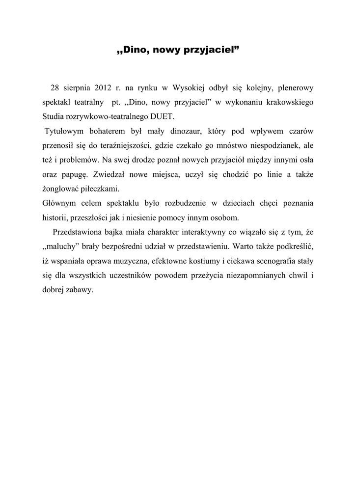 ,,Dino, nowy przyjaciel” 28 sierpnia 2012 r. na rynku w Wysokiej odbył się kolejny, plenerowy spektakl teatralny pt. ,,Dino, nowy przyjaciel” w wykonaniu krakowskiego Studia rozrywkowo-teatralnego DUET. Tytułowym bohaterem był mały dinozaur, który pod wpływem czarów przenosił się do teraźniejszości, gdzie czekało go mnóstwo niespodzianek, ale też i problemów. Na swej drodze poznał nowych przyjaciół między innymi osła oraz papugę. Zwiedzał nowe miejsca, uczył się chodzić po linie a także żonglować piłeczkami. Głównym celem spektaklu było rozbudzenie w dzieciach chęci poznania historii, przeszłości jak i niesienie pomocy innym osobom. Przedstawiona bajka miała charakter interaktywny co wiązało się z tym, że ,,maluchy” brały bezpośredni udział w przedstawieniu. Warto także podkreślić, iż wspaniała oprawa muzyczna, efektowne kostiumy i ciekawa scenografia stały się dla wszystkich uczestników powodem przeżycia niezapomnianych chwil i dobrej zabawy.