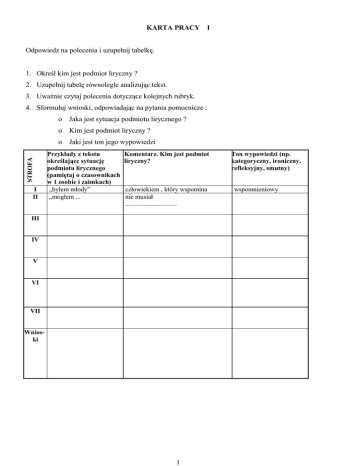 KARTA PRACY I Odpowiedz na polecenia i uzupełnij tabelkę. 1. Określ kim jest podmiot liryczny ? 2. Uzupełnij tabelę równolegle analizując tekst. 3. Uważnie czytaj polecenia dotyczące kolejnych rubryk. 4. Sformułuj wnioski, odpowiadając na pytania pomocnicze : o Jaka jest sytuacja podmiotu lirycznego ? o Kim jest podmiot liryczny ? STROFA o Jaki jest ton jego wypowiedzi I II Przykłady z tekstu określające sytuację podmiotu lirycznego (pamiętaj o czasownikach w 1 osobie i zaimkach) „byłem młody” „mogłem ... Komentarz. Kim jest podmiot liryczny? człowiekiem , który wspomina nie musiał ............................... III IV V VI VII Wnioski 1 Ton wypowiedzi (np. kategoryczny, ironiczny, refleksyjny, smutny) wspomnieniowy KARTA PRACY II Odpowiedz na polecenia i uzupełnij schemat wg wzoru podanego poniżej. 1. Jakie jest znaczenie „słowa”? 2. Wypisz z wiersza związki wyrazowe ze „słowem”. 3. Określ znaczenia metaforyczne wypisanych związków. 4. Podaj wnioski : czym stało się „słowo” dla podmiotu lirycznego ? Przykład Znaczenie I strofa „nie dawać słowa” VII strofa II strofa zachować neutralność obojętność III strofa SŁOWO VI strofa IV strofa V strofa „słowo - pętla” ....................... WNIOSKI: ........................................................................................................................................................................ ........................................................................................................................................................................ ........................................................................................................................................................................ ........................................................................................................................................................................ ........................................................................................................................................................................ ...................................................................................................................................................................... 2 KARTA PRACY III Odpowiedz na polecenia i uzupełnij schemat wg wzoru 1. 2. 3. 4. o o o o o Jak podmiot liryczny odczuwa czas ? Wypisz z wiersza określenia dotyczące czasu. Skomentuj wypisane określenia. Podaj wnioski, odpowiadając na pytania: Która strofa określa przełomowe wydarzenie? Jak oceniłbyś to wydarzenie ? Jaki jest czas dla podmiotu lirycznego? Wypisz wyraźnie oceniające określenia. Jak podmiot liryczny odczuwa czas ? Przykład komentarz I strofa PRZYSZŁOŚĆ „byłem doradzał” VII strofa PRZESZŁOŚĆ czas przeszły II strofa CZAS VI strofa III strofa bezczas, marzenie o przyszłości TERAŹNIEJSZOŚĆ IV strofa V strofa „oś światła” „kolorowe obręcze czasu” WNIOSKI : ........................................................................................................................................................................ ........................................................................................................................................................................ ........................................................................................................................................................................ ........................................................................................................................................................................ ........................................................................................................................................................................ ........................................................................................................................................................................ 3 Zbigniew Herbert, Dałem słowo byłem bardzo młody i rozsądek doradzał żeby nie dawać słowa mogłem śmiało powiedzieć namyślę się jeszcze nie ma pośpiechu to nie rozkład jazdy dam słowo po maturze po służbie wojskowej kiedy zbuduję dom ale czas eksplodował nie było już przedtem nie było już potem w oślepiającym teraz trzeba było wybierać więc dałem słowo słowo pętla na szyi słowo ostateczne w rzadkich chwilach kiedy wszystko staje się lekkie przechodzi w przezroczystość myślę sobie: „słowo daję chętnie bym cofnął dane słowo” trwa to krótko bo oto – skrzypi oś świata mijają ludzie krajobrazy kolorowe obręcze czasu a dane słowo ugrzęzło w gardle 4