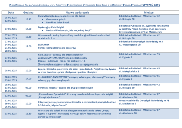PLAN DZIAŁAŃ EDUKACYJNO-KULTURALNYCH BIBLIOTEKI PUBLICZNEJ IM. ZYGMUNTA JANA RUMLA W DZIELNICY PRAGA-POŁUDNIE STYCZEŃ 2015 Data Godzina Nazwa wydarzenia Miejsce 16.45 Klub Mikołajka Zajęcia plastyczne dla dzieci Oszronione gałązki Ramki na dzień Babci 17.00 Dyskusyjny Klub Książki Barbara Włodarczyk „Nie ma jednej Rosji” 16.30 Wyprawa do krainy bajek – Zajęcia edukacyjno-literackie dla dzieci w wieku 2- 5 lat 12.00 LATARNIK Pomoc komputerowa dla seniorów 07.01.2015 14.01.2015 17.00 Klub Zająca – zabawy dla przedszkolaków Zabawy MATEMATYCZNE dla przedszkolaków Dodaję i odejmuję i nic mi nie brakuje(+ / -). Zbiory matematyczne – udana zabawa w segregowanie Biblioteka dla Dzieci i Młodzieży nr 55 ul. Egipska 7 08.01.2015 10.00 Zajęcia literacko- plastyczne dla szkół i przedszkoli. Projektujemy dywan w stylu łowickim - praca plastyczna z papieru i krepiny. Biblioteka dla Dzieci i Młodzieży nr 45 ul. Meksykańska 3 08.01.2015 15.01.2015 17.00 KLUB GIER PLANSZOWYCH Tworzymy własną grę planszową! Tworzymy własną grę planszową! wyniki Biblioteka dla Dzieci i Młodzieży nr 55 ul. Egipska 7 Biblioteka dla Dzieci i Młodzieży nr 42 ul. Biskupia 50 05.01.2015 12.01.2015 07.01.2015 07.01.2015 14.01.2015 07.01.2015 14.01.2015 21.01.2015 28.01.2015 08.01.2015 13.01.2015 15.01.2015 09.00 Poranki z książką – zajęcia dla grup przedszkolnych 12.01.2015 09.00 „Poduszkowe Opowieści”. Czytamy przedszkolakom bajeczki z książki „Poczytaj mi mamo” 12.01.2015 19.01.2015 26.01.2015 10.00 Integracyjne zajęcia muzyczno-literackie z elementami plastyki dla dzieci 2-3 letnich „Mądre Smyki” 16.30 Warsztaty dla dzieci. Praca plastyczna na podstawie tekstu „Pupy, ogonki i kuperki”. Przeczytaj, narysuj i odkryj fascynujące tajemnice ukryte w zwierzętach 13.01.2015 Biblioteka dla Dzieci i Młodzieży nr 42 ul. Biskupia 50 Biblioteka Publiczna im. Zygmunta Jana Rumla w Dzielnicy Praga-Południe m.st. Warszawy Czytelnia Naukowa nr V ul. Meissnera 5 Biblioteka dla Dzieci i Młodzieży nr 42 ul. Biskupia 50 Biblioteka dla Dorosłych i Młodzieży nr 3 Al. Waszyngtona 2b Biblioteka dla Dzieci i Młodzieży nr 67 ul. Abrahama 10 Wypożyczalnia dla Dorosłych i Młodzieży nr 78 ul. Majdańska 5 Biblioteka dla Dzieci i Młodzieży nr 67 ul. Abrahama 10 13.01.2015 17.30 Salonik literacki Spotkanie autorskie z Anetą Skarżyński - promocja książki " Wyspy Naftalinowe" 13.01.2015 17.00 Klub Olbrzyma-zajęcia plastyczne Bałwanki na sankach-praca plastyczna z papieru i styropianu Biblioteka Publiczna im. Zygmunta Jana Rumla w Dzielnicy Praga-Południe m.st. Warszawy ul. Meissnera 5 Biblioteka dla Dzieci i Młodzieży nr 45 ul. Meksykańska 3 13.01.2015 20.01.2015 27.01.2015 17.30 „Bajowanie na dywanie” czyli głośne czytanie dzieciom bajek i baśni Wypożyczalnia dla Dorosłych i Młodzieży nr 78 ul. Majdańska 5 14.01.2015 10.00 Opowieści mola książkowego - czyli jak pięknie może być w bibliotece Biblioteka dla Dzieci i Młodzieży nr 45 ul. Meksykańska 3 14.01.2015 15.00 Spotkanie Klubu Miłośników Książki Mówionej „Agnieszki. Pejzaże z Agnieszką Osiecką” Autor: Zofia Turowska „Jacqueline Kennedy Onassis” Autor: Größing Sigrid-Maria 15.01.2015 17.00 Spotkanie autorskie z Moniką Oleksą Lekcja biblioteczna Dzieci świętują karnawał. Idziemy na bal 15.01.2015 15.01.2015 17.00 Warsztaty plastyczne z cyklu „Rycerze i Księżniczki Sztuki” Zimowy Świat Biblioteka Publiczna im. Zygmunta Jana Rumla w Dzielnicy Praga-Południe m.st. Warszawy Wypożyczalnia Książek Mówionych i Multimediów ul. Meissnera 5 Wypożyczalnia dla Dorosłych i Młodzieży nr 66 ul. Angorska 14 Biblioteka dla Dzieci i Młodzieży Nr 16 ul. Walewska 7a Wypożyczalnia dla Dorosłych i Młodzieży nr 78 ul. Majdańska 5 ZIMA W MIEŚCIE 09.00 - 15.00 Zajęcia edukacyjne w ramach akcji „Zima w mieście” Pomagamy zwierzętom - Co należy wiedzieć o zimowych zwyczajach naszych podopiecznych. Biblioteka dla Dzieci i Młodzieży nr 55 ul. Egipska 7 19-23.01.2015 26-30.01.2015 11.00 - 15.00 Zajęcia edukacyjne w ramach akcji „Zima w mieście” Zimowa Pogodynka Biblioteka dla Dzieci i Młodzieży Nr 16 ul. Walewska 7a 19-23.01.2015 26-30.01.2015 08.30 - 15.00 Zajęcia edukacyjne w ramach akcji „Zima w mieście” Kolorowy zawrót głowy Biblioteka dla Dzieci i Młodzieży nr 42 ul. Biskupia 50 10.30 - 15.30 Zajęcia edukacyjne w ramach akcji „Zima w mieście” Kinowa Kawiarenka. Zajęcia dla grup zorganizowanych. Biblioteka Publiczna im. Zygmunta Jana Rumla w Dzielnicy Praga-Południe m.st. Warszawy ul. Meissnera 5 19-23.01.2015 26-30.01.2015 19-23.01.2015 26-30.01.2015 22.01.2015 17.00 Warsztaty plastyczne z cyklu „Rycerze i Księżniczki Sztuki” Prezent dla Babci i Dziadka Wypożyczalnia dla Dorosłych i Młodzieży nr 78 ul. Majdańska 5 22.01.2015 10.00 Ale dziwny dom-tworzymy mieszkanie dla Anaruka - praca plastyczna z kartonu, rolek i butelek plastikowych Biblioteka dla Dzieci i Młodzieży nr 45 ul. Meksykańska 3 26.01.2015 17.00 KLUB HIPCIA Dzień Babci i Dziadka uczcimy wierszem i laurką Biblioteka dla Dzieci i Młodzieży Nr 16 ul. Walewska 7a Dzień z książką i kulturą Armenii - dla dzieci Biblioteka Publiczna im. Zygmunta Jana Rumla w Dzielnicy Praga-Południe m.st. Warszawy ul. Meissnera 5 Dzień z książką i kulturą Armenii - dla dorosłych Biblioteka Publiczna im. Zygmunta Jana Rumla w Dzielnicy Praga-Południe m.st. Warszawy ul. Meissnera 5 29.01.2015 29.01.2015 10.00 17.00