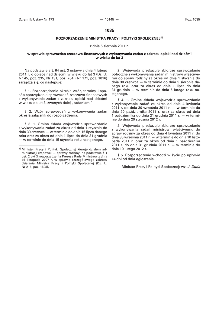 Dziennik Ustaw Nr 173 — 10145 — Poz. 1035 1035 ROZPORZĄDZENIE MINISTRA PRACY I POLITYKI SPOŁECZNEJ1) z dnia 5 sierpnia 2011 r. w sprawie sprawozdań rzeczowo-finansowych z wykonywania zadań z zakresu opieki nad dziećmi w wieku do lat 3 Na podstawie art. 64 ust. 3 ustawy z dnia 4 lutego 2011 r. o opiece nad dziećmi w wieku do lat 3 (Dz. U. Nr 45, poz. 235, Nr 131, poz. 764 i Nr 171, poz. 1016) zarządza się, co następuje: § 1. Rozporządzenie określa wzór, terminy i sposób sporządzania sprawozdań rzeczowo-finansowych z wykonywania zadań z zakresu opieki nad dziećmi w wieku do lat 3, zwanych dalej „zadaniami”. § 2. Wzór sprawozdań z wykonywania zadań określa załącznik do rozporządzenia. § 3. 1. Gmina składa wojewodzie sprawozdanie z wykonywania zadań za okres od dnia 1 stycznia do dnia 30 czerwca — w terminie do dnia 15 lipca danego roku oraz za okres od dnia 1 lipca do dnia 31 grudnia — w terminie do dnia 15 stycznia roku następnego. 1) Minister Pracy i Polityki Społecznej kieruje działem administracji rządowej — sprawy rodziny, na podstawie § 1 ust. 2 pkt 3 rozporządzenia Prezesa Rady Ministrów z dnia 16 listopada 2007 r. w sprawie szczegółowego zakresu działania Ministra Pracy i Polityki Społecznej (Dz. U. Nr 216, poz. 1598). 2. Wojewoda przekazuje zbiorcze sprawozdanie półroczne z wykonywania zadań ministrowi właściwemu do spraw rodziny za okres od dnia 1 stycznia do dnia 30 czerwca — w terminie do dnia 5 sierpnia danego roku oraz za okres od dnia 1 lipca do dnia 31 grudnia — w terminie do dnia 5 lutego roku następnego. § 4. 1. Gmina składa wojewodzie sprawozdanie z wykonywania zadań za okres od dnia 4 kwietnia 2011 r. do dnia 30 września 2011 r. — w terminie do dnia 20 października 2011 r. oraz za okres od dnia 1 października do dnia 31 grudnia 2011 r. — w terminie do dnia 20 stycznia 2012 r. 2. Wojewoda przekazuje zbiorcze sprawozdanie z wykonywania zadań ministrowi właściwemu do spraw rodziny za okres od dnia 4 kwietnia 2011 r. do dnia 30 września 2011 r. — w terminie do dnia 10 listopada 2011 r. oraz za okres od dnia 1 października 2011 r. do dnia 31 grudnia 2011 r. — w terminie do dnia 10 lutego 2012 r. § 5. Rozporządzenie wchodzi w życie po upływie 14 dni od dnia ogłoszenia. Minister Pracy i Polityki Społecznej: wz. J. Duda Dziennik Ustaw Nr 173 — 10146 — Poz. 1035 Załącznik do rozporządzenia Ministra Pracy i Polityki Społecznej z dnia 5 sierpnia 2011 r. (poz. 1035) WZÓR .......................................................................... (pieczęć organu sporządzającego sprawozdanie) Wojewoda/Gmina1) ........................................ SPRAWOZDANIE/SPRAWOZDANIE ZBIORCZE1) Z WYKONYWANIA ZADAŃ Z ZAKRESU OPIEKI NAD DZIEĆMI W WIEKU DO LAT 3 za okres .............................. r. T a be la A . Żłobki i kl u b y d zi eci ęce Lp. Wyszczególnienie Żłobek Klub dziecięcy 1 2 3 4 1. Liczba instytucji na ostatni dzień okresu sprawozdawczego, w tym: 1.1. utworzonych przez gminę, w tym: 1.1.1. prowadzonych przez gminę 1.1.2. prowadzonych przez inne podmioty 1.2. utworzonych przez osobę fizyczną 1.3. utworzonych przez osobę prawną lub jednostkę nieposiadającą osobowości prawnej 2. Liczba miejsc w instytucjach na ostatni dzień okresu sprawozdawczego 3. Liczba osób zatrudnionych na ostatni dzień okresu sprawozdawczego, w tym: 3.1. na stanowisku opiekuna 3.2. na stanowisku pielęgniarki lub położnej 4. Liczba instytucji na ostatni dzień okresu sprawozdawczego, w których dzienny czas pracy instytucji wynosi, z tego: 4.1. do 5 godzin 4.2. powyżej 5 godzin do 7 godzin x 4.3. powyżej 7 godzin do 10 godzin x 4.4. powyżej 10 godzin x 5. Przeciętne koszty związane z pobytem dziecka w instytucji, w tym: 5.1. za pobyt dziecka, z tego: 5.1.1. ponoszone przez rodziców, w tym: 5.1.1.1. za pobyt dziecka przekraczający ustawowy wymiar czasu pracy instytucji 5.1.2. ponoszone przez gminę 5.2. za wyżywienie, z tego: 5.2.1. ponoszone przez rodziców 5.2.2. ponoszone przez gminę 6. Liczba dzieci na ostatni dzień okresu sprawozdawczego, z tego: 6.1. do ukończenia 1. roku życia 6.2. powyżej 1. roku życia do ukończenia 2. roku życia 6.3. powyżej 2. roku życia do ukończenia 3. roku życia 6.4. powyżej 3. roku życia 7. Liczba dzieci niepełnosprawnych oraz wymagających szczególnej opieki na ostatni dzień okresu sprawozdawczego 1) Niepotrzebne skreślić. x Dziennik Ustaw Nr 173 — 10147 — 1 2 8. Liczba dzieci uczęszczających do instytucji na ostatni dzień okresu sprawozdawczego, przez okres, z tego: 8.1. do 1 miesiąca 8.2. powyżej 1 miesiąca do 3 miesięcy 8.3. powyżej 3 miesięcy do 6 miesięcy 8.4. powyżej 6 miesięcy do 12 miesięcy 8.5. powyżej 12 miesięcy 9. Przeciętna liczba dzieci uczęszczających do instytucji w okresie sprawozdawczym Poz. 1035 3 T a be la B . Ze s p o ł y Lp. Wyszczególnienie 1. Liczba zespołów na ostatni dzień okresu sprawozdawczego, w tym: 1.1. utworzonych przez gminę, w tym: 1.1.1. prowadzonych przez gminę 1.1.2. prowadzonych przez inne podmioty 1.2. utworzonych przez osobę fizyczną 1.3. utworzonych przez osobę prawną lub jednostkę nieposiadającą osobowości prawnej 2. Liczba instytucji wchodzących w skład zespołu na ostatni dzień okresu sprawozdawczego, z tego: 2.1. żłobków 2.2. klubów dziecięcych T a be la C . D z ie n n y o p i eku n Lp. Wyszczególnienie 1. Liczba osób na ostatni dzień okresu sprawozdawczego zatrudnionych jako dzienny opiekun 2. Liczba dzieci znajdujących się pod opieką dziennego opiekuna na ostatni dzień okresu sprawozdawczego, z tego w wieku: 2.1. do ukończenia 1. roku życia 2.2. powyżej 1. roku życia do ukończenia 2. roku życia 2.3. powyżej 2. roku życia do ukończenia 3. roku życia 2.4. powyżej 3. roku życia 3. Liczba dzieci niepełnosprawnych oraz wymagających szczególnej opieki znajdujących się pod opieką dziennego opiekuna na ostatni dzień ok