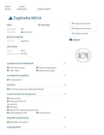 Strona główna / Łodzie użytkownika / Żaglówka NEVA Żaglówka NEVA Opis Dodaj do ulubionych Wymiary Odwiedziny: 922 Właściciel: pavel.bures Publikuj na facebooku Tweetuj tę stronę Dane wspólne Typ łodzi Zdjęcia Zaglówka Inne dane Nazwa NEVA Sygnał wywoła…OL5585 ozaglowanie & takielunek bom drewniany roler foka osprzet spinakera takielunek slupa urzadzenie & podzial mala kabina kuchnia kuchenka gazowa czteropalnikowa instrumentarium nautyczne echosonda Instrumentarium nautyczne kompas odbiornik map synoptycznych radionadajnik UKF wiatromierz plandeki & pokrowce plandeka na calosc wyposazenie akumulator baterie sloneczne do ladowania akumulatora glówny wlacznik do akumulatora kotwica kotwica z lancuchem ladowarka do akumulatora pompa odpompowujaca przylacze ladowe 230V tratwa ratunkowa osprzet drzwi na poklad kapielowy na rufie gasnica kosz na rufie kosz na rufie ze stali nierdzewnej lacznie z dwuosiowa przyczepa lacznie z przyczepa hamowana luk pokladowy obicia na poduszki z tkaniny ogrzewanie podwodna powloka malarska reling pokladowy stalowy kosz na rufie Lokalizacja Leaflet cy Go rą cy Go rą cy rą Go Go rą cy Podobne łodzie Gilli Air Arne1 BEZI Nolseg SY Mimi SY-Mimi Hallberg Rassy … SY Dog cy Go rą cy Go rą cy rą Go Go rą cy Łodzie w zasięgu ilometrów RUSH 9,8 km msrush Mano 37,6 km Little Wing 37,6 km manosailor mobydick Walkabout 69,5 km Segelju