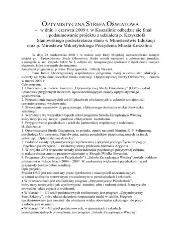OPTYMISTYCZNA STREFA OŚWIATOWA – w dniu 1 czerwca 2009 r. w Koszalinie odbędzie się finał i podsumowanie projektu z udziałem p. Krzysztofa Stanowskiego podsekretarza stanu w Ministerstwie Edukacji oraz p. Mirosława Mikietyńskiego Prezydenta Miasta Koszalina – W dniu 23 października 2008 r. w trakcie sesji Rady Miejskiej zaprezentowano radnym projekt pn. Optymistyczna Strefa Oświatowa. Radni zostali zapoznani z założeniami projektu, a następnie w auli Zespołu Szkół Nr 2, odbyło się inauguracyjne spotkanie z dyrektorami naszych placówek, które przystąpiły do programu. Autorkami programu są p. Irena Dzierzgowskia i Mirela Nawrot. Pani Irenie Dzierzgowskej współautorce programu, byłej wiceminister edukacji niestety nie było dane doczekać finału realizacji Optymistycznej Strefy Oświatowej – zmarła w marcu 2009 r. Cele programu: 1. Utworzenie, w mieście Koszalin „Optymistycznej Strefy Oświatowej” (OSO) – szkół i placówek przyjaznych dzieciom, upowszechniających zasady optymistycznego wychowania. 2. Przeszkolenie nauczycieli szkół i placówek oświatowych w zakresie umiejętności optymistycznego wychowania. 3. Stworzenie warunków do przyjaznego, efektywnego obniżenia wieku obowiązku szkolnego. 4. Wdrożenie we wszystkich typach szkół programu Szkoła Zarządzająca Wiedzą, który uczy jak się uczyć i podnosi efektywność kształcenia. 5. Przygotowanie przedszkoli i szkół do partnerskiej współpracy z rodzicami. II. Założenia: 1. Optymistyczna Strefa Oświatowa, to projekt, oparty na teorii Martina E. P. Seligmana, psychologa Uniwersytetu Pensylwania, autora poradników przetłumaczonych na język polski np. „Optymistyczne dziecko”. 2. Podobne zasady optymistycznego wychowania i optymistycznego Ŝycia propaguje „Psychologia szczęścia” – światowej sławy profesora Michaela Argyle’a. 3. W projekt OSO włączone zostały doświadczenia psychologii pozytywnej zebrane w trakcie eksperymentu przeprowadzonego w Slough (Wielka Brytania). 4. Programy „Optymistyczne Przedszkole” i „Szkoła Zarządzająca Wiedzą” zostały poddane pilotażowi w Polsce latach 2004 – 2007. W znakomitej większości przedszkoli i szkół przyniosły bardzo dobre rezultaty. Opis projektu. Projekt OSO jest realizowany przez dyrektorów i nauczycieli uczestniczących w samokształceniu sterowanym prowadzonym w przedszkolach i szkołach. W przedszkolach jest realizowany program „Optymistyczne Przedszkole”, który uczy nauczycieli jak wychowywać zaradne, ufne i radosne dzieci. Nauczyciele prowadzą także zajęcia z rodzicami. W klasach I – III szkół podstawowych realizowany jest program „Optymistyczny Start Szkolny”, który ułatwi dzieciom rozpoczęcie nauki w szkole. Program ten dostosowany jest również do obniżenia wieku obowiązku szkolnego i do pracy z młodszymi uczniami. W klasach IV – VI szkół podstawowych, w gimnazjach i szkołach ponadgimnazjalnych prowadzony jest program „Szkoła Zarządzająca Wiedzą” (SZW), który uczy nauczycieli, a oni uczniów, jak się uczyć. Program SZW składa się z sześciu modułów. Modułu 0 – stanowi wprowadzenie do programu. Moduł 1 – PLANOWANIE, to ćwiczenie umiejętności planowania własnej pracy, nauki, planowania i efektywnego wykorzystywania czasu, ustalania celów itp. Moduł 2 – ZDOBYWANIE WIEDZY uczy jakie są źródła wiedzy i jak oceniać ich rzetelność, jak robić notatki, jak funkcjonuje pamięć, czym są style myślenia i jak dobrać strategię uczenia się do własnego stylu, jak przygotowywać się do egzaminu itp. Moduł 3 to TWÓRCZE MYŚLENIE, rozwój umiejętności twórczego rozwiązywania nowych problemów. Moduł 4 – PREZENTACJA WIEDZY pozwala uczniom zdobyć umiejętność publicznych wystąpień, dyskutowania i prezentowania własnych poglądów, prezentowania wiedzy w czasie egzaminów. Moduł 5 uczy SAMOOCENY, czyli oceny własnej wiedzy, postaw i swojej osobowości. Realizacja programu w przedszkolach i szkołach kończy się uzyskaniem odpowiednich certyfikatów. Gmina (miasto), w której wszystkie szkoły otrzymają certyfikaty ma prawo do tytułu „Optymistyczna Strefa Oświatowa”. IV. Rezultaty projektu. Rezultaty twarde: Przeszkolenie wszystkich dyrektorów i liderów przedszkoli i szkół. Przeszkolenie (w ramach samokształcenia sterowanego) wszystkich nauczycieli szkół i przedszkoli. Uzyskanie przez przedszkola certyfikatu „Optymistyczne Przedszkole”. Uzyskanie przez szkoły podstawowe (klasy I – III) tytułu/certyfikatu „Optymistyczny Start Szkolny”. Uzyskanie przez szkoły tytułu/certyfikatu „Szkoła Zarządzająca Wiedzą”. Uzyskanie przez uczniów, którzy spełnią wymogi programu, tytułu „Menedżer Wiedzy”. Uzyskanie przez miasto tytułu/certyfikatu „Optymistyczna Strefa Oświatowa”. Rezultaty miękkie: Zmiana postaw dzieci i młodzieży, większa zaradność, samodzielność i przedsiębiorczość. Poprawa motywacji uczniów, większe zainteresowanie uczeniem się. Poprawa efektywności uczenia się, zmniejszenie się odsetka uczniów z trudnościami w uczeniu się. Poprawa frekwencji i stosunku uczniów do szkoły. Lepszy kontakt rodziców ze szkołą, większe zadowolenia rodziców. Ogólny wzrost jakości i efektywności kształcenia i wychowania w przedszkolach i szkołach. Projekt był realizowany w kilku etapach: 1. Etap przygotowawczy – kwiecień 2008 – wrzesień 2008. Spotkanie informacyjno – promocyjne. Celem spotkania było zapoznanie dyrektorów (kwiecień 2008) i przedstawicieli władz miasta (październik 2008) z projektem, wyjaśnienie wątpliwości, prezentacja materiałów. Szkolenie wstępne (jednodniowe). Uczestnikami szkolenia byli dyrektorzy przedszkoli i szkół oraz koordynatorzy projektu w poszczególnych szkołach (maj 2008). 2. Etap realizacji projektu – październik 2008 – kwiecień 2009. Rozpoczęcie projektu – konferencja na terenie miasta z udziałe