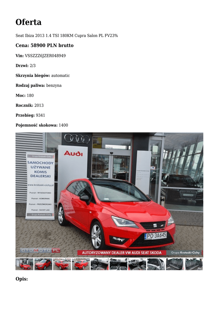 Oferta Seat Ibiza 2013 1.4 TSI 180KM Cupra Salon PL FV23% Cena: 58900 PLN brutto Vin: VSSZZZ6JZER048949 Drzwi: 2/3 Skrzynia biegów: automatic Rodzaj paliwa: benzyna Moc: 180 Rocznik: 2013 Przebieg: 9341 Pojemność skokowa: 1400 Opis: Auto-Handel-Centrum Krotoski-Cichy Autoryzowany Dealer VW Audi Seat Skoda Opel GWARANCJA POCHODZENIA MOŻLIWOŚĆ SPRAWDZENIA POJAZDU W AUTORYZOWANEJ STACJI OBSŁUGI VOLKSWAGEN MOŻLIWOŚĆ POZOSTAWIENIA SWOJEGO SAMOCHODU UŻYWANEGO W ROZLICZENIU !!!UWAGA!!! * PRZY SKORZYSTANIU Z NASZEJ FORMY FINANSOWANIA - KREDYTU LUB LEASINGU DODATKOWY RABAT * ----------------------------------------------------------------------------------------------------------------------------------------------------Uwaga: Miejsce ekspozycji pojazdu - Grupa Krotoski-Cichy Salon Pojazdów Używanych ul.Poznańska 33 62-081 Poznań-Przeźmierowo Osoba kontaktowa tel: Jakub Pruchniewski 691 911 724 Sławek Kaczmarek 667 946 206 Adam Mizera 609 791 014 -----------------------------------------------------------------------------------------------------------------------------------------------------Seat Ibiza Cupra 1.4 TSI 180KM DSG Gwarancja producenta do 03.2016 Pojazd zakupiony w Polskim Salonie Przebieg: 9.341km Skrzynia biegów automatyczna DSG 7 biegowa Cena nowego samochodu 82.000zł Wyposażenie: Kierownica trójramienna sportowa obszyta skórą Radio CD z 6 głośnikami Pilot do sterowania radiem pod kierownicą Obudowy lusterek zewnętrznych polakierowane na czarno Panoramiczny dach szklany Zawieszenie sportowe Fotele sportowe CUPRA Łotatki do zmiany biegów pod kierownicą Reflektory Bi-Xenonowe z systemem ASF Światła LED do jazdy dziennej Światła tylne w technologi LED Reflektory przeciwmgielne Czujnik deszczu Czujnik zmierzchu - automatyczne właczenie swiateł z funkcją Coming/Leaving Home Lusterko wsteczne automatycznie przyciemniane Podgrzewane fotele przednie Elektryczne szyby Elektryczne lusterka Czujniki parkowania z tyłu Obręcze kół ze stopów metali lekkich 7.0J x 17 "Barcino" Centralny zamek Klimatyzacja automatyczna Podgrzewane lusterka Alarm ABS, ASR, ESP ISOFIX Immobiliser Komputer pokładowy Poduszki powietrzne (6 szt.): czołowe i boczne dla kierowcy i pasazera z przodu, kurtyny powietrzne dla pasazerów z przodu i z tyłu Wspomaganie układu kierowniczego i inne -----------------------------------------------------------------------------------------------------------------------------------------------------Oferujemy kompleksową obsługę sprzedaży ratalnej na bardzo dogodnych warunkach - w celu bliższego zapoznania się z aktualną ofertą finansowania prosimy o kontakt : Adam Mizera 609 791 014 Oferujemy ubezpieczenia samochodowe z wiodących na rynku ubezpieczalni - możliwość zakupu pakietu ubezpieczeniowego na miejscu. Oferujemy możliwość jazdy próbnej przed zakupem oraz usługę inspekcji pojazdu w autoryzowanym serwisie Skoda. Przyjmujemy również w rozliczeniu każdy pojazd. -----------------------------------------------------------------------------------------------------------------------------------------------------Uwaga: Miejsce ekspozycji pojazdu - Grupa Krotoski-Cichy Salon Pojazdów Używanych ul.Poznańska 33 62-081 Poznań-Przeźmierowo Osoba kontaktowa tel: Jakub Pruchniewski 691 911 724 Sławek Kaczmarek 667 946 206 Adam Mizera 609 791 014 Godziny otwarcia: pon - pt 9.00 - 19.00 sob 9.00 - 14.00 Tel. 61 8163 869 ------------------------------------------------------------------------------------------------------------------------------------------------------Ogłoszenie ma charakter informacyjny i stanowi zaproszenie do zawarcia umowy (art. 71 Kodeksu cywilnego); nie stanowi natomiast oferty handlowej w rozumieniu art. 66 § 1 Kodeksu cywilnego. W celu sprawdzenia zgodności oferty oraz uzyskania wszelkich informacji prosimy kontaktować się z handlowcem d.s. samochodów używanych Auto możesz zobaczyć: ul. Poznańska 33 62-081 P-ń Przeźmierowo tel: 61/816-38-69 Sławomir Kaczmarek GSM: 667 946 206 e-mail: [email protected] Jakub Pruchniewski GSM: 691 911 724 e-mail: [email protected] Adam Mizera GSM: 609-791-014 e-mail: [email protected]