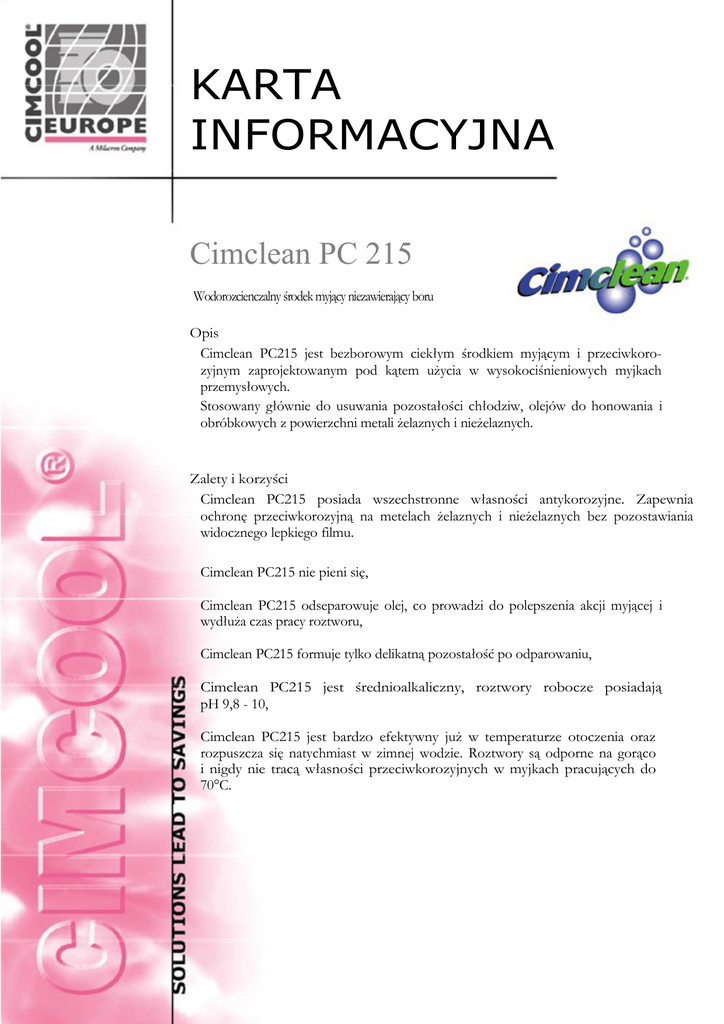 KARTA INFORMACYJNA Cimclean PC 215 Wodorozcienczalny środek myjący niezawierający boru Opis Cimclean PC215 jest bezborowym ciekłym środkiem myjącym i przeciwkorozyjnym zaprojektowanym pod kątem użycia w wysokociśnieniowych myjkach przemysłowych. Stosowany głównie do usuwania pozostałości chłodziw, olejów do honowania i obróbkowych z powierzchni metali żelaznych i nieżelaznych. Zalety i korzyści Cimclean PC215 posiada wszechstronne własności antykorozyjne. Zapewnia ochronę przeciwkorozyjną na metelach żelaznych i nieżelaznych bez pozostawiania widocznego lepkiego filmu. Cimclean PC215 nie pieni się, Cimclean PC215 odseparowuje olej, co prowadzi do polepszenia akcji myjącej i wydłuża czas pracy roztworu, Cimclean PC215 formuje tylko delikatną pozostałość po odparowaniu, Cimclean PC215 jest średnioalkaliczny, roztwory robocze posiadają pH 9,8 - 10, Cimclean PC215 jest bardzo efektywny już w temperaturze otoczenia oraz rozpuszcza się natychmiast w zimnej wodzie. Roztwory są odporne na gorąco i nigdy nie tracą własności przeciwkorozyjnych w myjkach pracujących do 70°C. Sposób użycia Cimclean PC 215 jest produktem łatwo mieszalnym. W celu wymieszania automatycznego należy użyć Cimcool® Mix Master. Typowa temperatura wody użytej do wytworzenia emulsji powinna wynosić 5 25°C. Zalecane stężenia początkowe 2 - 3% miękka woda 3 - 5% średnio twarda woda 3-5% Standardowy proces mycia Zwiększona ochrona korozyjna i zdolności myjące Tabela doboru dysz mieszalnika Mix Master Kolor Brąz Pomar. Zielony Stężenie 1.7 2.0 2.5 Żółtobrąz. 3.7 Nieb. Biały Czerw. Beżowy Czarny 4.4 5.2 7.2 13 22 *Stężenie w dużym stopniu może zależeć od warunków lokalnych. Badanie stężenia Do badania stężenia należy użyć jednej z metod podanych poniżej lub odpowiednich procedur laboratoryjnych dostępnych u lokalnego dostawcy. Współczynnik refraktometru 4.6 W przypadku użycia refraktometru uzyskany odczyt pomnożony przez 4.6 jest miarodajny tylko w przypadku świeżej mieszaniny. Cimcool TA Kit % Odczyt 1 0.84 2 0.70 Użycie 2 ml roztworu 3 4 5 0.57 0.43 0.29 6 0.16 7 0.02 *:następna strzykawka 8 9 10 *.88 *.75 *.61 Przewóz i magazynowanie Chronić przed zamarzaniem, nasłonecznieniem i magazynować w temperaturze 5 - 30°C. Opakowanie 5, 25, 200 i 1000 litrów Karta charakterystyki Karta charakterystyki zawiera szczegółowe dane na temat zdrowia, bezpieczeństwa i środowiska, informacje z karty charakterystyki powinny być brane pod uwagę przez osoby posiadające styczność z produktem lub przewożące je. DYSTRYBUTOR PROFIT-STAT EP Szynkiewicz Sp.j. 05-506 Lesznowola ul. Gminnej Rady Narodowej 29A http://profitstatep.pl/ http://sklep.profitstatep.pl/