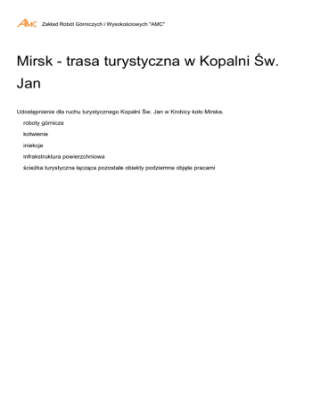 Zakład Robót Górniczych i Wysokościowych "AMC" Mirsk - trasa turystyczna w Kopalni Św. Jan Udostępnienie dla ruchu turystycznego Kopalni Św. Jan w Krobicy koło Mirska. roboty górnicze kotwienie iniekcje infrakstruktura powierzchniowa ścieżka turystyczna łącząca pozostałe obiekty podziemne objęte pracami