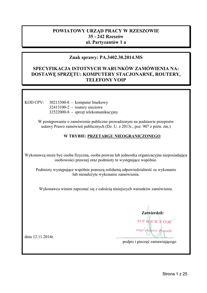 POWIATOWY URZĄD PRACY W RZESZOWIE 35 - 242 Rzeszów ul. Partyzantów 1 a Znak sprawy: PA.3402.30.2014.MS SPECYFIKACJA ISTOTNYCH WARUNKÓW ZAMÓWIENIA NA: DOSTAWĘ SPRZĘTU: KOMPUTERY STACJONARNE, ROUTERY, TELEFONY VOIP KOD CPV: 30213300-8 - komputer biurkowy 32413100-2 - routery sieciowe 32522000-8 - sprzęt telekomunikacyjny W postępowaniu o zamówienie publiczne prowadzonym na podstawie przepisów ustawy Prawo zamówień publicznych (Dz. U. z 2013r., poz. 907 z późn. zm.) W TRYBIE: PRZETARGU NIEOGRANICZONEGO Wykonawcą może być osoba fizyczna, osoba prawna lub jednostka organizacyjna nieposiadająca osobowości prawnej oraz podmioty te występujące wspólnie. Podmioty występujące wspólnie ponoszą solidarną odpowiedzialność za wykonanie lub nienależyte wykonanie zamówienia. Wykonawca winien zapoznać się z całością niniejszych warunków zamówienia. Zatwierdził: dnia 12.11.2014r. ……................................................ podpis i pieczęć zamawiającego Strona 1 z 25 ZAMAWIAJĄCY: Powiatowy Urząd Pracy w Rzeszowie 35 – 242 Rzeszów, ul. Partyzantów 1 a tel. 0-17/ 25-00-100, fax. 862-30-90 zaprasza do złożenia oferty w trybie przetargu nieograniczonego Koszty związane z przygotowaniem i złożeniem oferty ponosi wykonawca. Wszystkie załączniki stanowią integralną część SIWZ. Na podstawie art. 27 ust.1 Pzp Zamawiający dopuszcza porozumiewanie się z Wykonawcami oprócz formy pisemnej również w formie faksu, z tym jednak zastrzeżeniem, że wnioski, oświadczenia, zawiadomienia oraz informacje przesłane tą drogą należy niezwłocznie potwierdzić pisemnie. Zamawiający nie przewiduje porozumiewania się drogą elektroniczną. W sprawach nieuregulowanych w SIWZ pierwszeństwo mają przepisy Pzp i aktów wykonawczych do Pzp. Zamawiający nie dopuszcza możliwości złożenia ofert wariantowych. Zamawiający nie dopuszcza możliwość składania ofert częściowych. Zamawiający nie dopuszcza możliwości złożenia ofert równoważnych. Zamawiający nie przewiduje przeprowadzenia aukcji elektronicznej. Zamawiający nie przewiduje zawierania umowy ramowej. Zamawiający nie przewiduje dynamicznego systemu zakupów. Zamawiający nie wymaga wniesienia zabezpieczenia należytego wykonania umowy. Szczegółowe zasady podpisania, realizacji umowy zawarte są we wzorze umowy Załącznik Nr 4. Zamawiający przewiduje zamówienia uzupełniające zgodnie z przesłankami art. 67 ustawy Prawo zamówień publicznych Zamawiający nie zamierza zwołać zebrania wykonawców. Rozdział I. PRZEDMIOT ZAMÓWIENIA 1. Przedmiotem zamówienia jest: „Dostawa sprzętu: komputery stacjonarne, routery, telefony VoIP” 2. Szczegółowy opis przedmiotu zamówienia zawiera załącznik Nr 5 do niniejszej specyfikacji. 3. Termin realizacji: do 29.12.2014r. Rozdział II. OPIS SPOSOBU PRZYGOTOWANIA OFERTY Ofertę stanowi druk „Formularz ofertowy” z załącznikami i wymaganymi dokumentami. Wykonawca obowiązany jest przygotować ofertę zgodnie z wymaganiami SIWZ. 1) Każdy wykonawca (lub podmioty występujące wspólnie) może złożyć tylko jedną ofertę, zgodnie z wymaganiami określonymi w SIWZ. Złożenie przez jednego wykonawcę lub podmioty występujące wspólnie, więcej niż jednej oferty lub oferty zawierającej rozwiązania alternatywne spowoduje jej odrzucenie zgodnie z wymaganiami określonymi w SIWZ. 2) Osoby uprawnione do reprezentacji wykonawcy lub pełnomocnik muszą złożyć podpisy na: a) załącznikach, Strona 2 z 25 b) w miejscach, w których wykonawca naniósł zmiany, c) w miejscach do tego przeznaczonych. 3) Zamawiający uznaje, że podpisem jest: złożony własnoręcznie znak, z którego można odczytać zgodne z aktualnym dokumentem tożsamości imię i nazwisko podpisującego, a jeżeli własnoręczny znak jest nieczytelny lub nie zawiera imienia i nazwiska, to musi być uzupełniony napisem (np. w formie odcisku stempla), z którego można odczytać imię i nazwisko podpisującego ofertę. 4) Upoważnienie do podpisania oferty powinno być dołączone do oferty, o ile upoważnienie nie wynika z innych dokumentów dołączonych do oferty (zaświadczenia o wpisie do ewidencji działalności gospodarczej, odpisu z Rejestru Handlowego lub Krajowego Rejestru Sądowego). 5) W przypadku, gdy wykonawcę reprezentuje pełnomocnik, do oferty musi być załączone pełnomocnictwo określające jego zakres i podpisane przez osoby uprawnione do reprezentacji wykonawcy. W przypadku złożenia kserokopii pełnomocnictwo musi być potwierdzone za zgodność z oryginałem. 6) Dla uznania ważności, oferta musi zawierać: wszystkie wymagane w SIWZ dokumenty, które należy przedstawić w formie oryginałów lub poświadczone za zgodność z oryginałem ich kopie. Poświadczenie musi być opatrzone podpisem osoby upoważnionej do reprezentowania wykonawcy i opatrzone klauzulą „ZA ZGODNOŚĆ Z ORYGINAŁEM”. 7) Zamawiający zażąda przedstawienia oryginału lub notarialnie potwierdzonej kopii dokumentu wyłącznie wtedy, gdy przedstawiona przez wykonawcę kserokopia dokumentów jest nieczytelna lub budzi wątpliwości, co do jej prawdziwości, a zamawiający nie może sprawdzić jej prawdziwości w inny sposób. 8) Ofertę należy sporządzić w języku polskim z zachowaniem formy pisemnej pod rygorem nieważności (zgodnie art. 9 ust. 1 i 2 ustawy Pzp). 9) Oferta powinna być sporządzona w formie pisemnej przy użyciu nośników pisma nieulegającego usunięciu bez pozostawienia śladów. 10) Załączniki SIWZ, które wykonawca jest zobowiązany złożyć w ofercie, powinny zostać wypełnione przez wykonawcę bez wyjątku ściśle według warunków i postanowień SIWZ. 11) Wszelkie poprawki lub zmiany w tekście oferty muszą być parafowane własnoręcznie przez osobę podpisującą ofertę. 12) Dokumenty i informacje składane w trakcie postępowania stanowiące tajemnicę przedsiębiorstwa (art. 8 ust. 3) z ustawy Prawo zamówień publicznyc