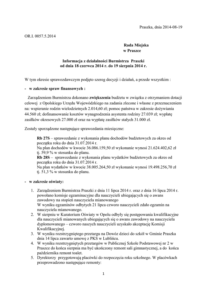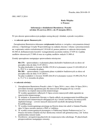 Praszka, dnia 2014-08-19 OR.I. 0057.5.2014 Rada Miejska w Praszce Informacja z działalności Burmistrza Praszki od dnia 18 czerwca 2014 r. do 19 sierpnia 2014 r. W tym okresie sprawozdawczym podjęto szereg decyzji i działań, a przede wszystkim : - w zakresie spraw finansowych : Zarządzeniem Burmistrza dokonano zwiększenia budżetu w związku z otrzymaniem dotacji celowej z Opolskiego Urzędu Wojewódzkiego na zadania zlecone i własne z przeznaczeniem na: wspieranie rodzin wielodzietnych 2.014,60 zł; pomoc państwa w zakresie dożywiania 44.560 zł; dofinansowanie kosztów wynagrodzenia asystenta rodziny 27.039 zł; wypłatę zasiłków okresowych 27.000 zł oraz na wypłatę zasiłków stałych 31.000 zł. Zostały sporządzone następujące sprawozdania miesięczne: Rb 27S – sprawozdanie z wykonania planu dochodów budżetowych za okres od początku roku do dnia 31.07.2014 r. Na plan dochodów w kwocie 36.086.159,50 zł wykonanie wynosi 21.624.402,62 zł tj. 59,9 % w stosunku do planu. Rb 28S – sprawozdanie z wykonania planu wydatków budżetowych za okres od początku roku do dnia 31.07.2014 r. Na plan wydatków w kwocie 38.005.264,50 zł wykonanie wynosi 19.498.256,70 zł tj. 51,3 % w stosunku do planu. - w zakresie oświaty: 1. Zarządzeniem Burmistrza Praszki z dnia 11 lipca 2014 r. oraz z dnia 16 lipca 2014 r. powołano komisje egzaminacyjne dla nauczycieli ubiegających się o awans zawodowy na stopień nauczyciela mianowanego W wyniku egzaminów odbytych 21 lipca czworo nauczycieli zdało egzamin na nauczyciela mianowanego. 2. W sierpniu w Kuratorium Oświaty w Opolu odbyły się postępowania kwalifikacyjne dla nauczycieli mianowanych ubiegających się o awans zawodowy na nauczyciela dyplomowanego – czworo naszych nauczycieli uzyskało akceptację Komisji Kwalifikacyjnej. 3. W wyniku rozstrzygniętego przetargu na Dowóz dzieci do szkół w Gminie Praszka dnia 14 lipca zawarto umowę z PKS w Lublińcu. 4. W wyniku rozstrzygniętych przetargów w Publicznej Szkole Podstawowej nr 2 w Praszce do końca sierpnia ma być ukończony remont sali gimnastycznej, a do końca października remont toalet. 5. Dyrektorzy przygotowują placówki do rozpoczęcia roku szkolnego. W placówkach przeprowadzono następujące remonty: 1 a) W Publicznym Gimnazjum wybrukowany został plac szkolny za łączną kwotę 58.000,00 zł, położona została wykładzina na korytarzu szkolnym na parterze za 19.000,00 zł, wyremontowany został magazyn na sprzęt sportowy, b) W Publicznym Przedszkolu nr 2 wykonano roboty izolacyjne budynku przedszkola, zrobiono odprowadzenie deszczówki, wycyklinowano parkiet, pomalowano sale przedszkolne, gabinet dyrektora i intendentki, wybrukowano plac przedszkolny, c) W oddziale przedszkolnym w Ganie wymieniono 3 okna za kwotę 5.160,00 zł d) W Publicznej Szkole Podstawowej w Kowalach zakupiono 5 okien do zamontowania w sali lekcyjnej, zapleczu kuchennym i korytarzu za kwotę 3.542,57 zł e) W związku z awarią sieci wodno-kanalizacyjnej w Zespole Placówek Specjalnych w Praszce wykonano remont na kwotę 1.800,00 zł, f) W Zespole Szkolno-Przedszkolnym w Strojcu odbył się remont w świetlicy: wymieniono 4 okna, założono wykładzinę podłogową i pomalowano ściany, łączny koszt remontu 9.400,00 zł. - w zakresie infrastruktury technicznej i ochrony środowiska: - w minionym okresie przeprowadzono następujące przetargi: 1/ zagospodarowanie terenu sportowo-rekreacyjnego w Strojcu /2 razy/, 2/ remonty nawierzchni drogowych asfaltem/wykonano/, 3/ remont łazienek w PSP Nr 2 ul. Boczna, 4/ remont elewacji Przedszkola Nr 2 / w wykonaniu/, 5/ remont elewacji PSP Przedmość /przetarg rozstrzygnięty/, 6/ remont c.o. i kotłowni PSP Przedmość / na 28.08.2014r./, 7/ remont dróg w programie schetynówka / realizowany/, 8/ parking przed halą sportową / rozstrzygnięty – LARIX/, 9/ podłoga w hali sportowej /rozstrzygnięty/, 10/ uzbrojenie terenu ul. Powstańców Śl./ rozstrzygnięty/. - wykonano i zapłacono za roboty brukarskie ulic Niemcewicza i Staszica, - wyremontowano również częściowo deptaki na ul. Kościuszki i Kosmonautów, - wyremontowano drogi tłuczniowe w miejscowościach: Wygiełdów, Brzeziny i Sołtrysy. - w zakresie geodezji i gospodarki nieruchomościami: Zgodnie z uchwałą Nr 335/XXXIX/2014 Rady Miejskiej w Praszce z dnia 27 marca 2014 r. w sprawie wyrażenia zgody na nabycie przez Gminę Praszka nieruchomości gruntowych z przeznaczeniem na poszerzenie drogi gminnej Przedmość - Kozieł - Aleksandrów i na poszerzenie rowu melioracyjnego stanowiącego własność Gminy Praszka , aktem notarialnym Rep. A nr 5406/2014 z dnia 24 lipca 2014 r. zostały nabyte od osób fizycznych działki oznaczone na arkuszu mapy 1 obrębu Kozieł nr : - 258/1 o pow. 0,0090 ha za cenę 1 426,00 zł , - 90/3 o pow. 0,0077 ha za cenę 1 220,00 zł , - 276/1 o pow. 0,0068 ha i 280/1 o pow. 0,0053 ha za cenę 1 918,00 zł , - 284/1 o pow. 0,0017 ha , 285/1 o pow. 0,0008 ha , 286/1 o pow. 0,0015 ha i 287/1 o pow. 0,0025 ha za cenę 1 030,00 zł , - 288/1 o pow. 0,0040 ha i 289/1 o pow. 0,0067 ha za cenę 1 696,00 zł 2 oraz aktem notarialnym Rep.A nr 5728/2014 z dnia 7 sierpnia 2014 r. została nabyta działka oznaczona na arkuszu mapy 1 obrębu Kozieł nr 282/1 o pow. 0,0126 ha za cenę 1 903,00 zł . Zgodnie z uchwałą Nr 228/XXVI/2013 Rady Miejskiej w Praszce z dnia 19 lutego 2013 r. w sprawie wyrażenia zgody na nabycie przez Gminę Praszka nieruchomości gruntowych z przeznaczeniem na poszerzenie drogi gminnej Przedmość - Kozieł - Aleksandrów, aktem notarialnym Rep.A nr 5882/2014 z dnia 13 sierpnia 2014 r. została nabyta działka oznaczona na arkuszu mapy 1 obrębu Kozieł nr 260/1 o pow. 0,0045 ha za cenę 710,00 zł. - w zakresie działalności Straży Miejskiej: 1/ W omawianym okresie – czerwiec do sierpień strażnicy miejscy trzy razy udzielali asysty pracownikom OPS w związku z wykonywaniem czynności służbowych u podopiecznych, 
