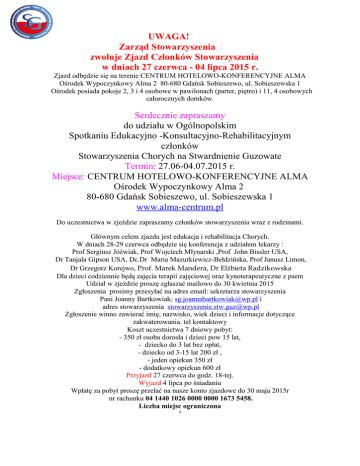 UWAGA! Zarząd Stowarzyszenia zwołuje Zjazd Członków Stowarzyszenia w dniach 27 czerwca - 04 lipca 2015 r. Zjazd odbędzie się na terenie CENTRUM HOTELOWO-KONFERENCYJNE ALMA Ośrodek Wypoczynkowy Alma 2 80-680 Gdańsk Sobieszewo, ul. Sobieszewska 1 Ośrodek posiada pokoje 2, 3 i 4 osobowe w pawilonach (parter, piętro) i 11, 4 osobowych całorocznych domków. Serdecznie zapraszamy do udziału w Ogólnopolskim Spotkaniu Edukacyjno -Konsultacyjno-Rehabilitacyjnym członków Stowarzyszenia Chorych na Stwardnienie Guzowate Termin: 27.06-04.07.2015 r. Miejsce: CENTRUM HOTELOWO-KONFERENCYJNE ALMA Ośrodek Wypoczynkowy Alma 2 80-680 Gdańsk Sobieszewo, ul. Sobieszewska 1 www.alma-centrum.pl Do uczestnictwa w zjeździe zapraszamy członków stowarzyszenia wraz z rodzinami. Głównym celem zjazdu jest edukacja i rehabilitacja Chorych. W dniach 28-29 czerwca odbędzie się konferencja z udziałem lekarzy : Prof Sergiusz Jóźwiak, Prof Wojciech Młynarski ,Prof John Bissler USA, Dr Tanjala Gipson USA, Dc.Dr Maria Mazurkiewicz-Bełdzińska, Prof Janusz Limon, Dr Grzegorz Korejwo, Prof. Marek Mandera, Dr Elżbieta Radzikowska Dla dzieci codziennie będą zajęcia terapii zajęciowej oraz kynoterapeutyczne z psem Udział w zjeździe proszę zgłaszać mailowo do 30 kwietnia 2015 Zgłoszenia prosimy przesyłać na adres email: sekretarza stowarzyszenia Pani Joanny Bartkowiak; [email protected] i adres stowarzyszenia [email protected] Zgłoszenie winno zawierać imię, nazwisko, wiek dzieci i informacje dotyczące zakwaterowania. tel kontaktowy Koszt uczestnictwa 7 dniowy pobyt: - 350 zł osoba dorosła i dzieci pow 15 lat, - dziecko do 3 lat bez opłat, - dziecko od 3-15 lat 200 zł , - jeden opiekun 350 zł - dodatkowy opiekun 600 zł Przyjazd 27 czerwca do godz. 18-tej. Wyjazd 4 lipca po śniadaniu Wpłatę za pobyt proszę przelać na nasze konto zjazdowe do 30 maja 2015r nr rachunku 04 1440 1026 0000 0000 1673 5458. Liczba miejsc ograniczona d
