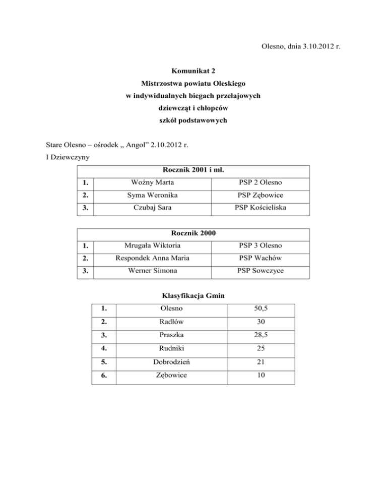 Olesno, dnia 3.10.2012 r. Komunikat 2 Mistrzostwa powiatu Oleskiego w indywidualnych biegach przełajowych dziewcząt i chłopców szkół podstawowych Stare Olesno – ośrodek „ Angol” 2.10.2012 r. I Dziewczyny Rocznik 2001 i mł. 1. Woźny Marta PSP 2 Olesno 2. Syma Weronika PSP Zębowice 3. Czubaj Sara PSP Kościeliska Rocznik 2000 1. Mrugała Wiktoria PSP 3 Olesno 2. Respondek Anna Maria PSP Wachów 3. Werner Simona PSP Sowczyce Klasyfikacja Gmin 1. Olesno 50,5 2. Radłów 30 3. Praszka 28,5 4. Rudniki 25 5. Dobrodzień 21 6. Zębowice 10 Klasyfikacja Szkół 1 PSP 3 Olesno 27 pkt 2 PSP Kościeliska 24 pkt 3 PSP Żytniów 15 Pkt 4 PSP Dobrodzień 13 Pkt 5 PSP Strojec 10,5 Pkt 6 PSP Zębowice 10 Pkt 7 PSP 2 Olesno PSP 2 Praszka 9 PSP 4 Praszka 10 PSP Sowczyce PSP Wachów 9 Pkt 9 Pkt 7 Pkt PSP Turza 13 PSP Dalachów PSP Sternalice 15 PSP Jaworzno 16 PSP Szemrowice PSP Kowale 18 PSP Wojciechów 6 Pkt 4 Pkt 1 Pkt 0,5 Pkt I Chłopcy Rocznik 2001 i mł. 1. Lerche Kamil PSP Sternalice 2. Pielok Jakub PSP Dobrodzień 3. Pytel Kamil PSP Zębowice Rocznik 2000 1. Woźny Michał PSP 2 Olesno 2. Kalus Oliver PSP 2 Olesno 3. Pyra Damian PSP 4 Praszka Klasyfikacja Gmin 1. Olesno 39 pkt 2. Dobrodzień 34 pkt 3. Praszka 29 pkt 4. Radłów 26 pkt 5. Rudniki 24 pkt 6. Zębowice 11 pkt Klasyfikacja Szkół 1 PSP 2 Olesno 2 PSP Sternalice PSP Dobrodzień 30 pkt 18 Pkt 4. PSP 4 Praszka 15 Pkt 5. PSP Strojec 14 pkt 6. PSP Zębowice 11 Pkt 7. PSP Cieciułów PSP Żytniów 9. 9 Pkt PSP Kościeliska PSP Turza PSP Pludry 8 Pkt 12. PSP 3 Olesno 13. PSP Sowczyce PSP Dalachów 15. PSP Jaworzno 5 Pkt 4 Pkt 2 pkt Sędzia główny zawodów: Jan Stanisławczyk Organizator: Jan Chmielewski Do wiadomości: 1. Gminni Koordynatorzy Sportu 2. PSP : 3 Olesno, 2 Olesno, Sowczyce, Wojciechów, Wachów, Żytniów, Dalachów, Jaworzno, Kościeliska, Sternalice, Dobrodzień, Turza, Szemrowice, 2 Praszka, 4 Praszka, Strojec, Kowale, Zębowice, Cieciułów, Pludry 3. Prasa, 4. a/a