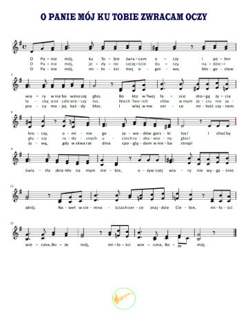 O PANIE MÓJ KU TOBIE ZWRACAM OCZY          O O O mój, mój, mój, ku je mi   Pa Pa Pa nie nie nie To dy ło   bie ne ści zwra cam szczę ście mej o     o du gni  czy szy, wo,   i na bło pe łen dzie i go sław  3                  wia ła pra ry w nie bo wzno szę ską zroś czło wie czy cy mo jej każ dy głos. los. kłos. Bo kto w Twej Niech Two ich I wlej w me      ła słów ser sce dro gą ży cia w mym ży ciu nie za ce mi łość czy nem         6     kro głu ży        czy, szy wą,              go u dnia za wo dów gorz ki ciech ro zba wio ny spo glą dam w nie ba los! głos! strop! I  o mi nie ra do snych gdy w skwa rze  choć by 9     świa           tła nie bie, zbra kło na mym                    o żyw czej wia ry nie wy ga śnie 12          Na mno ściach ser     zdrój. wet w cie      ce znaj dzie   Cie          bie, mi ło 15     wie      czna, Bo że mój,               mi ło wie czna, Bo że mój. ści C  ści