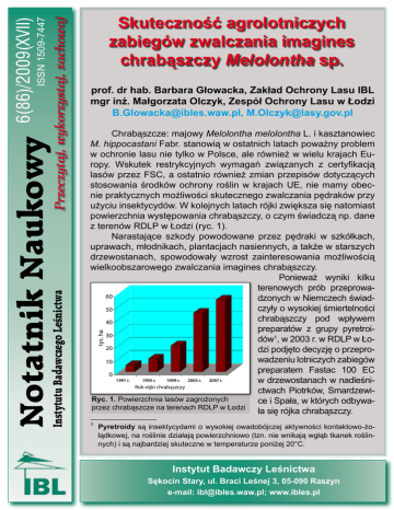 Instytutu Badawczego Leśnictwa prof. dr hab. Barbara Głowacka, Zakład Ochrony Lasu IBL mgr inż. Małgorzata Olczyk, Zespół Ochrony Lasu w Łodzi [email protected], [email protected] Chrabąszcze: majowy Melolontha melolontha L. i kasztanowiec M. hippocastani Fabr. stanowią w ostatnich latach poważny problem w ochronie lasu nie tylko w Polsce, ale również w wielu krajach Europy. Wskutek restrykcyjnych wymagań związanych z certyfikacją lasów przez FSC, a ostatnio również zmian przepisów dotyczących stosowania środków ochrony roślin w krajach UE, nie mamy obecnie praktycznych możliwości skutecznego zwalczania pędraków przy użyciu insektycydów. W kolejnych latach rójki zwiększa się natomiast powierzchnia występowania chrabąszczy, o czym świadczą np. dane z terenów RDLP w Łodzi (ryc. 1). Narastające szkody powodowane przez pędraki w szkółkach, uprawach, młodnikach, plantacjach nasiennych, a także w starszych drzewostanach, spowodowały wzrost zainteresowania możliwością wielkoobszarowego zwalczania imagines chrabąszczy. Ponieważ wyniki kilku terenowych prób przeprowa60 dzonych w Niemczech świadczyły o wysokiej śmiertelności 50 chrabąszczy pod wpływem 40 preparatów z grupy pyretroi30 dów1, w 2003 r. w RDLP w Ło20 dzi podjęto decyzję o przeprowadzeniu lotniczych zabiegów 10 preparatem Fastac 100 EC 0 1991 r. 1995 r. 1999 r. 2003 r. 2007 r. w drzewostanach w nadleśniRok rójki chrabąszczy ctwach Piotrków, SmardzewiRyc. 1. Powierzchnia lasów zagrożonych ce i Spała, w których odbywaprzez chrabąszcze na terenach RDLP w Łodzi ła się rójka chrabąszczy. tys. ha Przeczytaj, wykorzystaj, zachowaj ISSN 1509-7447 Notatnik Naukowy 6(86)/2009(XVII) Skuteczność agrolotniczych zabiegów zwalczania imagines chrabąszczy Melolontha sp. 1 Pyretroidy są insektycydami o wysokiej owadobójczej aktywności kontaktowo-żołądkowej, na roślinie działają powierzchniowo (tzn. nie wnikają wgłąb tkanek roślinnych) i są najbardziej skuteczne w temperaturze poniżej 20°C. Instytut Badawczy Leśnictwa Sękocin Stary, ul. Braci Leśnej 3, 05-090 Raszyn e-mail: [email protected]; www.ibles.pl a Ryc. 2. Martwe chrabąszcze po zabiegu preparatem Fastac 100 EC W dniach 8-15 maja opryskano ogółem około 10 tys. ha drzewostanów, stosując insektycyd w dawce 0,07 l/ha zmieszany z wodą i adiuwantem Ikar. Jednakże, pomimo początkowych wyraźnych efektów (ryc. 2), działanie preparatu okazało się krótb kotrwałe i powstała konieczność wykonania Ryc. 3. Liście dębu z drzewostanu opryskanego w dniach 16-24 maja powtórnego oprysku Mospilanem 20 SP (a) i nieopryskanego (b) na części traktowanej powierzchni (tab.1). Przeprowadzona we wrześniu 2003 r. ocena zasiedlenia gleb wykazała wysoką liczebność 1-rocznych pędraków chrabąszczy, zarówno na terenach opryskanych pyretroidem, jak i nieopryskanych. M.in. w Nadleśnictwie Spała w dołach kontrolnych znajdowano do 38 osobników. Prawdopodobną przyczyną niskiej skuteczności zabiegu zwalczania był spadek aktywności pyretroidu podczas trwającej kilka tygodni rójki chrabąszczy. W czasie kolejnej rójki w 2007 r. w wymienionych powyżej 3 nadleśnictwach RDLP w Łodzi przeprowadzono zabiegi zwalczania chrabąszczy mieszaniną pyretroidu Decis 2,5 EC i preparatu Mospilan 20 SP z grupy związków neonikotynoidowych2. Lotnicze opryski wykonano w dniach 13-20 maja, stosując Mospilan 20 SP w dawce 0,4 kg/ha zmieszany z Decisem 2,5 EC w dawce 0,3 l/ha oraz wodą i adiuwantem Ikar 95 EC. Tab. 1. Zwalczanie imagines chrabąszczy preparatem Fastac 100 EC na terenie RDLP w Łodzi w 2003 r. Nadleśnictwo Piotrków I oprysk II oprysk Ogółem Nadleśnictwo Powierzchnia [ha] Piotrków 2498,8 Smardzewice 2133,1 11522,0 Spała 6409,5 15092,9 Ogółem: 223 223 446 Smardzewice 2066,4 1058,5 3124,9 Spała 7795,2 3726,8 10085,6 5008,3 Ogółem: 2 Powierzchnia [ha] Tab. 2. Zwalczanie imagines chrabąszczy mieszaniną preparatów Decis 2,5 EC i Mospilan 20 SP na terenie RDLP w Łodzi w 2007 r. 11439,4 Neonikotynoidy są insektycydami o o aktywności kontaktowo-żołądkowej, na roślinie działają układowo (tzn. przenikają wgłąb rośliny i przemieszczają się w niej, wnikając również do rozwijających się liści). Nie są tak wrażliwe na wysokie temperatury, jak pyretroidy. średnio Borki Malomierz Żądlowice Jasień Potok średnio Lubiszewo Malecz Kierz Czólna Liczba pędraków/dół próbny Równocześnie przeprowadzono eksperymentalne opryski stosując sam Mospilan 20 SP w celu stwierdzenia możliwości zwalczania chrabąszczy preparatem neonikotynoidowym bez dodatku pyretroidu. Ze względu na ograniczenia w możliwości wykonywania oprysków, spośród zagrożonych 40 tys. ha drzewostanów, zabiegami objęto jedynie 11,5 tys. ha. Ocena skuteczności zabiegów wyko- Ryc. 4. Nadleśnictwo Spała, Obręb Lubochnia (drzewostany nana bezpośrednio po opry- opryskane) i Spała (nieopryskane) skach wykazała, że zarówno Mospilan 20 SP z Decisem 2,5 EC, jak i sam Mospilan 20 SP (ryc. 3 a, b) spowodowały wysoką śmiertelność chrabąszczy i chroniły liście dębów przed uszkodzeniami. Jesienią 2009 r. w ramach ostatecznej oceny skuteczności zabiegów zwalczania, w Nadleśnictwie Spała (ryc. 4.) w dwu obrębach: Lubochnia (gdzie drzewostany zostały opryskane w 2007 r.) i Spała (drzewostany nieopryskane) przeprowadzono porównawczą analizę liczebności 3-letnich pędraków w dołach próbnych oraz uszkodzeń 1-rocznych upraw przez 3-letniego pędraka. Przedstawione na ryc. 5 dane wskazują, że w przeciwieństwie do przeprowadzonych w 2003 r. zabiegów preparatem Fastac 100 EC, opryski mieszaniną preparatów Decis 2,5 EC i Mospilan 20 SP spowodowały znaczną redukcję liczebności pędraków w porównaniu z terenami nieopryskanymi. Również porównanie uszkodzeń spowodowanych w 2009 r. przez 3-letnie pędraki w 1-rocznych odnowieniach sztucznych wskazuje, że na terenach opr