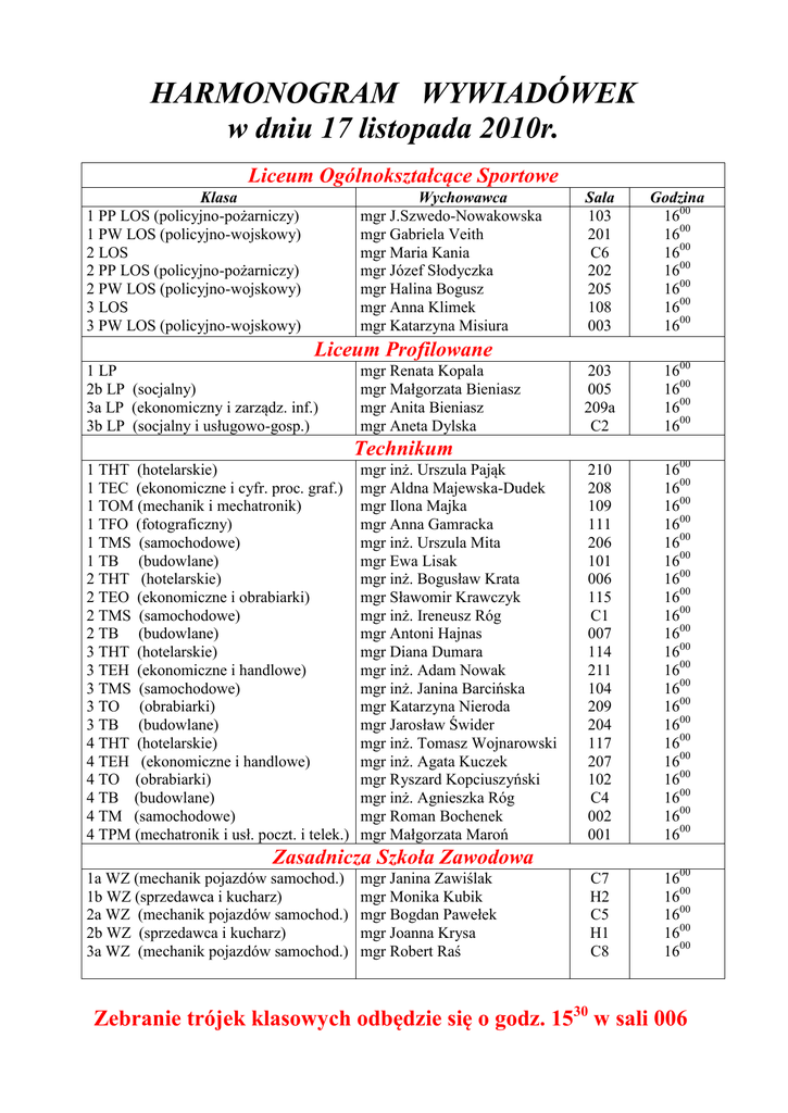 HARMONOGRAM WYWIADÓWEK w dniu 17 listopada 2010r.