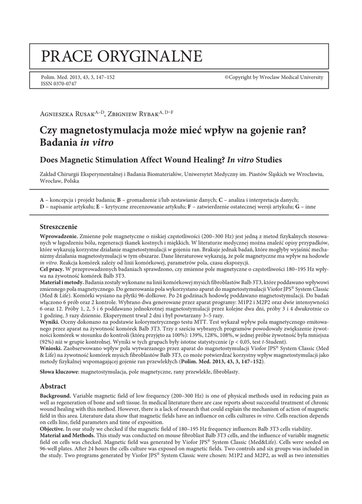 prace oryginalne Polim. Med. 2013, 43, 3, 147–152 ISSN 0370-0747 © Copyright by Wroclaw Medical University Agnieszka RusakA–D, Zbigniew RybakA, D–F Czy magnetostymulacja może mieć wpływ na gojenie ran? Badania in vitro Does Magnetic Stimulation Affect Wound Healing? In vitro Studies Zakład Chirurgii Eksperymentalnej i Badania Biomateriałów, Uniwersytet Medyczny im. Piastów Śląskich we Wrocławiu, Wrocław, Polska A – koncepcja i projekt badania; B – gromadzenie i/lub zestawianie danych; C – analiza i interpretacja danych; D – napisanie artykułu; E – krytyczne zrecenzowanie artykułu; F – zatwierdzenie ostatecznej wersji artykułu; G – inne Streszczenie Wprowadzenie. Zmienne pole magnetyczne o niskiej częstotliwości (200–300 Hz) jest jedną z metod fizykalnych stosowanych w łagodzeniu bólu, regeneracji tkanek kostnych i miękkich. W literaturze medycznej można znaleźć opisy przypadków, które wykazują korzystne działanie magnetostymulacji w gojeniu ran. Brakuje jednak badań, które mogłyby wyjaśnić mechanizmy działania magnetostymulacji w tym obszarze. Dane literaturowe wykazują, że pole magnetyczne ma wpływ na hodowle in vitro. Reakcja komórek zależy od linii komórkowej, parametrów pola, czasu ekspozycji. Cel pracy. W przeprowadzonych badaniach sprawdzono, czy zmienne pole magnetyczne o częstotliwości 180–195 Hz wpływa na żywotność komórek Balb 3T3. Materiał i metody. Badania zostały wykonane na linii komórkowej mysich fibroblastów Balb 3T3, które poddawano wpływowi zmiennego pola magnetycznego. Do generowania pola wykorzystano aparat do magnetostymulacji Viofor JPS® System Classic (Med & Life). Komórki wysiano na płytki 96-dołkowe. Po 24 godzinach hodowlę poddawano magnetostymulacji. Do badań włączono 6 prób oraz 2 kontrole. Wybrano dwa generowane przez aparat programy: M1P2 i M2P2 oraz dwie intensywności 6 oraz 12. Próby 1, 2, 5 i 6 poddawano jednokrotnej magnetostymulacji przez kolejne dwa dni, próby 3 i 4 dwukrotnie co 1 godzinę, 3 razy dziennie. Eksperyment trwał 2 dni i był powtarzany 3–5 razy. Wyniki. Oceny dokonano na podstawie kolorymetrycznego testu MTT. Test wykazał wpływ pola magnetycznego emitowanego przez aparat na żywotność komórek Balb 3T3. Trzy z sześciu wybranych programów powodowały zwiększenie żywotności komórek w stosunku do kontroli (którą przyjęto za 100%): 139%, 128%, 108%, w jednej próbie żywotność była mniejsza (92%) niż w grupie kontrolnej. Wyniki w tych grupach były istotne statystycznie (p < 0,05, test t-Student). Wnioski. Zaobserwowano wpływ pola wytwarzanego przez aparat do magnetostymulacji Viofor JPS® System Classic (Med & Life) na żywotność komórek mysich fibroblastów Balb 3T3, co może potwierdzać korzystny wpływ magnetostymulacji jako metody fizykalnej wspomagającej gojenie ran przewlekłych (Polim. Med. 2013, 43, 3, 147–152). Słowa kluczowe: magnetostymulacja, pole magnetyczne, rany przewlekłe, fibroblasty. Abstract Background. Variable magnetic field of low frequency (200–300 Hz) is one of physical methods used in reducing pain as well as regeneration of bone and soft tissue. In medical literature there are case reports about successful treatment of chronic wound healing with this method. However, there is a lack of research that could explain the mechanism of action of magnetic field in this area. Literature data show that magnetic fields have an influence on cells cultures in vitro. Cells reaction depends on cells line, field parameters and time of exposition. Objective. In our study we checked if the magnetic field of 180–195 Hz frequency influences Balb 3T3 cells viability. Material and Methods. This study was conducted on mouse fibroblast Balb 3T3 cells, and the influence of variable magnetic field on cells was checked. Magnetic field was generated by Viofor JPS® System Classic (Med&Life). Cells were seeded on 96-well plates. After 24 hours the cells culture was exposed on magnetic fields. Two controls and six groups was included in the study. Two programs generated by Viofor JPS® System Classic were chosen: M1P2 and M2P2, as well as two intensities 148 A. Rusak, Z. Rybak 6 and 12. Groups 1, 2, 5 i 6 were exposed once within two days, groups 3 and 4 were exposed three times a day every hour within two days. Experiment lasted two days and was repeated 3–5 times. Results. Experiment was evaluated with colorimetric MTT test. The test showed influence of magnetic field generated by Viofor JPS® System Classic on viability of Balb 3T3 cells. Three from six chosen programs resulted in the increase of viability, compare to control. The control was taken as 100%. In groups 139%, 128%, 108% and 92% of viability was noted. Results were statisticaly significant in four groups (p < 0.05, Student’s t test). Conclusions. The influence of magnetic fields generated by Viofor JPS® System Classic (Med&Life) on mouse fibroblast Balb 3T3 cells was noted. Results suggest potential beneficial effect of this physical method on chronic wound treatment (Polim. Med. 2013, 43, 3, 00–00). Key words: magnetostimulation, magnetic fields, chronic wounds, fibroblasts. Wpływ zmiennego pola magnetycznego o niskiej częstotliwości nieprzekraczającej 200–300 Hz na poprawę zdrowia pacjentów jest szeroko przedstawiany w literaturze medycznej [1, 2]. Zmienne pole elektromagnetyczne, jako metoda fizykalna, znajduje obecnie zwolenników stosowania w gojeniu ran (w tym także oparzeniowych). Oddziaływaniu pola przypisuje się wpływ na proliferację komórek, poprawę krążenia obwodowego (m.in. w owrzodzeniach goleni, angiopatii cukrzycowej), korzystne działanie w rehabilitacji, terapii chorób neurologicznych oraz w stomatologii w uśmierzaniu bólu czy regeneracji tkanki kostnej, w okulistyce w powikłaniach neurologicznych po urazach [1, 2]. Pole magnetyczne nie jest obojętne dla organizmów. Badania z podwójnie ślepą próbą wykazuj