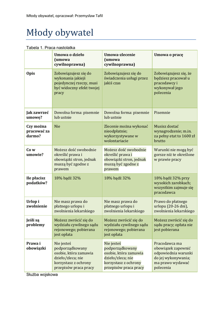Młody obywatel, opracował: Przemysław Tafil Młody obywatel Tabela 1. Praca nastolatka Umowa o dzieło (umowa cywilnoprawna) Umowa-zlecenie (umowa cywilnoprawna) Umowa o pracę Opis Zobowiązujesz się do wykonania jakiejś pojedynczej rzeczy, musi być widoczny efekt twojej pracy Zobowiązujesz się do świadczenia usługi przez jakiś czas Zobowiązujesz się, że będziesz pracował u pracodawcy i wykonywał jego polecenia Jak zawrzeć umowę? Dowolna forma: pisemnie lub ustnie Dowolna forma: pisemnie lub ustnie Pisemnie Czy można pracować za darmo? Nie Zlecenie można wykonać nieodpłatnie; wykorzystywane w wolontariacie Musisz dostać wynagrodzenie; m.in. za pełny etat to 1600 zł brutto Co w umowie? Możesz dość swobodnie określić prawa i obowiązki stron, jednak muszą być zgodne z prawem Możesz dość swobodnie określić prawa i obowiązki stron, jednak muszą być zgodne z prawem Warunki nie mogą być gorsze niż te określone w prawie pracy Ile płacisz podatków? 18% bądź 32% 18% bądź 32% 18% bądź 32% przy wysokich zarobkach; wszystkim zajmuje się pracodawca Urlop i zwolnienie Nie masz prawa do płatnego urlopu i zwolnienia lekarskiego Nie masz prawa do płatnego urlopu i zwolnienia lekarskiego Prawo do płatnego urlopu (20-26 dni), zwolnienia lekarskiego Jeśli są problemy Możesz zwrócić się do wydziału cywilnego sądu rejonowego; pobierana jest opłata Możesz zwrócić się do wydziału cywilnego sądu rejonowego; pobierana jest opłata Możesz zwrócić się do sądu pracy; opłata nie jest pobierana Prawa i obowiązki Nie jesteś podporządkowany osobie, która zamawia dzieło/zleca; nie korzystasz z ochrony przepisów praca pracy Nie jesteś podporządkowany osobie, która zamawia dzieło/zleca; nie korzystasz z ochrony przepisów praca pracy Pracodawca ma obowiązek zapewnić odpowiednia warunki do jej wykonywania; ma prawo wydawać polecenia Służba wojskowa Młody obywatel, opracował: Przemysław Tafil · · · · · · · Ostatni przymusowy pobór do wojska odbył się w 2008 r. Zamiast poboru wprowadzono kwalifikację wojskową. Obecnie rejestrację prowadzi się na podstawie danych osobowych uzyskanych z ewidencji ludności prowadzonej przez wójtów lub burmistrzów. Każdy mężczyzna, który kończy w danym roku 19 lat musi zgłosić się do kwalifikacji wojskowej (zgłosić się również mogą kobiety). Przeprowadzane są badania medyczne mające na celu ustalenie zdolności do odbycia służby wojskowej. Osoby, które nie chcą odbywać służby wojskowej są przenoszone do rezerwy i otrzymują zaświadczenie o uregulowanym stosunku do służby wojskowej. W razie niestawienia się, nakłada się na osobę grzywną i/lub doprowadza za pomocą Policji. Kategorie o A – zdolny do służby o B – czasowo niezdolny o D – niezdolny do służby w czasie pokoju o E – trwale niezdolny do służby Co się zmieniło w zakresie powszechnego obowiązku obrony? Najistotniejszą zmianą jest inny sposób i zakres spełniania obowiązku służby wojskowej, który obecnie polega na ochotniczym pełnieniu służby przygotowawczej, pełnieniu okresowej służby wojskowej przez żołnierzy rezerwy oraz odbywaniu ćwiczeń wojskowych przez żołnierzy rezerwy. doprecyzowano zakres spełniania powszechnego obowiązku obrony o problematykę wykonywania zadań w ramach nadanych przydziałów kryzysowych, przydziałów mobilizacyjnych oraz pracowniczych przydziałów mobilizacyjnych. W nowych przepisach uwzględnia się też nową formę edukacji dla bezpieczeństwa zamiast przysposobienia obronnego oraz możliwość odbywania ćwiczeń w jednostkach organizacyjnych przewidzianych do militaryzacji. Narodowe Siły Rezerwowe (NSR) tworzą żołnierze rezerwy, którym nadano przydziały kryzysowe. NSR stanowią wzmocnienie potencjału jednostek wojennych. Zasadniczym zadaniem NSR jest zapewnienie suwerenności państwa, bezpieczeństwa i pokoju. Mogą one także brać udział w zwalczaniu klęsk żywiołowych i likwidacji ich skutków, działaniach antyterrorystycznych i z zakresu ochrony mienia, akcjach poszukiwawczych oraz ratowania lub ochrony zdrowia i życia ludzkiego itp. Służbę przygotowawczą wprowadzono w celu gromadzenia zasobów osobowych na potrzeby Narodowych Sił Rezerwowych. Ten nowy rodzaj służby wojskowej jest przeznaczony przede wszystkim dla ochotników, którzy wcześniej nie pełnili jakiegokolwiek rodzaju czynnej służby wojskowej i zamierzają podjąć obowiązki w ramach NSR. Służba przygotowawcza wychodzi również naprzeciw oczekiwaniom osób, które identyfikują się ze służbą wojskową, jednak nie zamierzają na stałe wiązać się z zawodem żołnierza. o Adresowana jest do osób przeniesionych do rezerwy, w tym żołnierzy rezerwy, którzy dotychczas nie odbywali czynnej służby wojskowej oraz ochotników, którzy zgłoszą się do jej odbycia i nie podlegają obowiązkowi odbycia zasadniczej służby wojskowej. o Do służby przygotowawczej może być powołana osoba nie karana za przestępstwo umyślne, posiadająca obywatelstwo polskie, odpowiednią zdolność fizyczną i psychiczną do pełnienia czynnej służby wojskowej, wiek co najmniej osiemnastu lat i wykształcenie: § co najmniej wyższe – w przypadku kształcenia na potrzeby korpusu oficerów; § co najmniej średnie – w przypadku kształcenia na potrzeby korpusu podoficerów; § co najmniej gimnazjalne – w przypadku kształcenia na potrzeby korpusu szeregowych. Kobiety w wojsku o Od 1999 r. kobiety mogą kształcić się w szkołach wojskowych o Mogą pełnić służbę wojskową na wszystkich stanowiskach służbowych Sił Zbrojnych RP Młody obywatel, opracował: Przemysław Tafil o o · · · · · · · · · · · · · Umożliwiono kobietom stawienie się w trybie ochotniczym do kwalifikacji wojskowej, niezależnie od posiadanych kwalifikacji i wykształcenia, jeżeli ukończyły co najmniej osiemnaście lat życia, do końca roku k