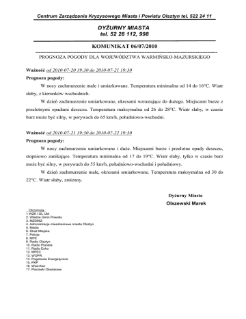 Centrum Zarządzania Kryzysowego Miasta i Powiatu Olsztyn tel. 522 24 11 DYśURNY MIASTA tel. 52 28 112, 998 KOMUNIKAT 06/07/2010 -------------------------------------------------------------------------------------------------------------PROGNOZA POGODY DLA WOJEWÓDZTWA WARMIŃSKO-MAZURSKIEGO WaŜność od 2010-07-20 19:30 do 2010-07-21 19:30 Prognoza pogody: W nocy zachmurzenie małe i umiarkowane. Temperatura minimalna od 14 do 16°C. Wiatr słaby, z kierunków wschodnich. W dzień zachmurzenie umiarkowane, okresami wzrastające do duŜego. Miejscami burze z przelotnymi opadami deszczu. Temperatura maksymalna od 26 do 28°C. Wiatr słaby, w czasie burz moŜe być silny, w porywach do 65 km/h, południowo-wschodni. WaŜność od 2010-07-21 19:30 do 2010-07-22 19:30 Prognoza pogody: W nocy zachmurzenie umiarkowane i duŜe. Miejscami burze i przelotne opady deszczu, stopniowo zanikające. Temperatura minimalna od 17 do 19°C. Wiatr słaby, tylko w czasie burz moŜe być silny, w porywach do 55 km/h, południowo-wschodni i południowy. W dzień zachmurzenie małe, okresami umiarkowane. Temperatura maksymalna od 30 do 22°C. Wiatr słaby, zmienny. DyŜurny Miasta Olszewski Marek Otrzymują : 1 WZK i OL UM 2. Władze Gmin Powiatu 3. MZDMiZ 4. Administracje mieszkaniowe miasta Olsztyn 5. Media 6. StraŜ Miejska 7. Policja 8. MPK 9. Radio Olsztyn 10. Radio Planeta 11. Radio Eska 12. MPEC 13. WOPR 14. Pogotowie Energetyczne 15. PKP 16 .Wod-Kan 17. Placówki Oświatowe