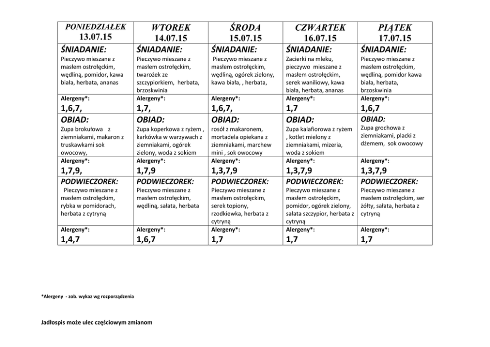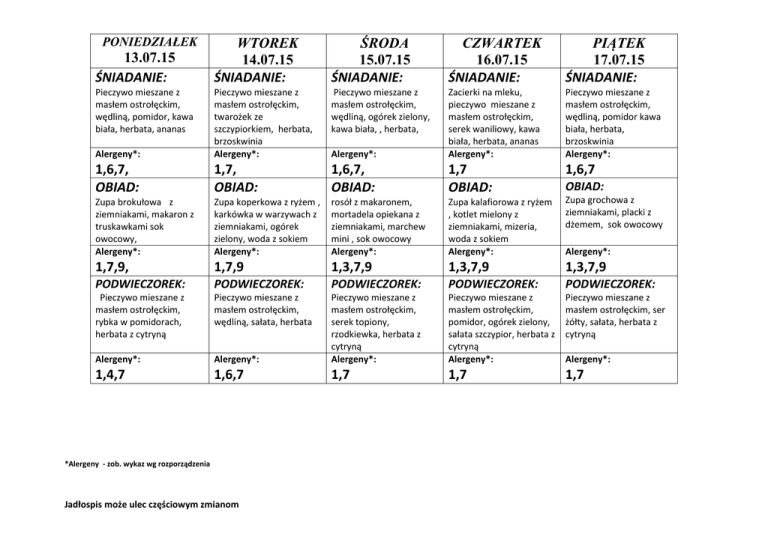 PONIEDZIAŁEK WTOREK 14.07.15 ŚNIADANIE: ŚRODA 15.07.15 ŚNIADANIE: CZWARTEK 16.07.15 ŚNIADANIE: PIĄTEK 17.07.15 ŚNIADANIE: Pieczywo mieszane z masłem ostrołęckim, wędliną, ogórek zielony, kawa biała, , herbata, Alergeny*: Pieczywo mieszane z masłem ostrołęckim, twarożek ze szczypiorkiem, herbata, brzoskwinia Alergeny*: Alergeny*: Zacierki na mleku, pieczywo mieszane z masłem ostrołęckim, serek waniliowy, kawa biała, herbata, ananas Alergeny*: Pieczywo mieszane z masłem ostrołęckim, wędliną, pomidor kawa biała, herbata, brzoskwinia Alergeny*: 1,6,7, OBIAD: 1,7, OBIAD: 1,6,7, OBIAD: 1,7 OBIAD: 1,6,7 Zupa brokułowa z ziemniakami, makaron z truskawkami sok owocowy, Alergeny*: Zupa koperkowa z ryżem , karkówka w warzywach z ziemniakami, ogórek zielony, woda z sokiem Alergeny*: rosół z makaronem, mortadela opiekana z ziemniakami, marchew mini , sok owocowy Alergeny*: Zupa kalafiorowa z ryżem , kotlet mielony z ziemniakami, mizeria, woda z sokiem Alergeny*: Zupa grochowa z ziemniakami, placki z dżemem, sok owocowy 1,7,9, 1,7,9 1,3,7,9 1,3,7,9 1,3,7,9 PODWIECZOREK: PODWIECZOREK: PODWIECZOREK: PODWIECZOREK: PODWIECZOREK: Pieczywo mieszane z masłem ostrołęckim, rybka w pomidorach, herbata z cytryną Pieczywo mieszane z masłem ostrołęckim, wędliną, sałata, herbata Alergeny*: Pieczywo mieszane z masłem ostrołęckim, pomidor, ogórek zielony, sałata szczypior, herbata z cytryną Alergeny*: Pieczywo mieszane z masłem ostrołęckim, ser żółty, sałata, herbata z cytryną Alergeny*: Pieczywo mieszane z masłem ostrołęckim, serek topiony, rzodkiewka, herbata z cytryną Alergeny*: 1,4,7 1,6,7 1,7 1,7 1,7 13.07.15 ŚNIADANIE: Pieczywo mieszane z masłem ostrołęckim, wędliną, pomidor, kawa biała, herbata, ananas *Alergeny - zob. wykaz wg rozporządzenia Jadłospis może ulec częściowym zmianom OBIAD: Alergeny*: Alergeny*: