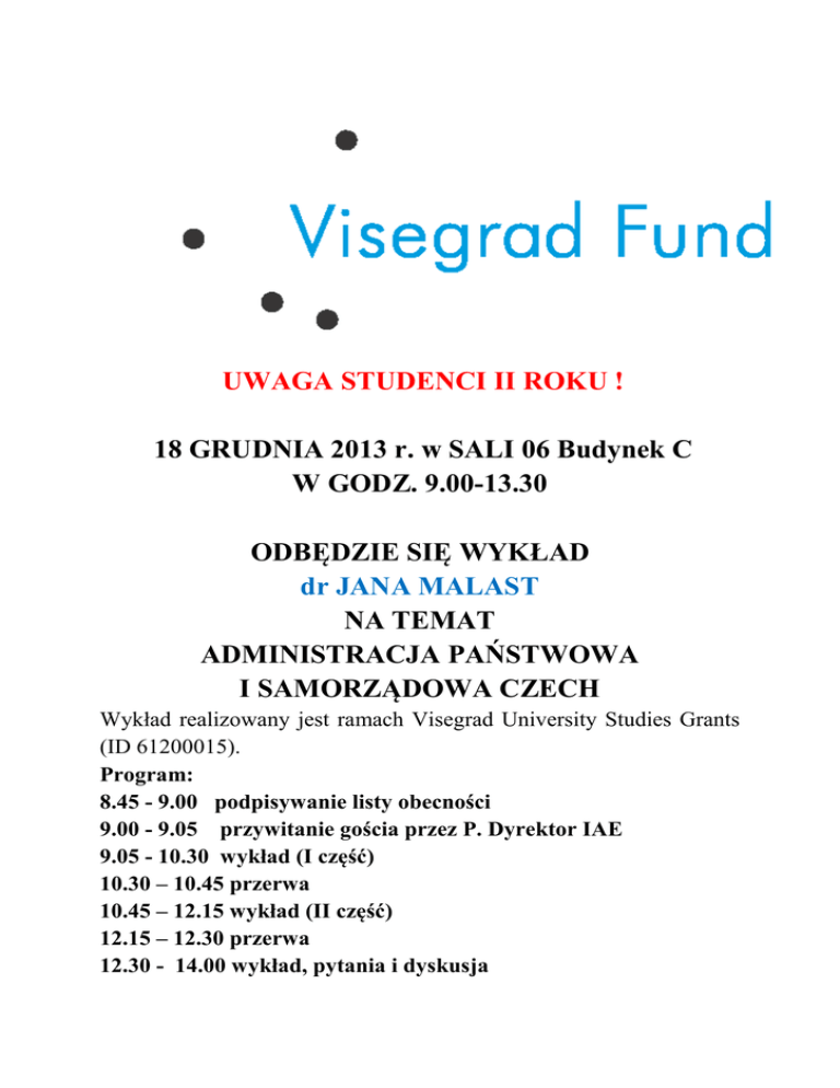 UWAGA STUDENCI II ROKU ! 18 GRUDNIA 2013 r. w SALI 06 Budynek C W GODZ. 9.00-13.30 ODBĘDZIE SIĘ WYKŁAD dr JANA MALAST NA TEMAT ADMINISTRACJA PAŃSTWOWA I SAMORZĄDOWA CZECH Wykład realizowany jest ramach Visegrad University Studies Grants (ID 61200015). Program: 8.45 - 9.00 podpisywanie listy obecności 9.00 - 9.05 przywitanie gościa przez P. Dyrektor IAE 9.05 - 10.30 wykład (I część) 10.30 – 10.45 przerwa 10.45 – 12.15 wykład (II część) 12.15 – 12.30 przerwa 12.30 - 14.00 wykład, pytania i dyskusja ZAPROSZENIE Państwowa Wyższa Szkoła Zawodowa w Tarnowie serdecznie zaprasza Pana dr JANA MALAST na wygłoszenie wykładu na temat Administracja państwowa i samorządowa Czech Wykład realizowany jest ramach Visegrad University Studies Grants (ID 61200015). Termin wykładu – 18 grudzień 2013 r. (9.00 – 12.00).